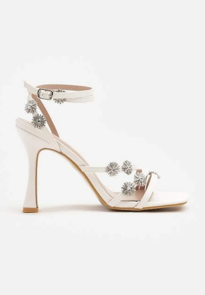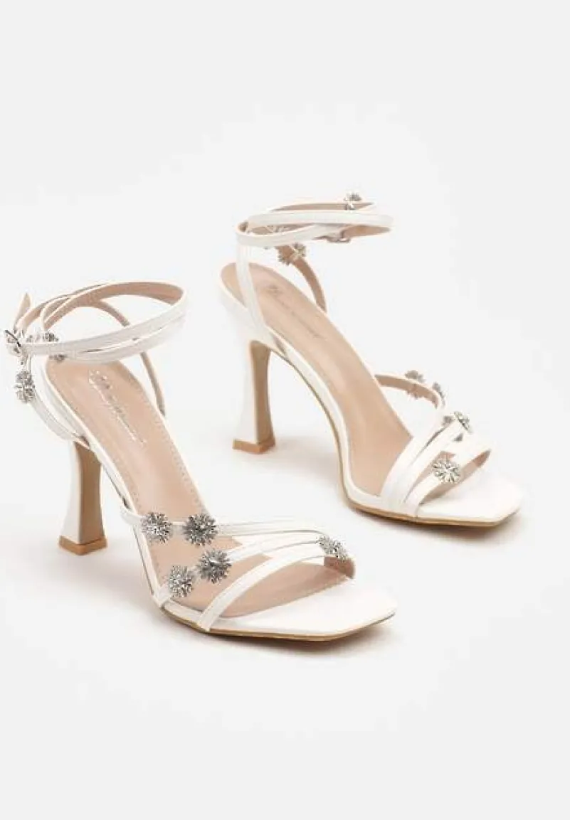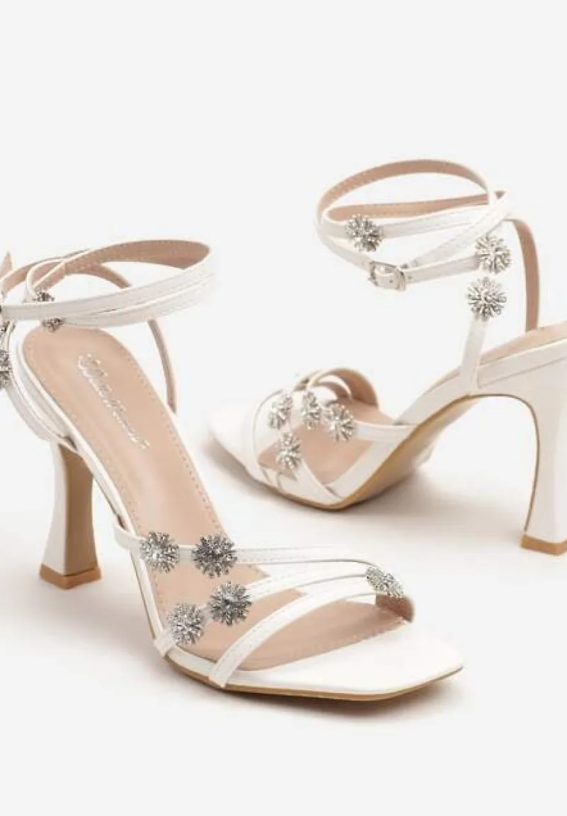 Białe Sandały na Szpilce Zdobione Paskami i Cyrkoniowymi Aplikacjami z Kwiatami Hanariel