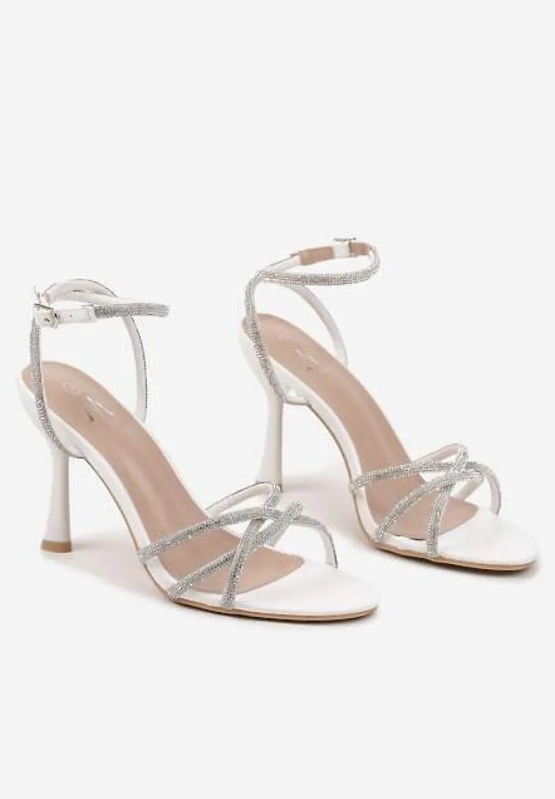 Białe Sandały Szpilki Ozdobione Cyrkoniami i Brokatem Setarlina