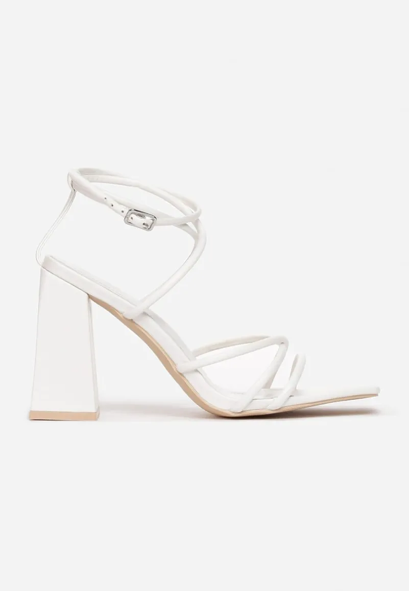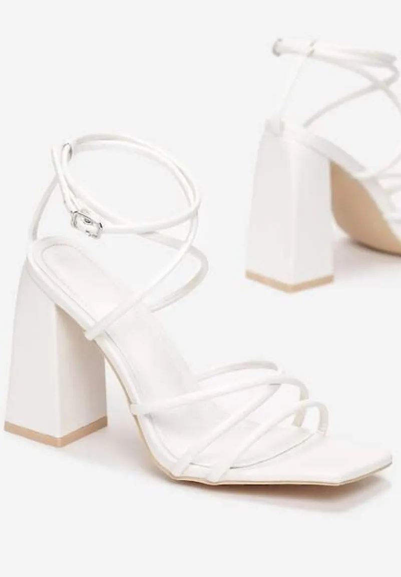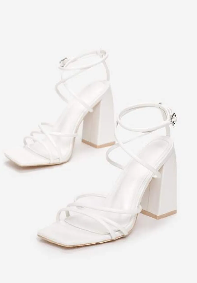 Sandały Thelxiereino na wysokim słupku o kwadratowej podstawie. Z wieloma cienkimi paseczkami wokół palców i kostki, które trzymają stopę. Zapinane na niewielką sprzączkę. Wykonane z ekoskóry. Doskonale podkreślą nogi muśnięte słońcem!