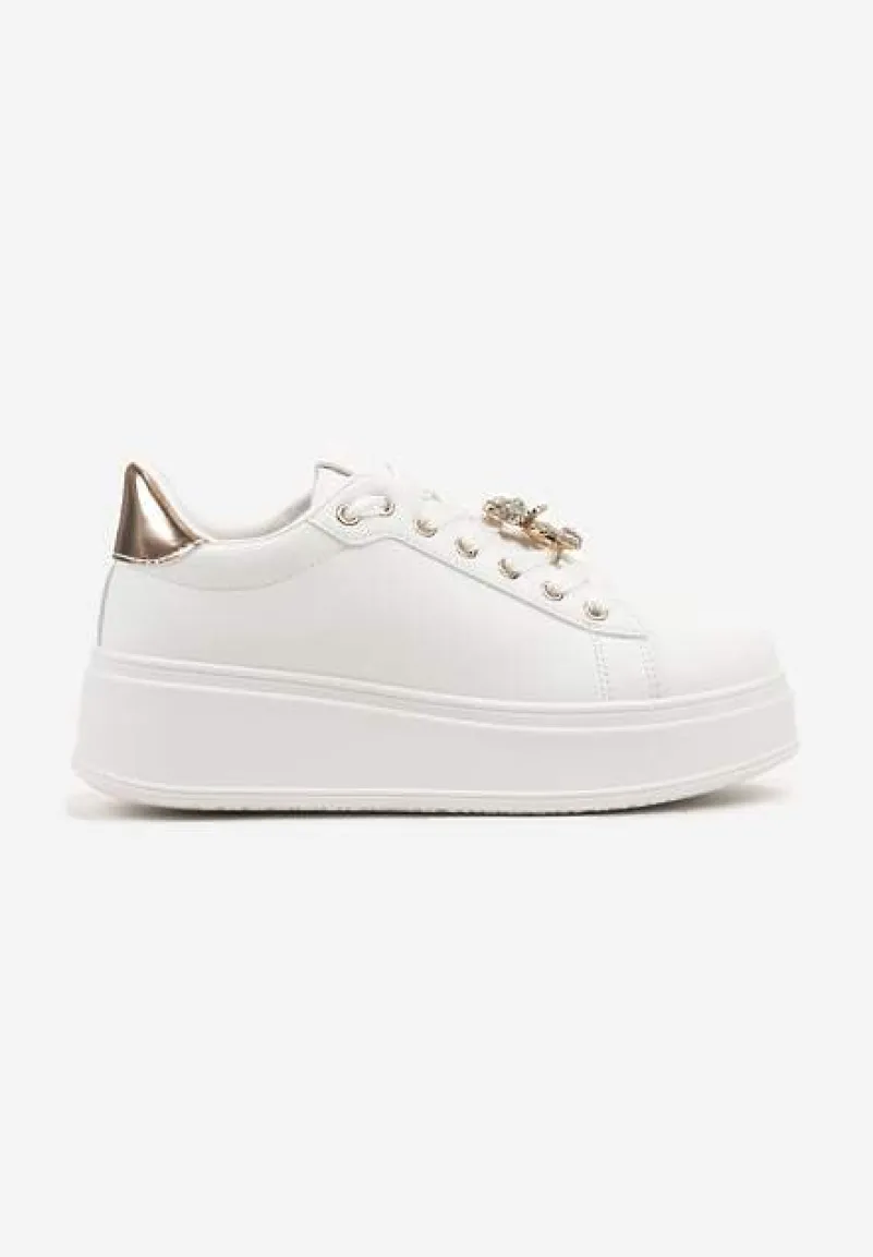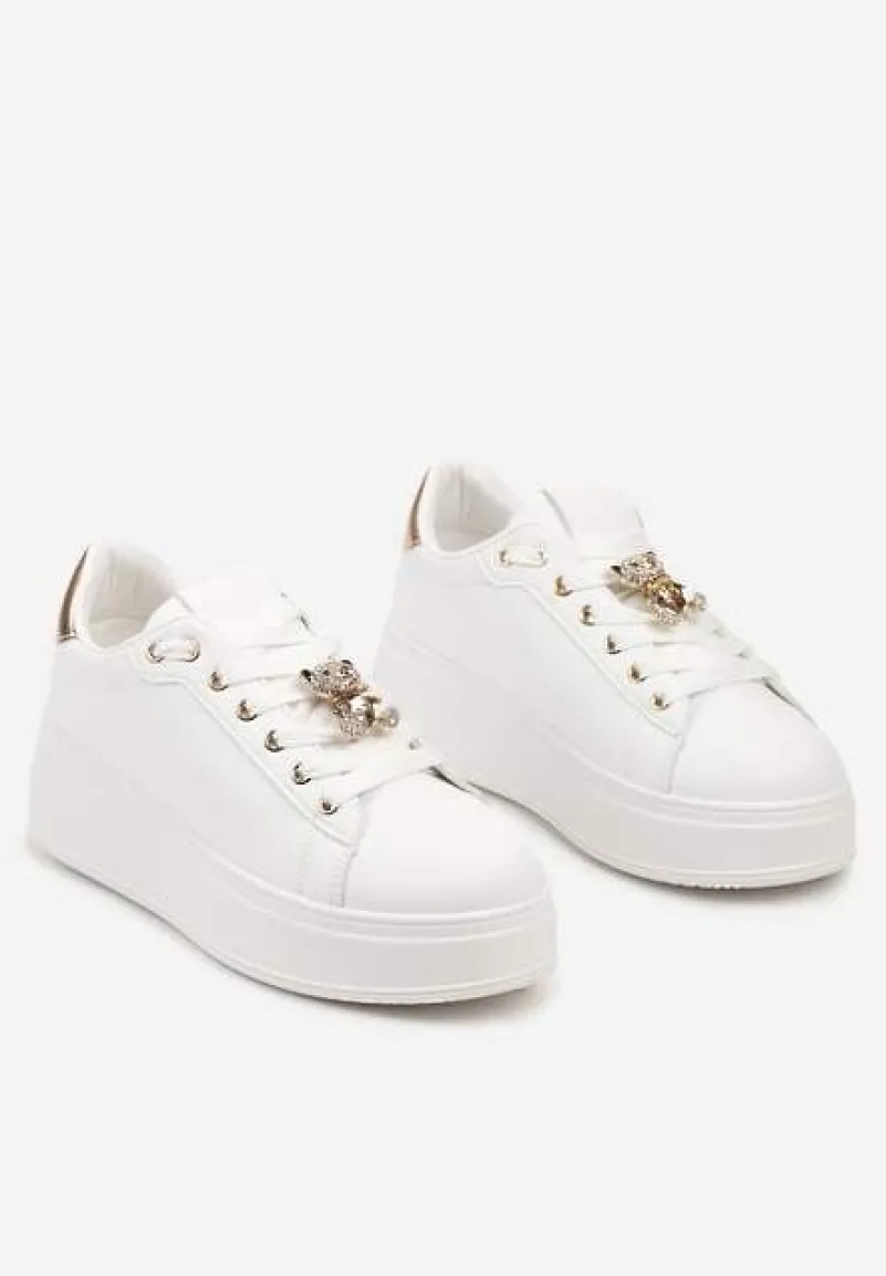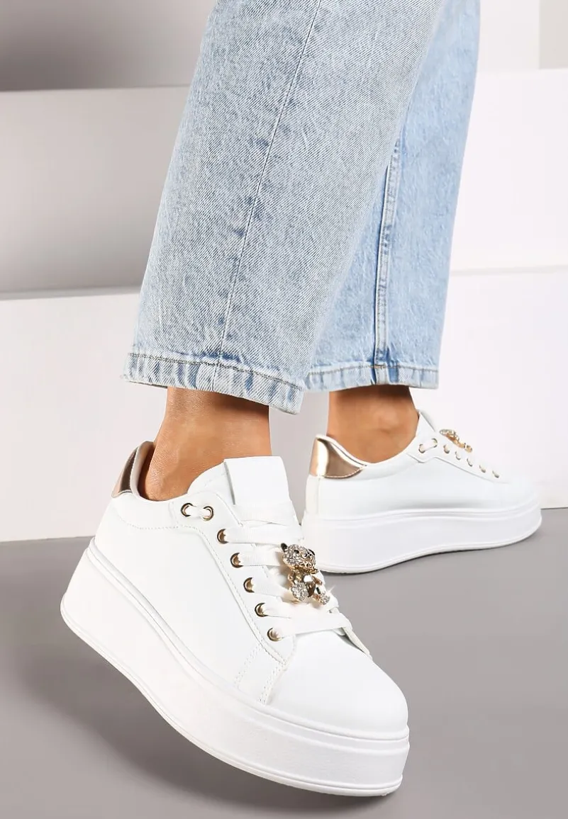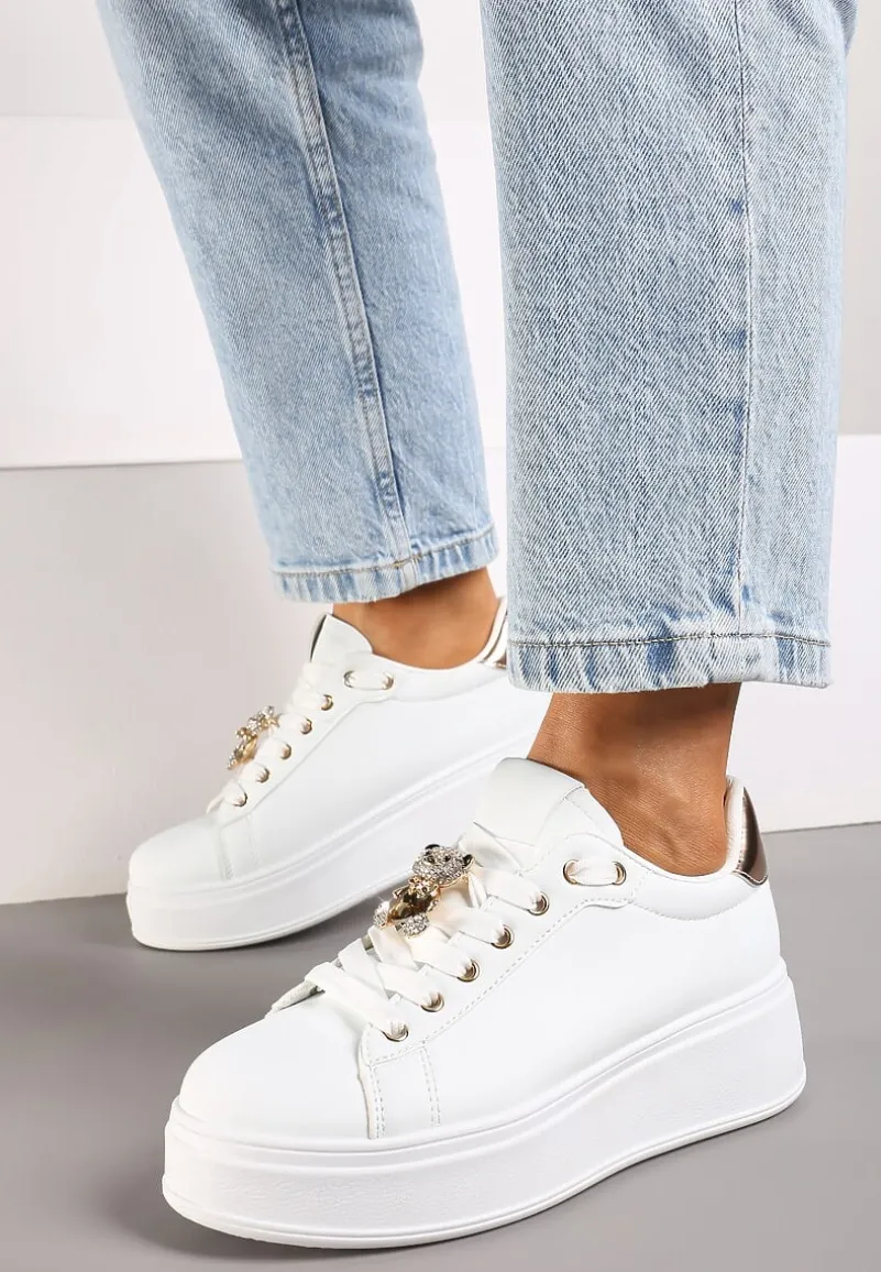 Sneakersy na Platformie Vlinea to kwintesencja miejskiego szyku! Model ten to znakomity wybór dla kobiet, które nade wszystko cenią sobie połączenie aktualnych trendów. Platforma zapewnia stabilizację. Okrągły nos i wygodne zapięcie na sznurówki to klasyka, która zawsze się sprawdza. Sneakersy świetnie wpiszą się w codzienny, casualowy look z jeansami i luźnym swetrem lub dodadzą sportowej elegancji zestawowi z plisowaną spódnicą i koszulą. Błyskotki w postaci aplikacji misia z cyrkonii staną się wyrazistym akcentem.