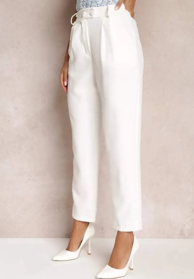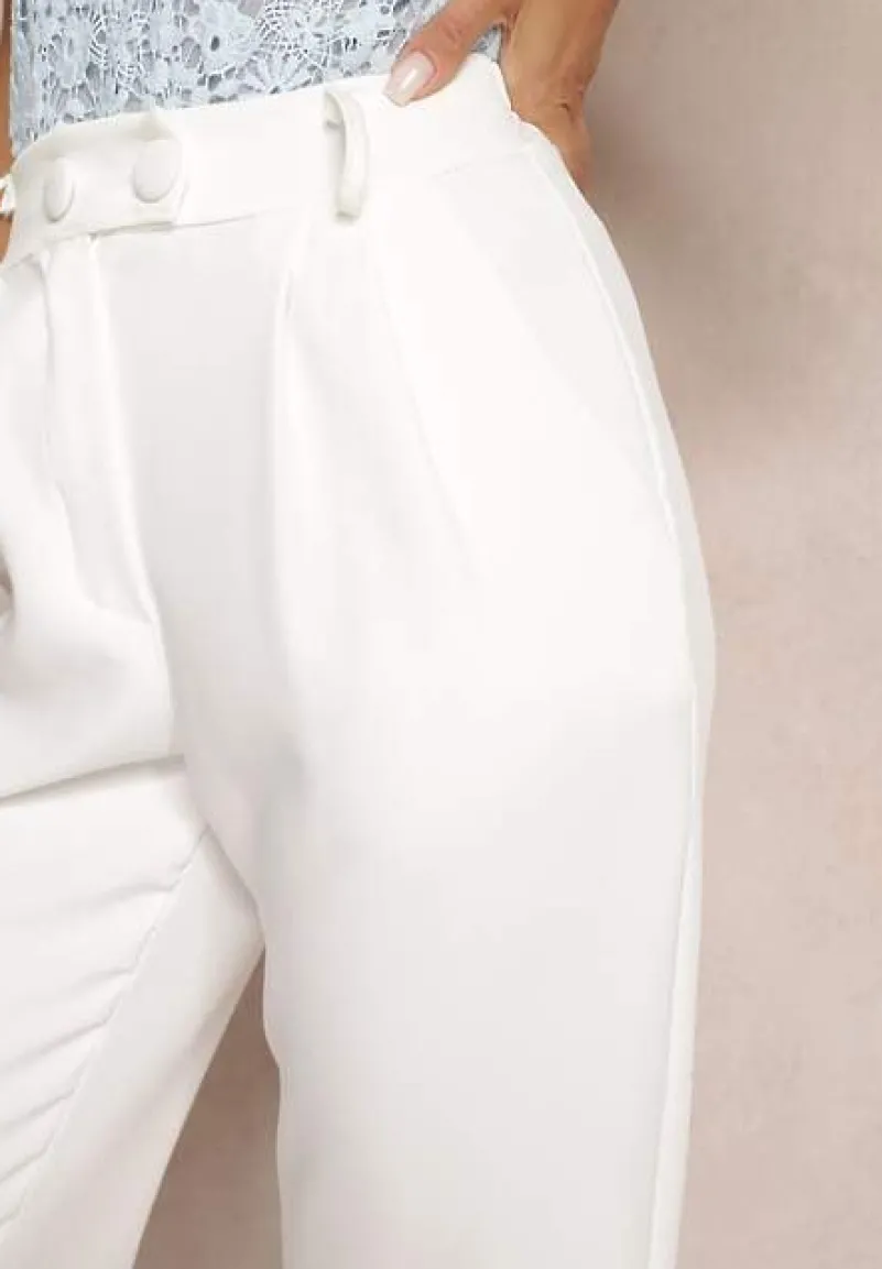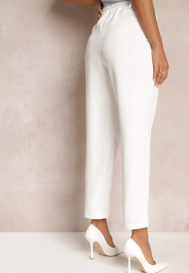 Spodnie z wszytą z tyłu gumką w pasie. Zapinane na dwa guziki i zamek błyskawiczny. Wsuwane kieszenie na wysokości bioder. Model w stylu cygaretek z wysokim stanem. Świetne do trampek i eleganckich szpilek.