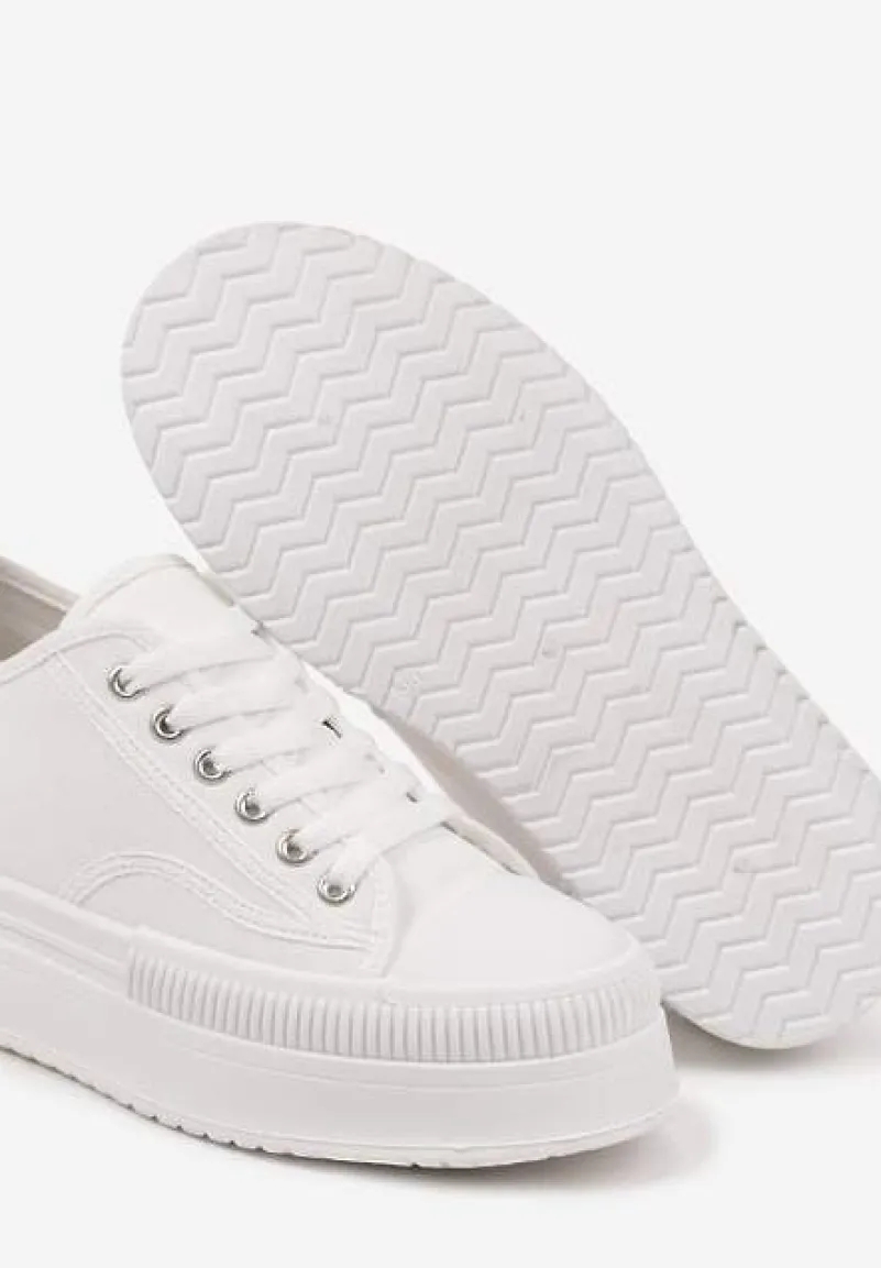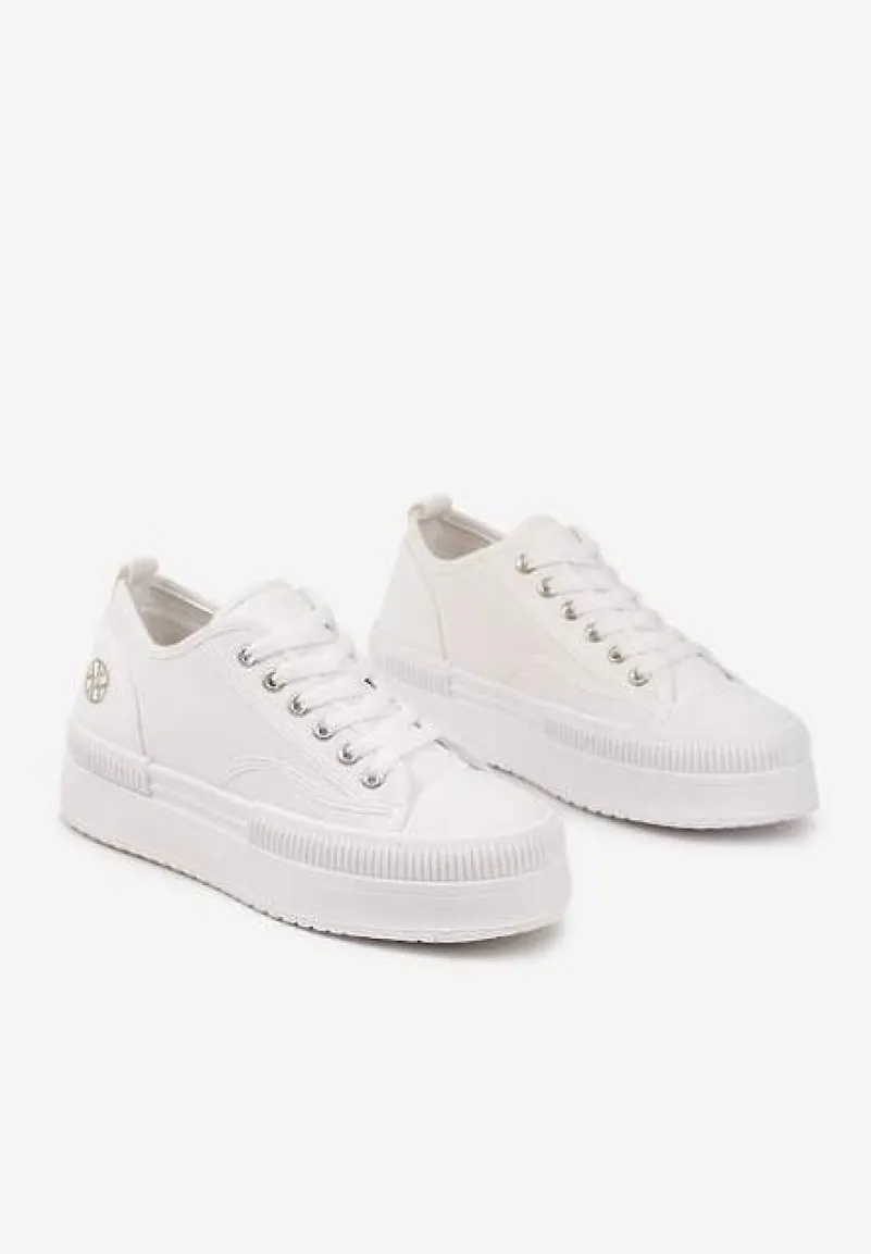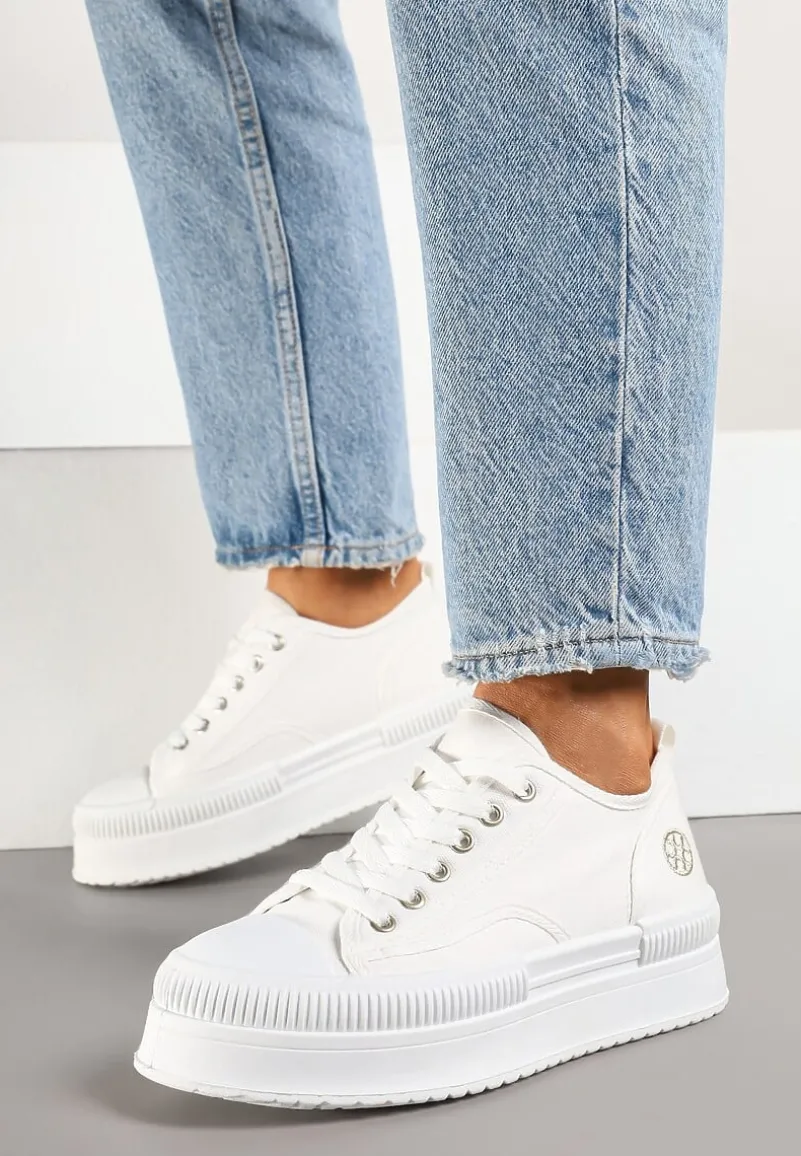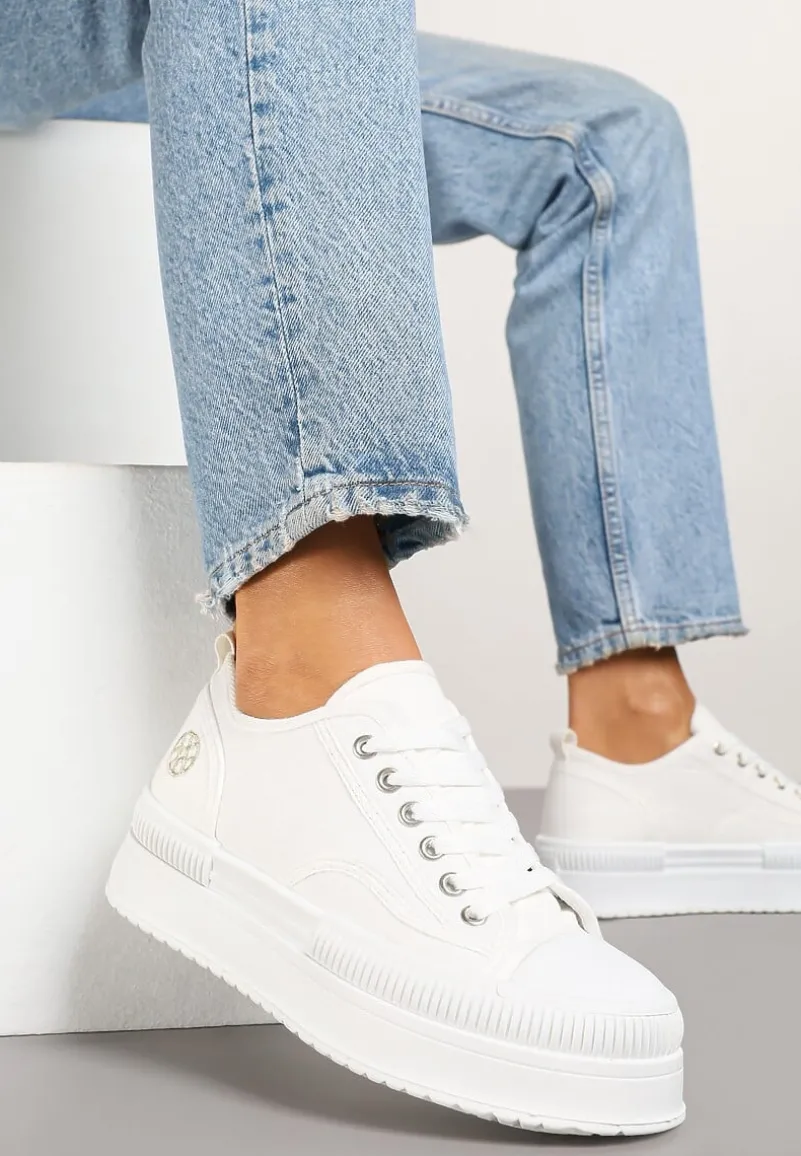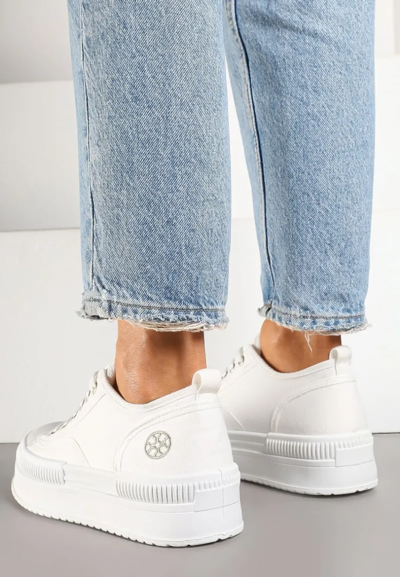 Trampki na Platformie z Metaliczną Ozdobą Afleeria to buty, które nadadzą Twoim stylizacjom unikalnego charakteru. Platforma dodaje kilku centymetrów wzrostu, dzięki czemu każda sylwetka zyskuje smukłość i pewność siebie. Stylowy, zaokrąglony nosek oraz praktyczne sznurowanie sprawiają, że te trampki to idealny wybór na co dzień. Możesz je zestawić z jeansową kurtką i krótką sukienką na wiosenne spacery.