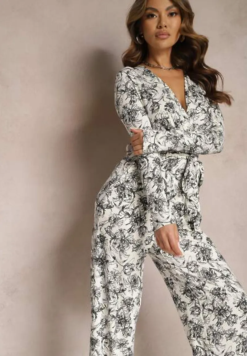 Biało-Czarny Długi Kombinezon z Kopertowym Dekoltem w Kwiatowy Wzór Erenna