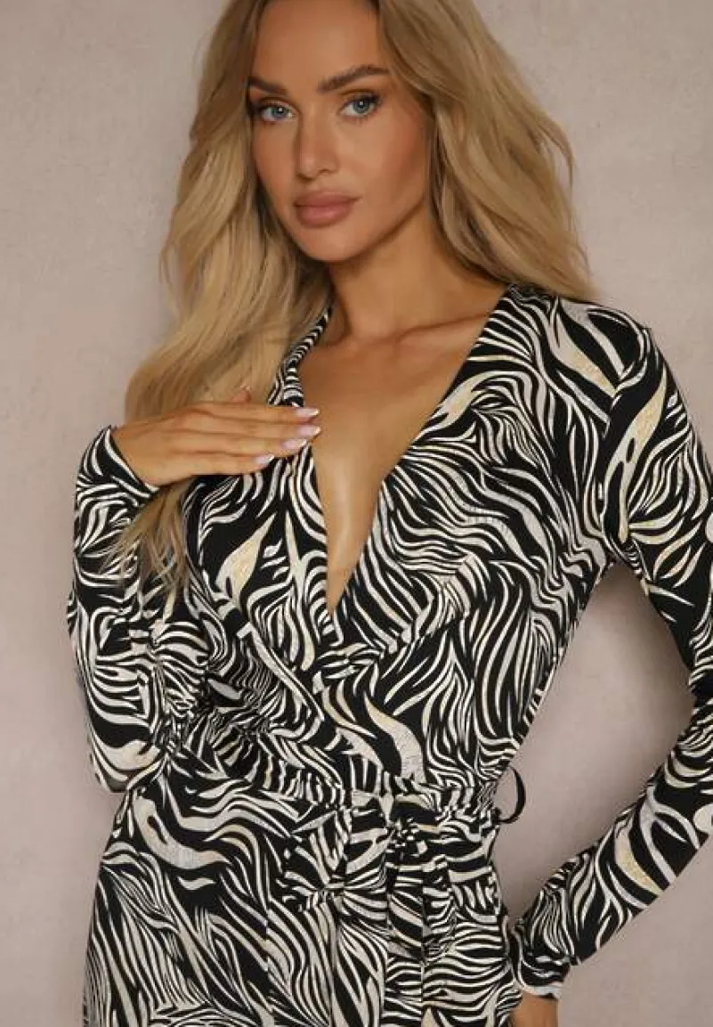Biało-Czarny Kombinezon Ozdobiony Wzorem w Tygrysie Paski Wiązany w Talii Sairise