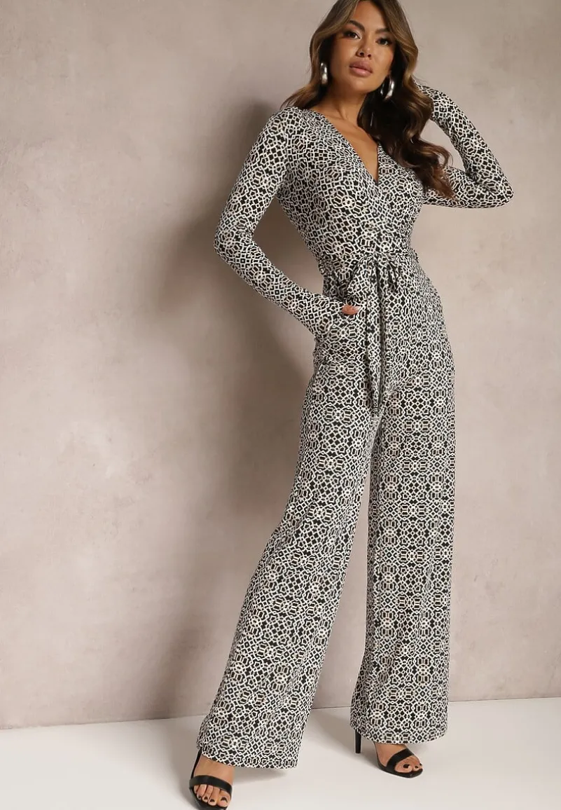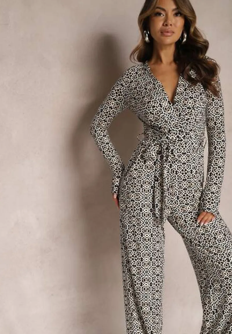 Biało-Czarny Kombinezon w Geometryczne Wzory z Szerokimi Nogawkami i Paskiem w Talii Soliti