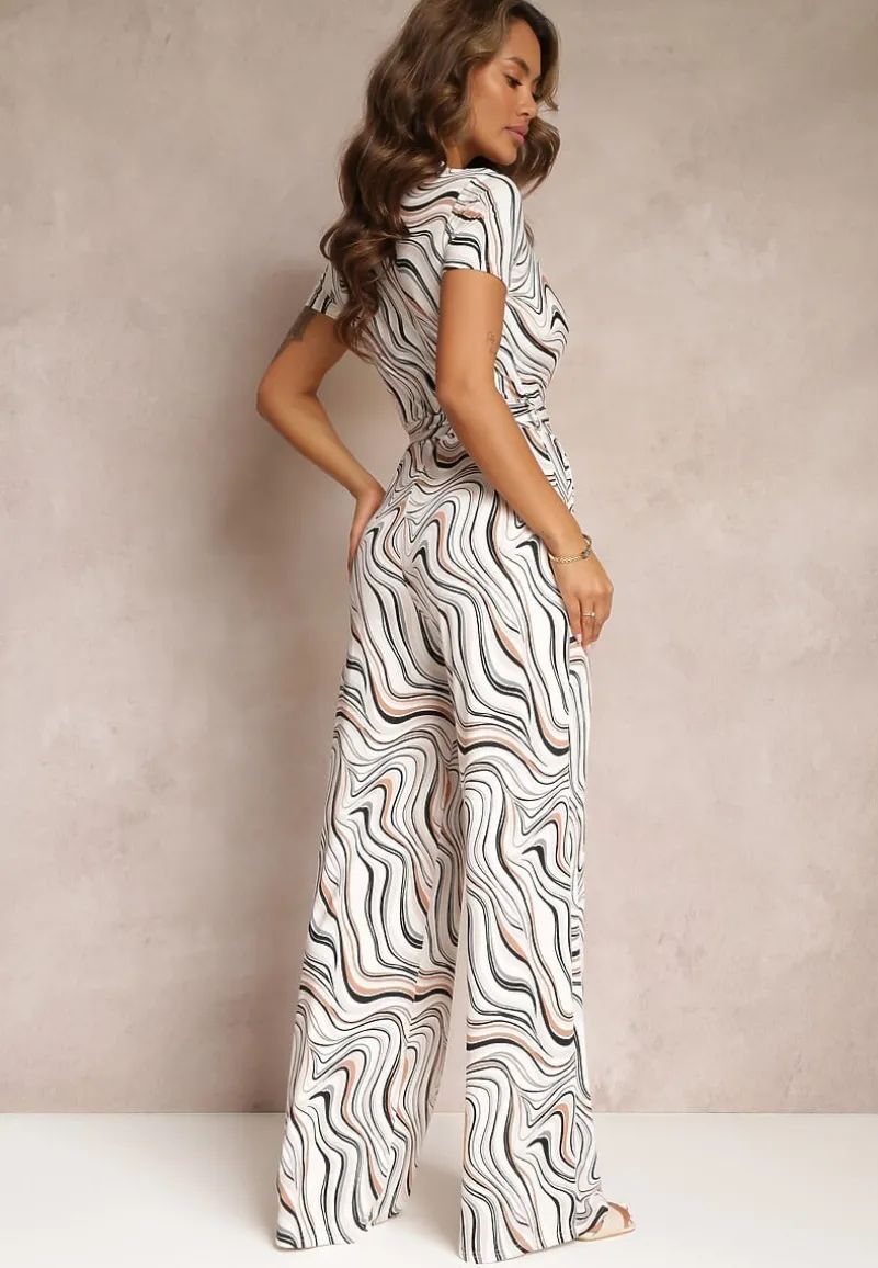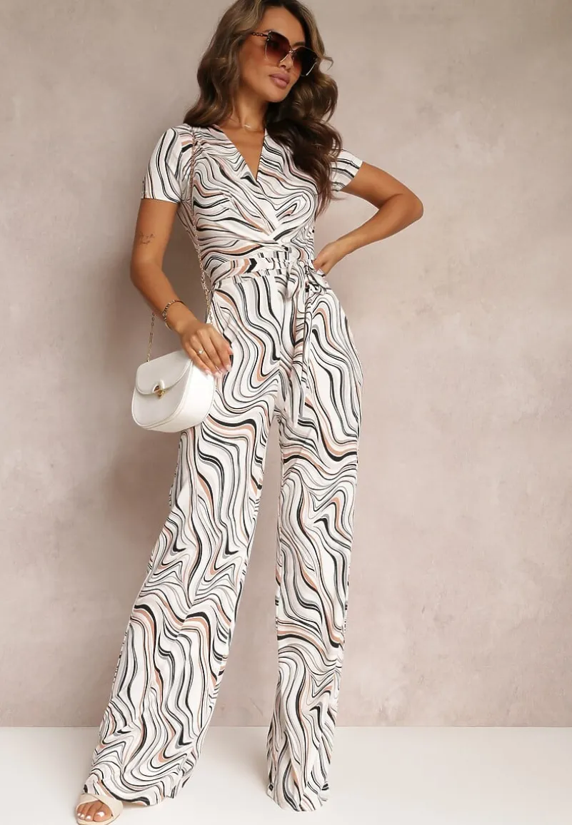 Ten wzorzysty kombinezon Zoeni to strzał w dziesiątkę na sezon wiosna/lato. Model z krótkimi rękawami, długimi nogawkami, głębokim dekoltem i materiałowym paskiem.