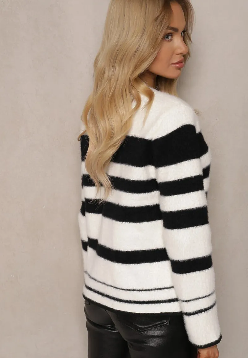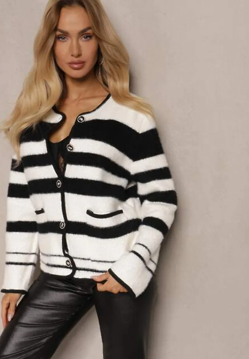Kardigan Aiwana z wiskozowej dzianiny w pasy. Zapinany na guziki, fason z wsuwanymi kieszeniami. To idealny kardigan do eleganckich stylizacji inspirowanych stylem old money.