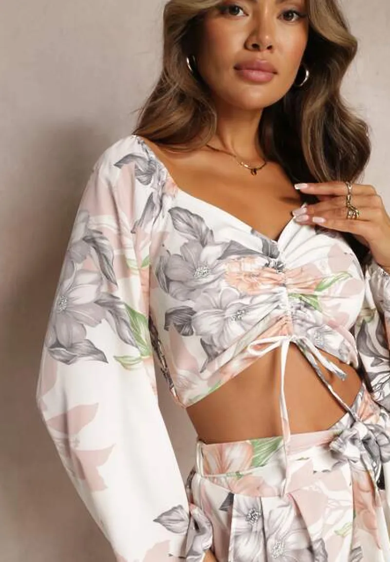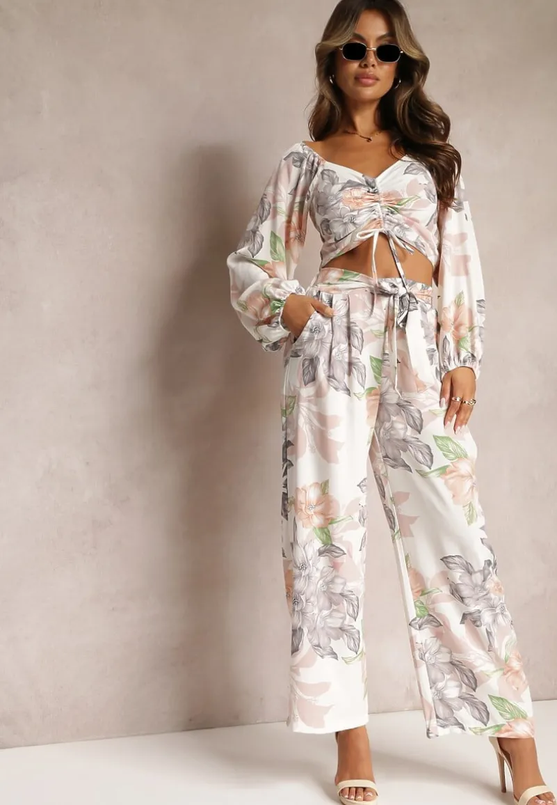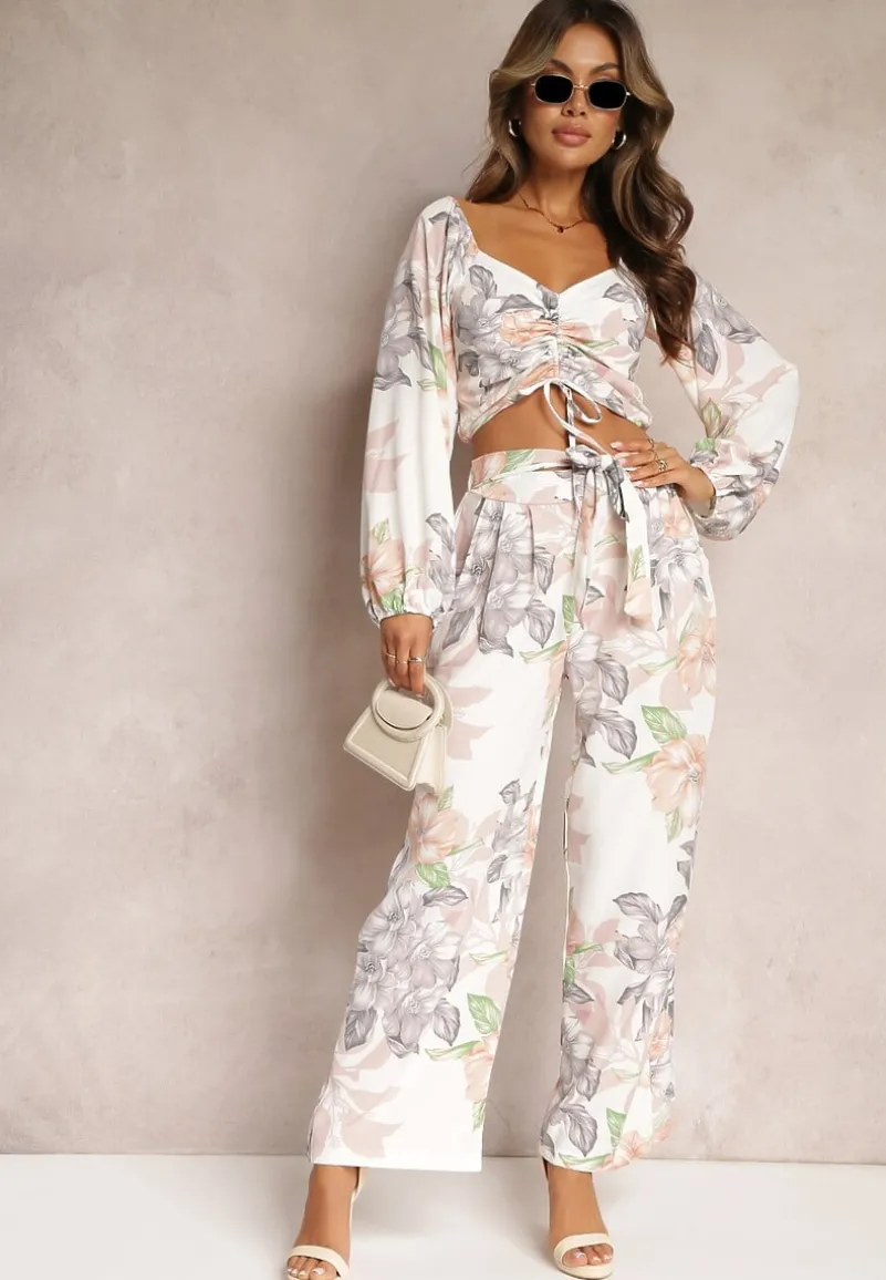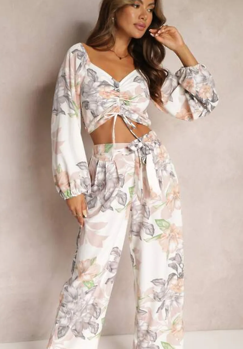 Komplet Calaq zdobiony w całości wzorem w kwiaty. Składa się ze spodni oraz bluzki, całość w casualowym stylu. Bluzka z łódkowym dekoltem i długim, bufiastym rękawem. Przy ramionach i nadgarstkach wszyte cienkie gumeczki, gumki także z tyłu bluzki. Przód bluzki ze sznurkami, przeciągniętymi przez tunel. Spodnie z długą, szeroką nogawką i wsuwanymi kieszeniami. W pasie gumka i dwa szerokie sznurki, imitujące materiałowy pasek. Elegancki komplet ze spodniami będzie doskonałym wyborem na koktajlowe przyjęcie.