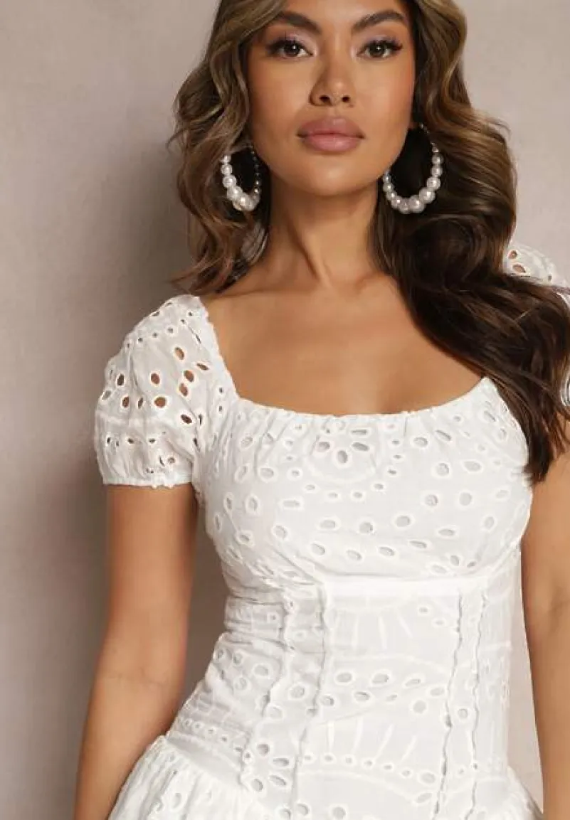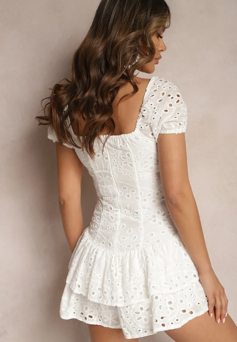 Biały Bawełniany Kombinezon Koronkowy z Krótkim Rękawem Wykończony Falbankami Casdaria