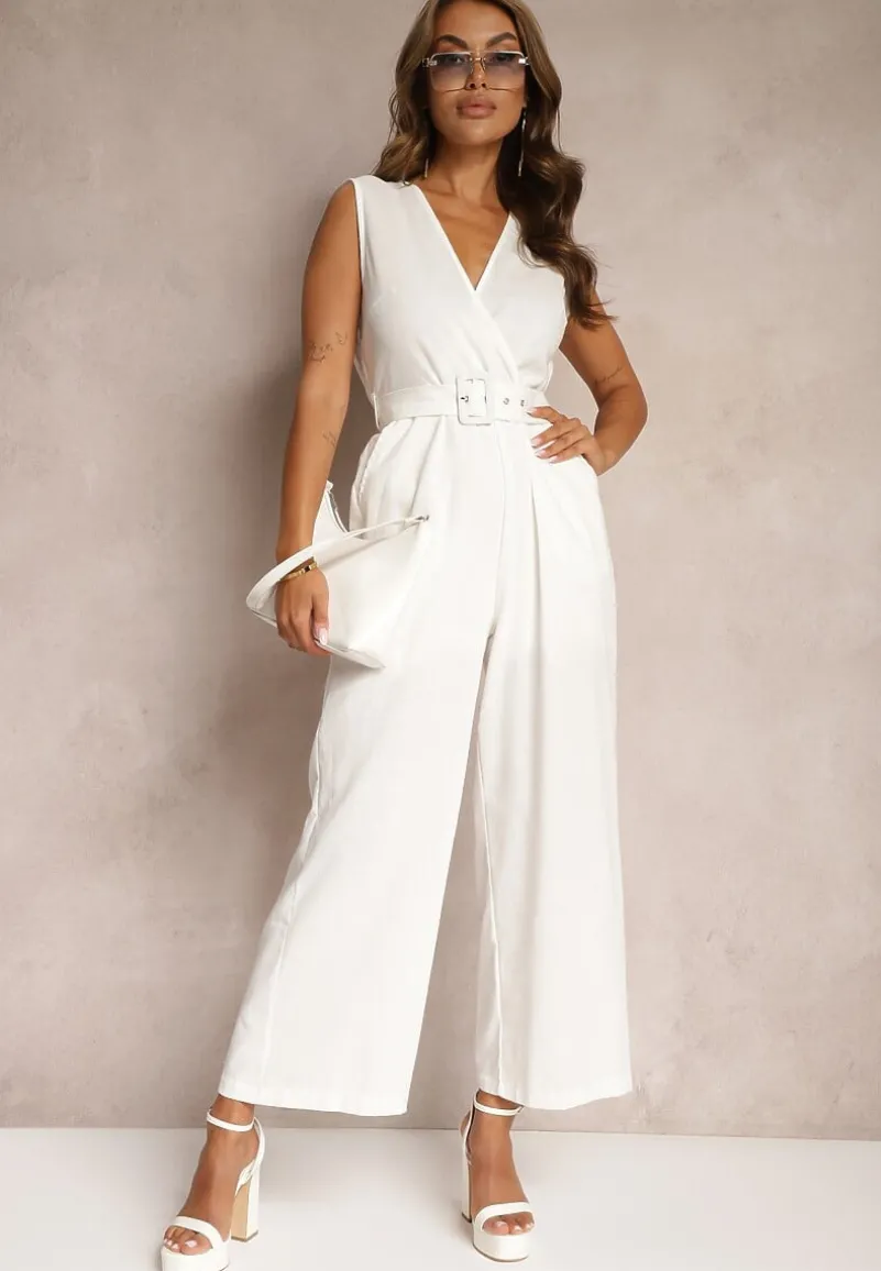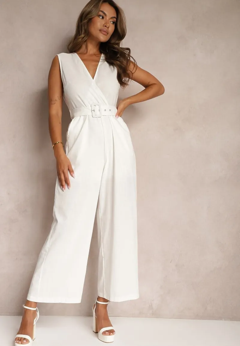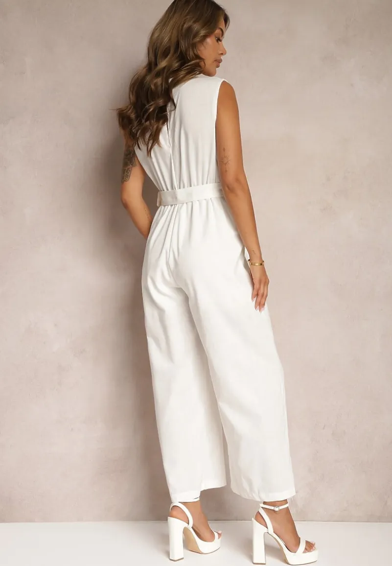 Biały Bawełniany Kombinezon z Kopertowym Dekoltem Paskiem z Klamrą i Gumką w Talii Risalen