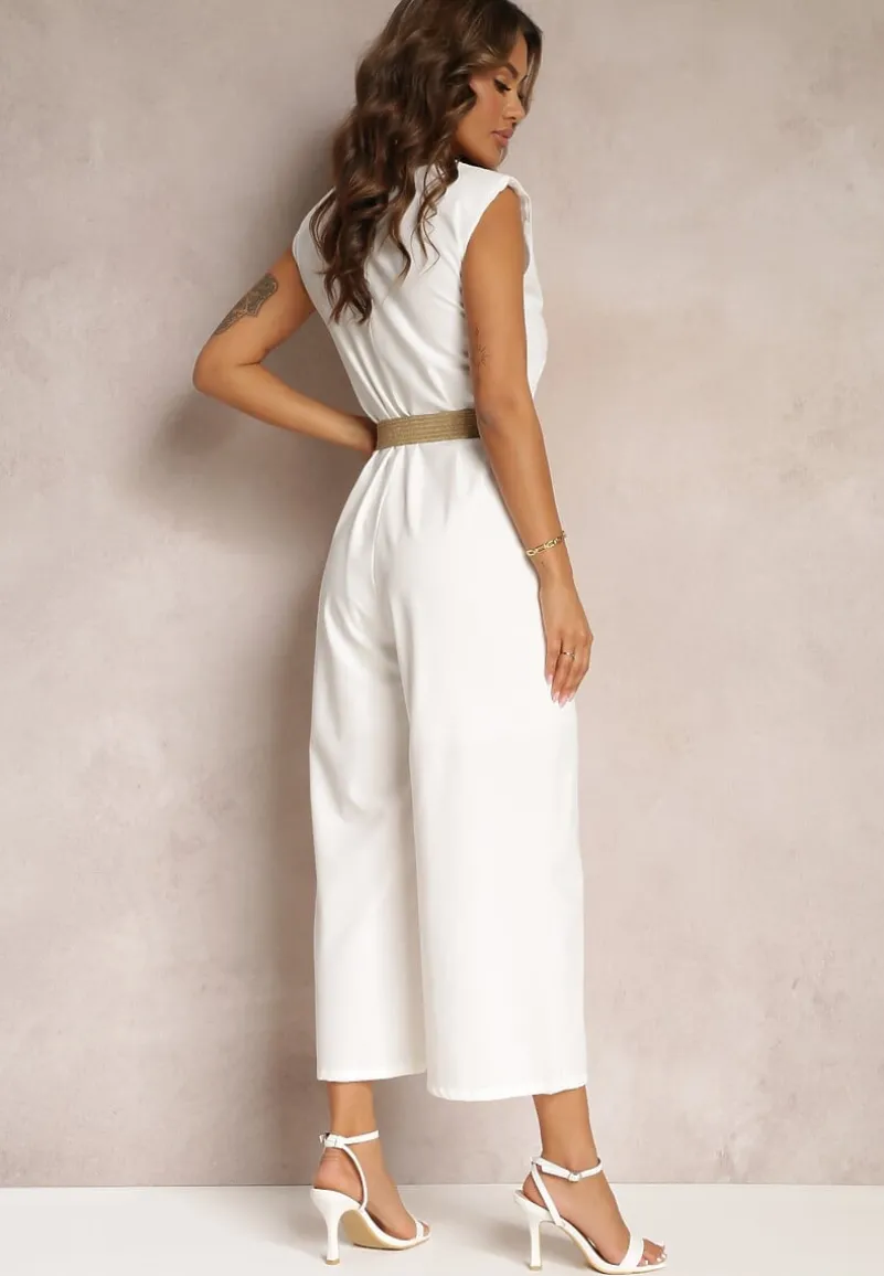 Biały Długi Kombinezon z Trójkątnym Dekoltem i Ozdobnym Paskiem z Klamrą Malkah