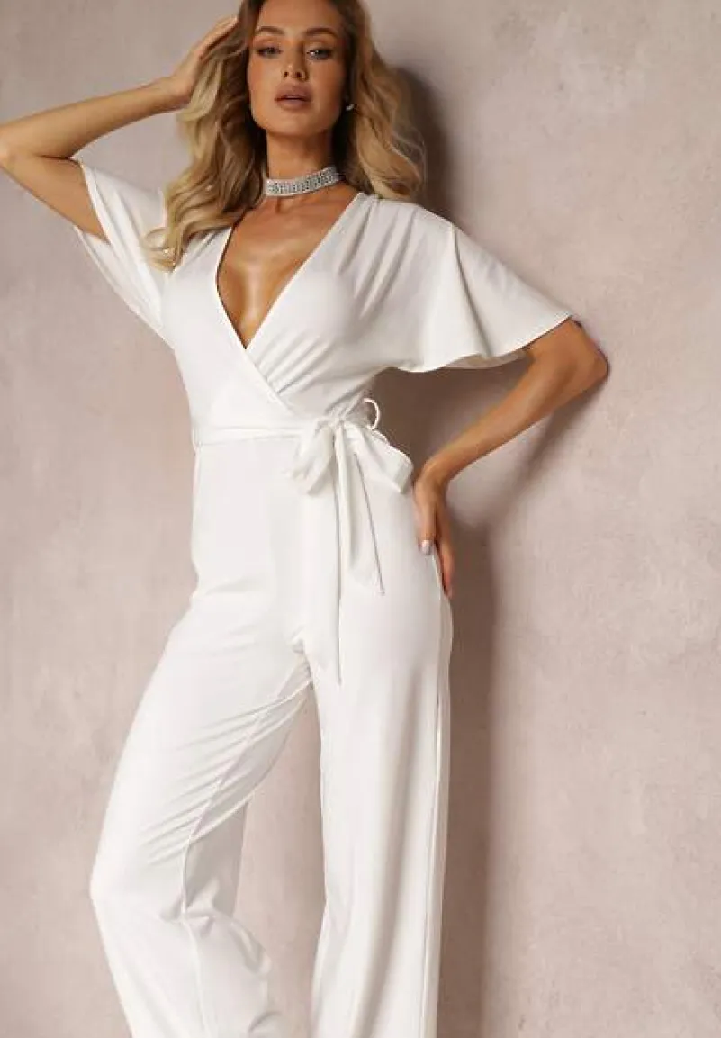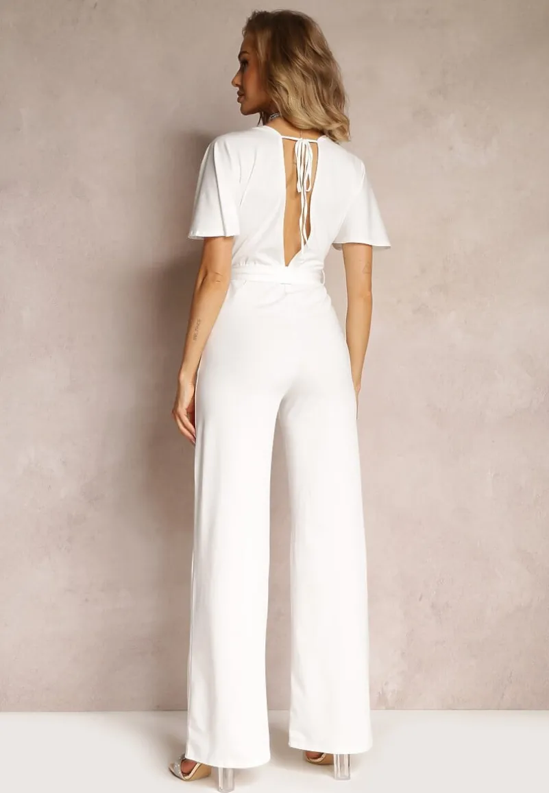 Biały Długi Kombinezon z Wiązaniem i Głębokim Kopertowym Dekoltem Sumya