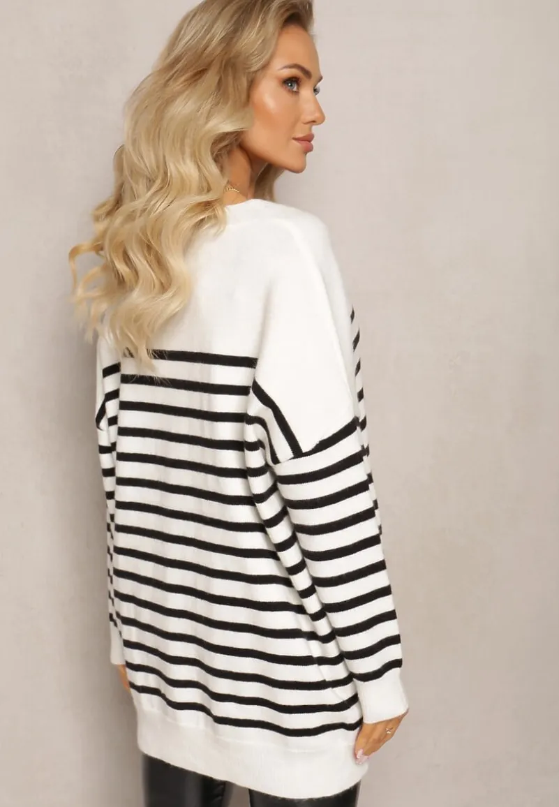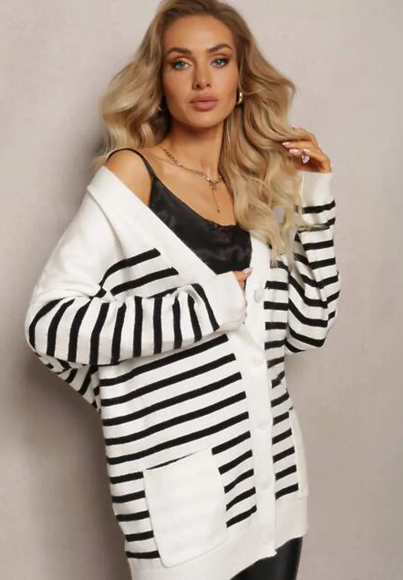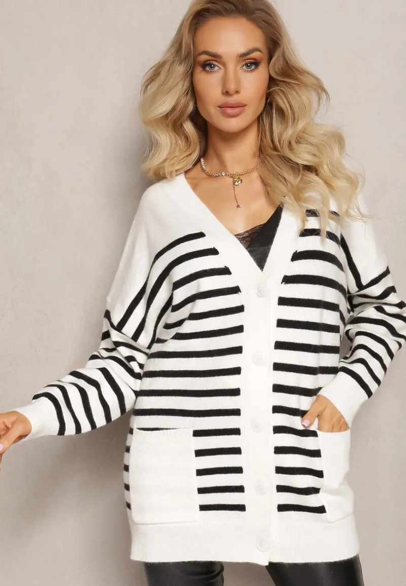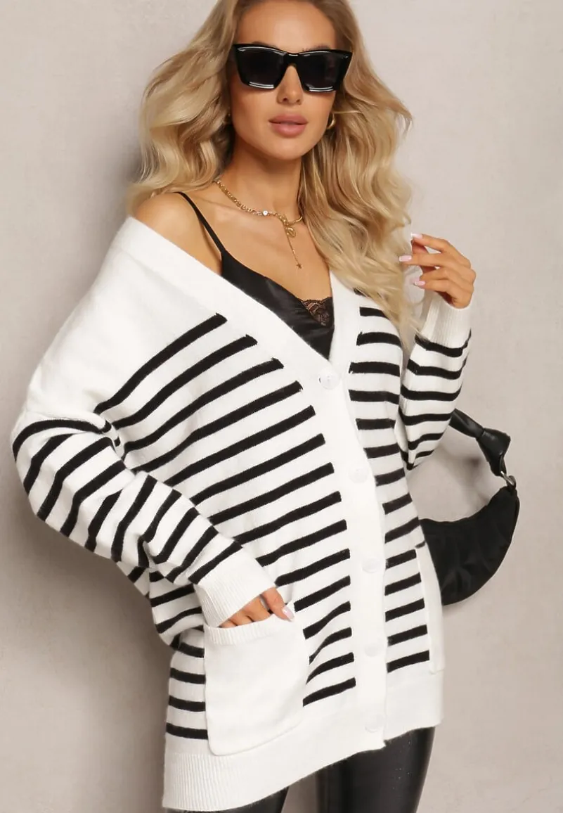 Kardigan Ravime w paski to kwintesencja nonszalancji połączonej z wygodą. Jego długie rękawy oraz luźny, wydłużony fason sprawiają, że będzie doskonałym wyborem na chłodniejsze dni. Głęboki dekolt w kształcie litery V idealnie wyeksponuje szyję i pozwoli na zabawę warstwami. Wyróżniający się oryginalnym wzorem, kardigan stanie się niebanalnym elementem stylizacji – zarówno w codziennym wykorzystaniu, jak i na wieczorne wyjścia.