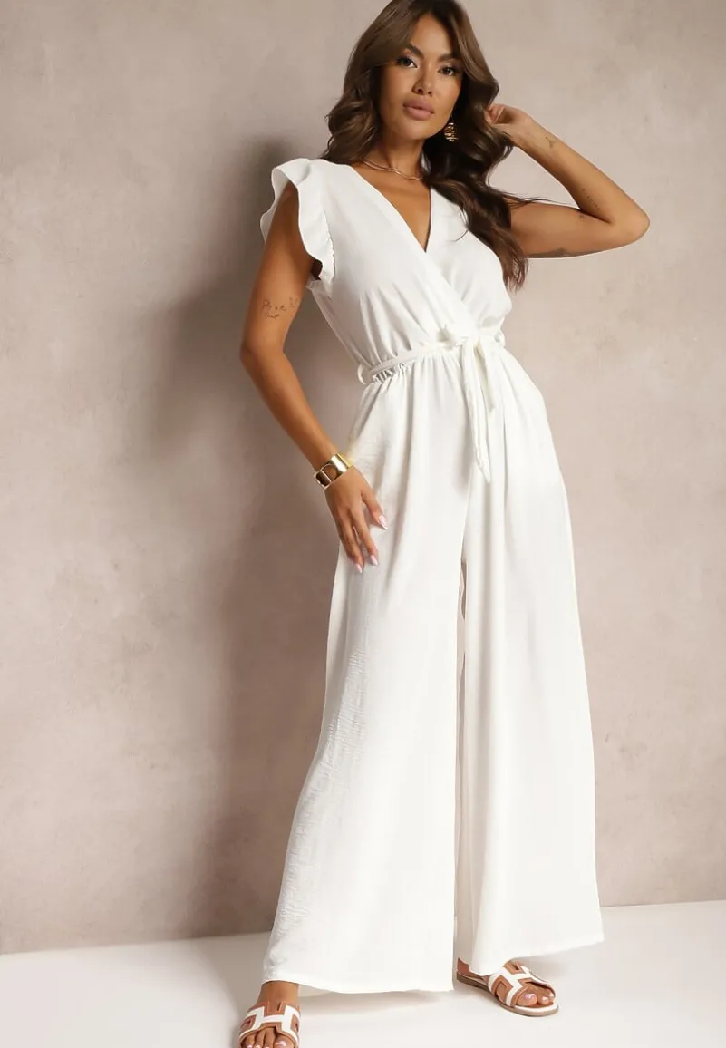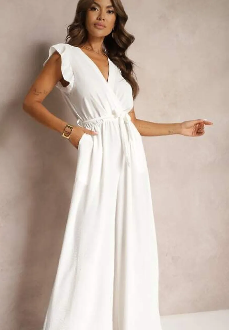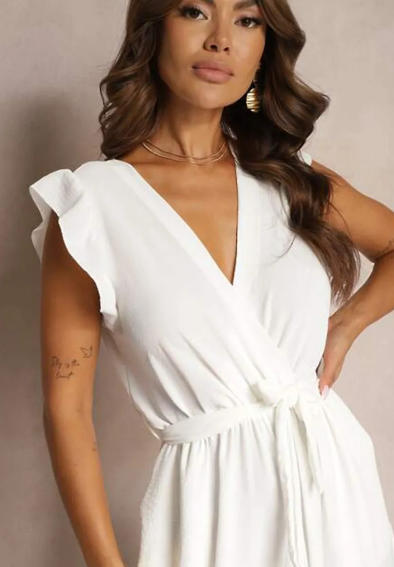 Biały Koktajlowy Kombinezon Wiązany Paskiem Wykończony Falbankami przy Ramionach Vimaseni