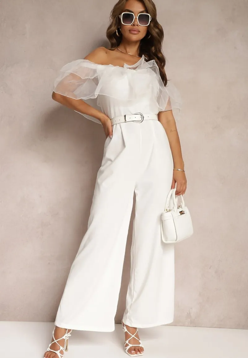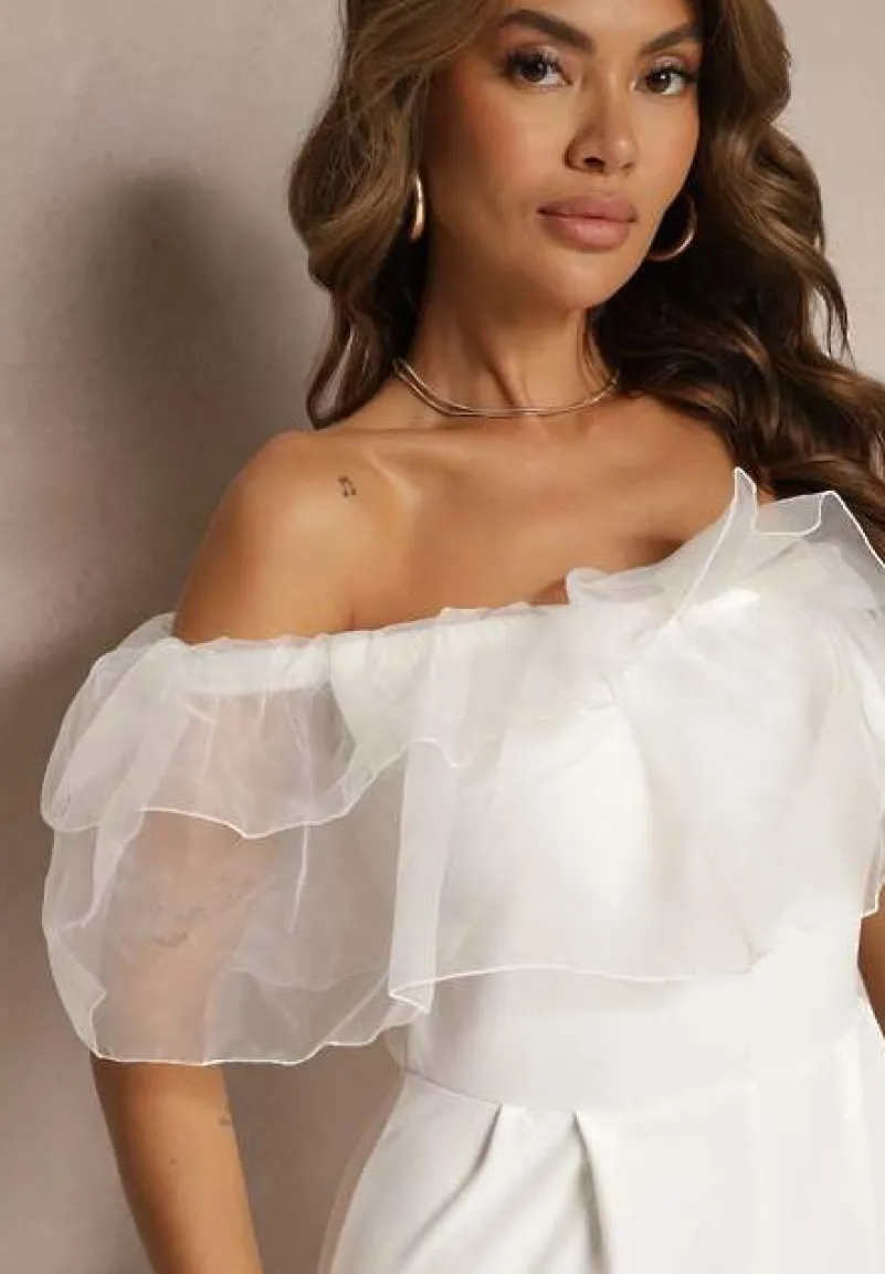 Biały Koktajlowy Kombinezon z Falbanką przy Dekolcie bez Rękawów Tessita