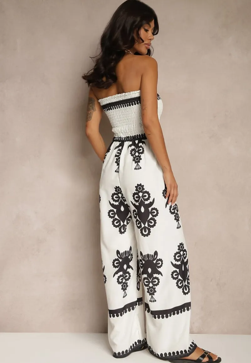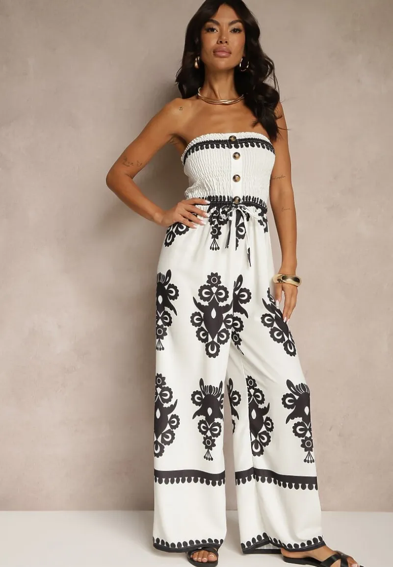 Biały Kombinezon Bandeau Ozdobiony Ornamentnym Motywem i Guzikami Liravessa