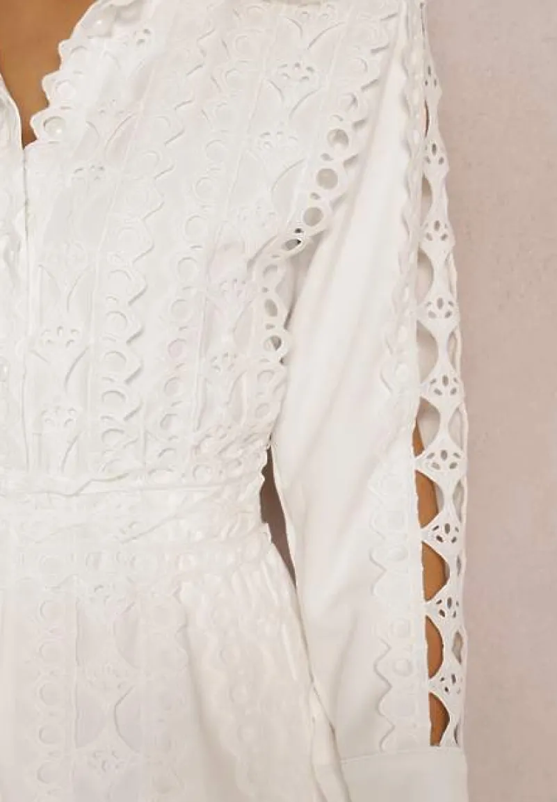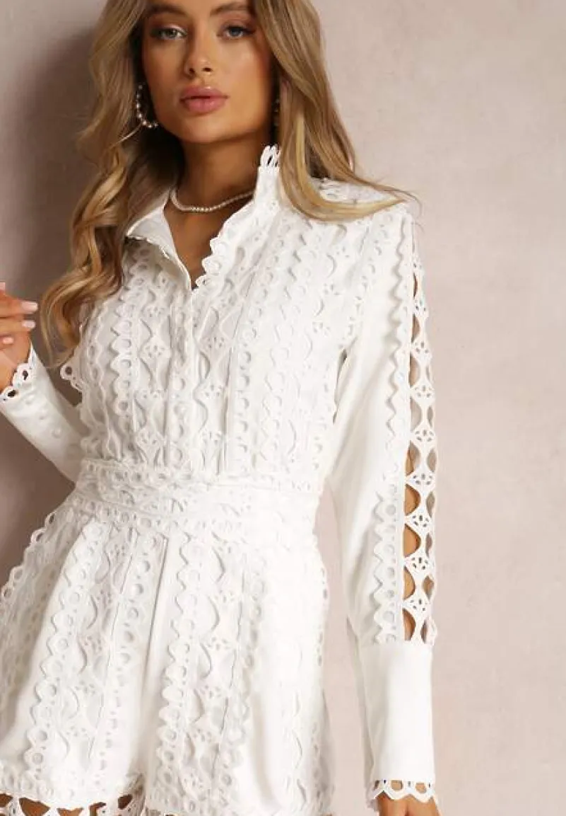Kombinezon Edouard w pięknym, ażurowym wydaniu. Ażurowa tasiemka z wycięciami zdobi cały przód, a także krawędzie nogawek, rękawy i stójkę. Z przodu zapinany na perłowe guziki do linii talii, dzięki czemu możesz regulować głębokość dekoltu. Krótka nogawka, długi rękaw z szerokim mankietem na guzik. Zamek błyskawiczny z tyłu, który ułatwi zakładanie. Elegancki kombinezon na lato z ażurowymi zdobieniami to hit sezonu!