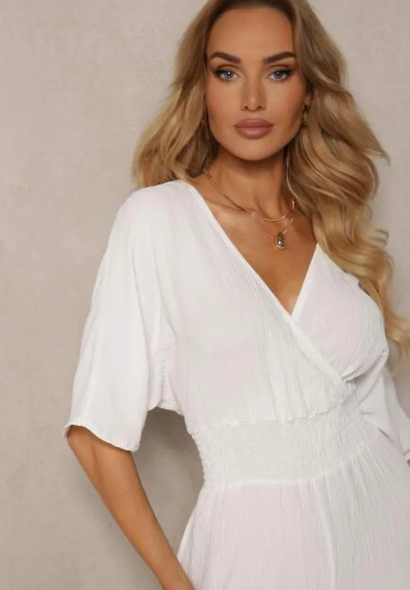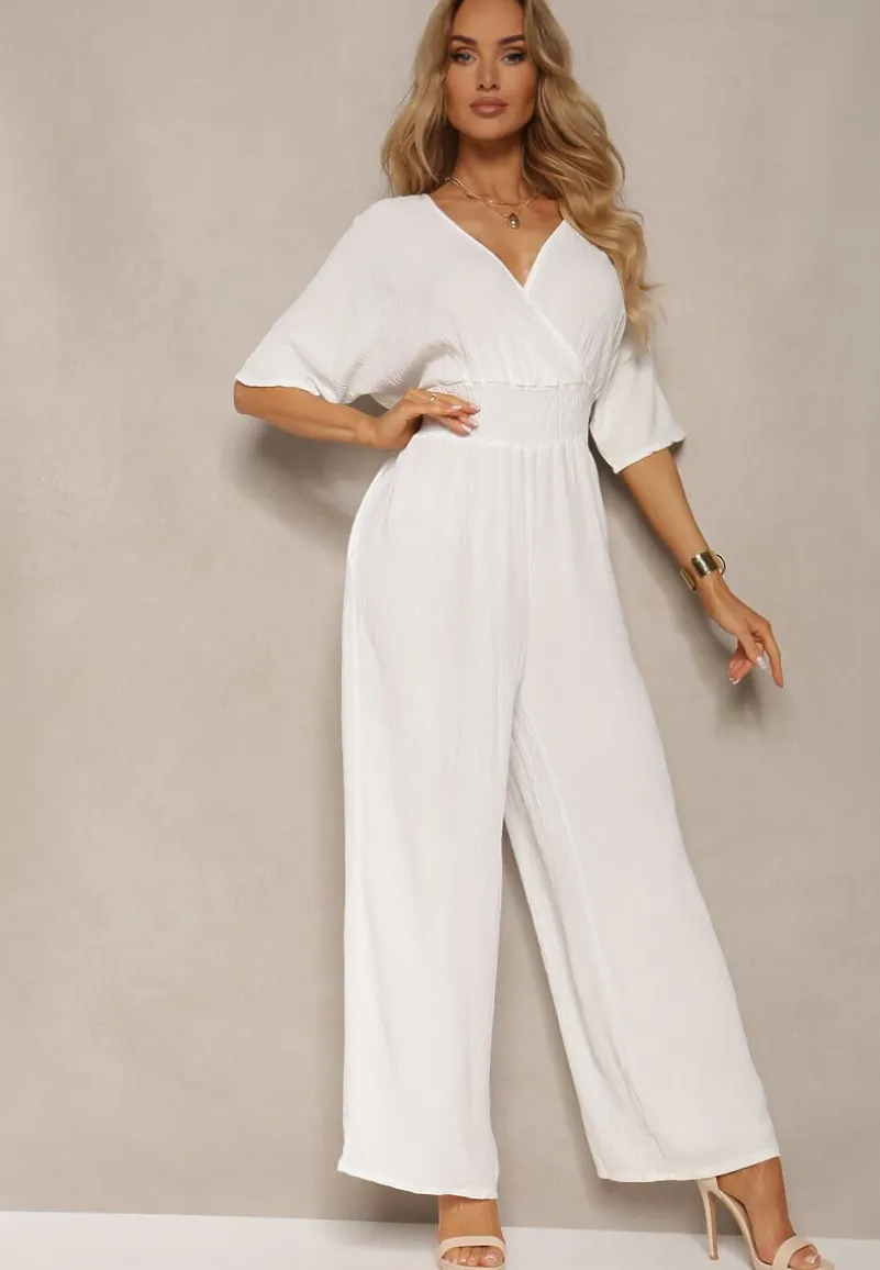 Biały Kombinezon o Kopertowym Fasonie z Szerokim Luźnym Dołem i Kieszeniami Octoni