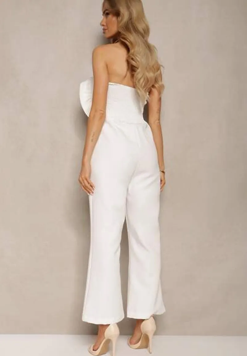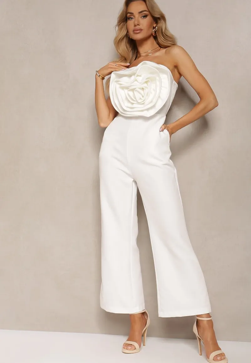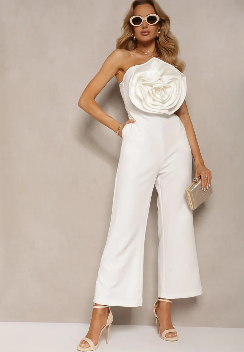 Biały Kombinezon z Dużym Naszytym Kwiatem bez Rękawów Usemia