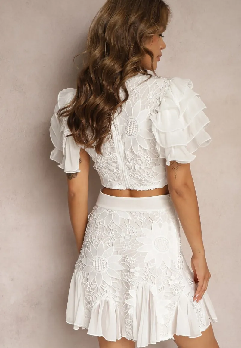 Komplet Vikleian to synonim kobiecej elegancji, który podkreśli Twoje naturalne piękno w każdej sytuacji. Krótka bluzka z ozdobnymi falbankami idealnie współgra z rozkloszowaną spódnicą, tworząc dziewczęcy, ale zarazem wyrafinowany look. Zastosowany materiał gwarantuje komfort noszenia dzięki swojej rozciągliwości oraz przystosowaniu do różnych sezonów. Linia kompletu delikatnie podkreśla talię, eksponując atuty sylwetki, a subtelne zdobienia dodają całej stylizacji wyjątkowego charakteru.