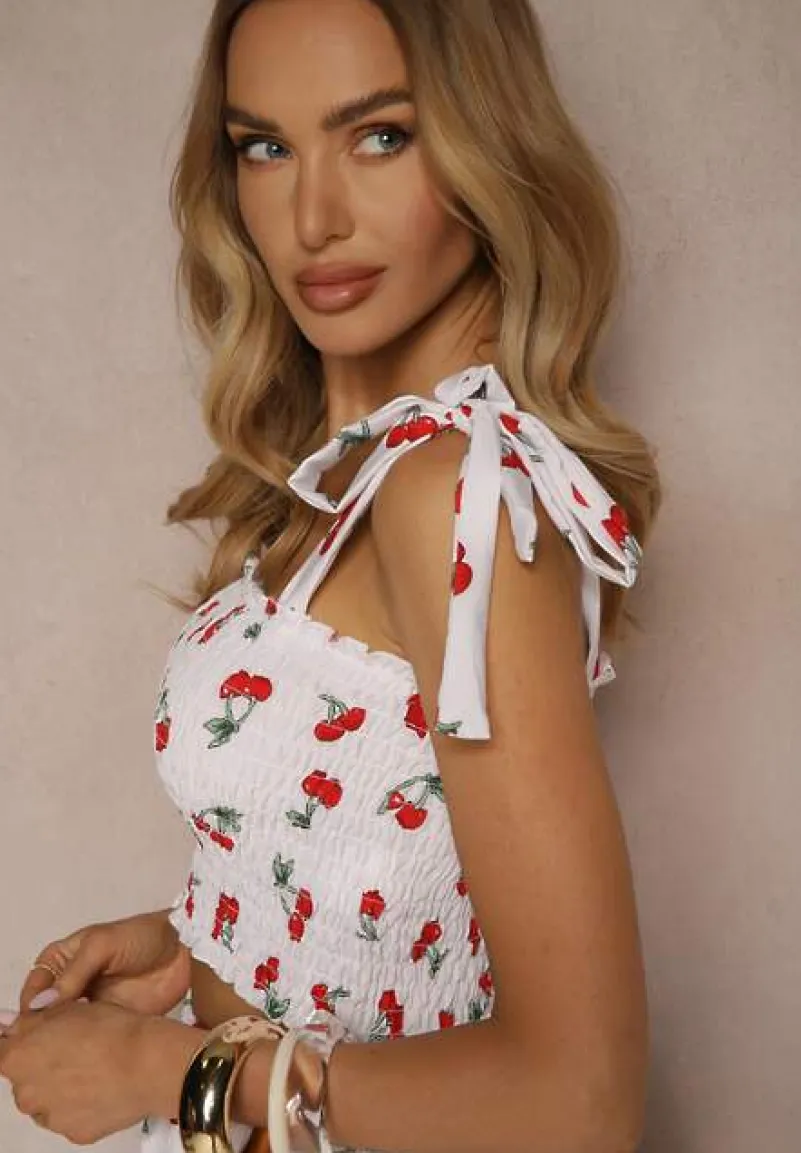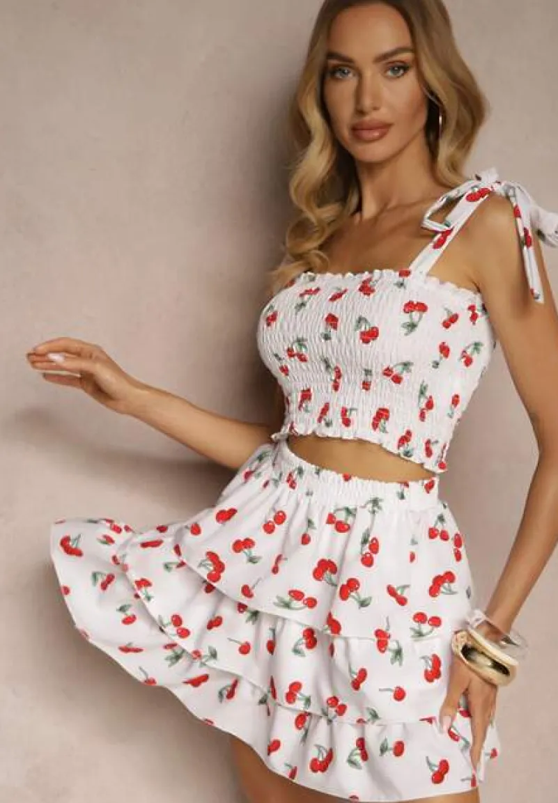 Komplet Talitora to doskonała propozycja dla kobiet, które cenią modową nonszalancję i najnowsze trendy. Dopasowany fason topu z uroczymi kokardkami przy wiązanych ramiączkach w połączeniu ze spódnicą z falbankami tworzy kompozycję pełną wdzięku. Całość zdobi wyjątkowy print z wisienki, dzięki czemu zestaw sprawdzi się idealnie na każdą okazję. Na co dzień zestaw go z sandałami na płaskiej podeszwie i torebką na ramię, a na wieczorne wyjście dodaj szpilki i subtelną biżuterię.