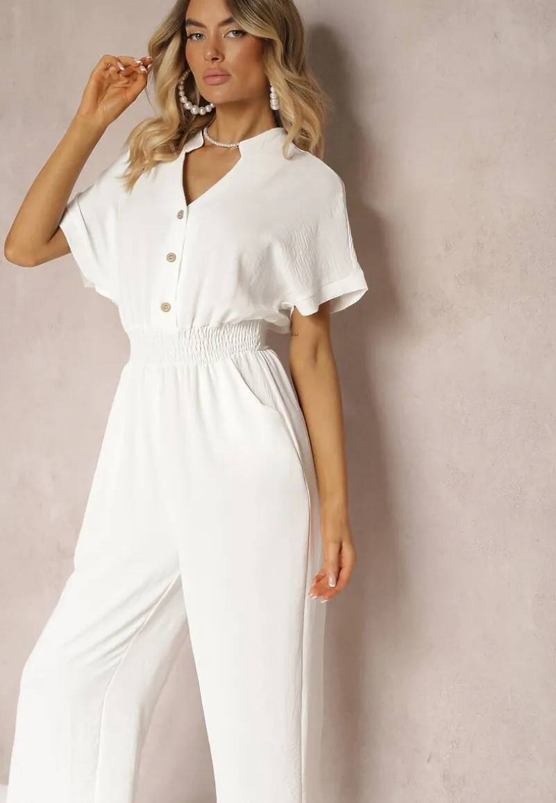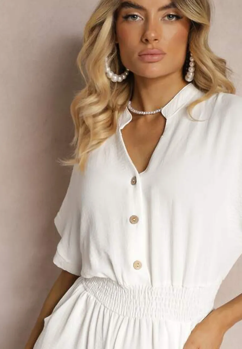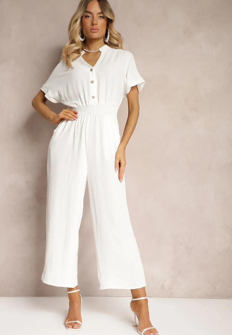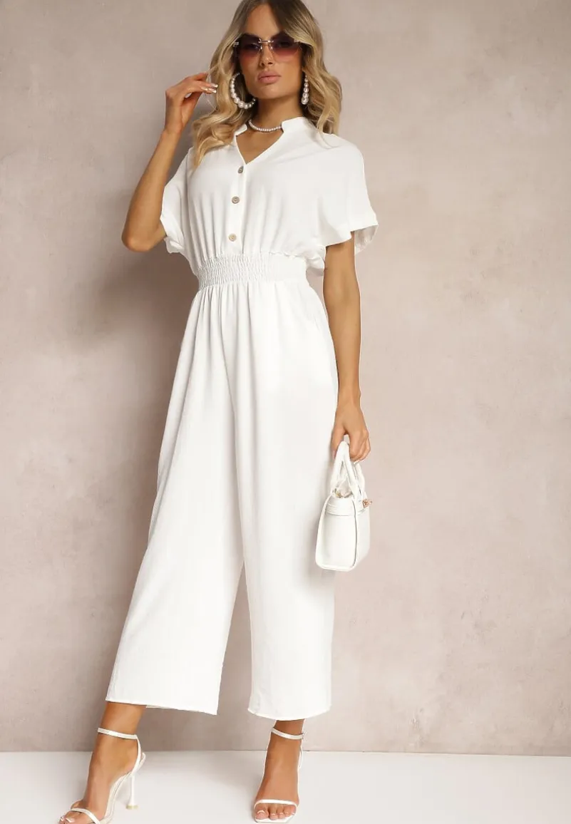 Biały Taliowany Kombinezon z Wiskozy Zapinany na Guziki Frisea