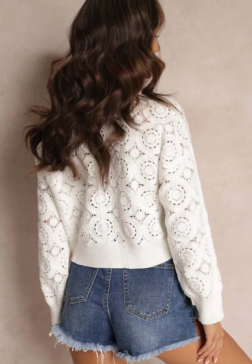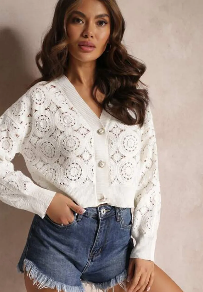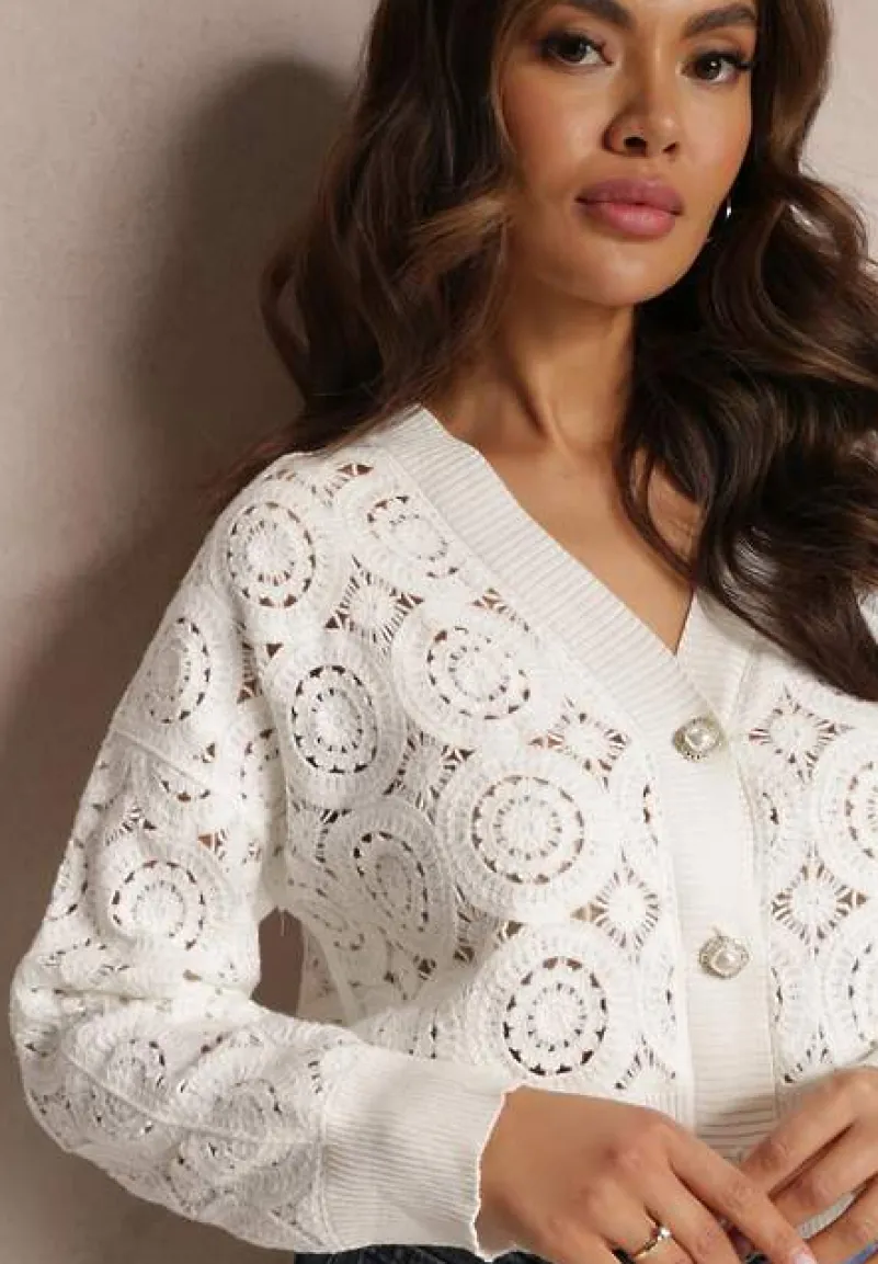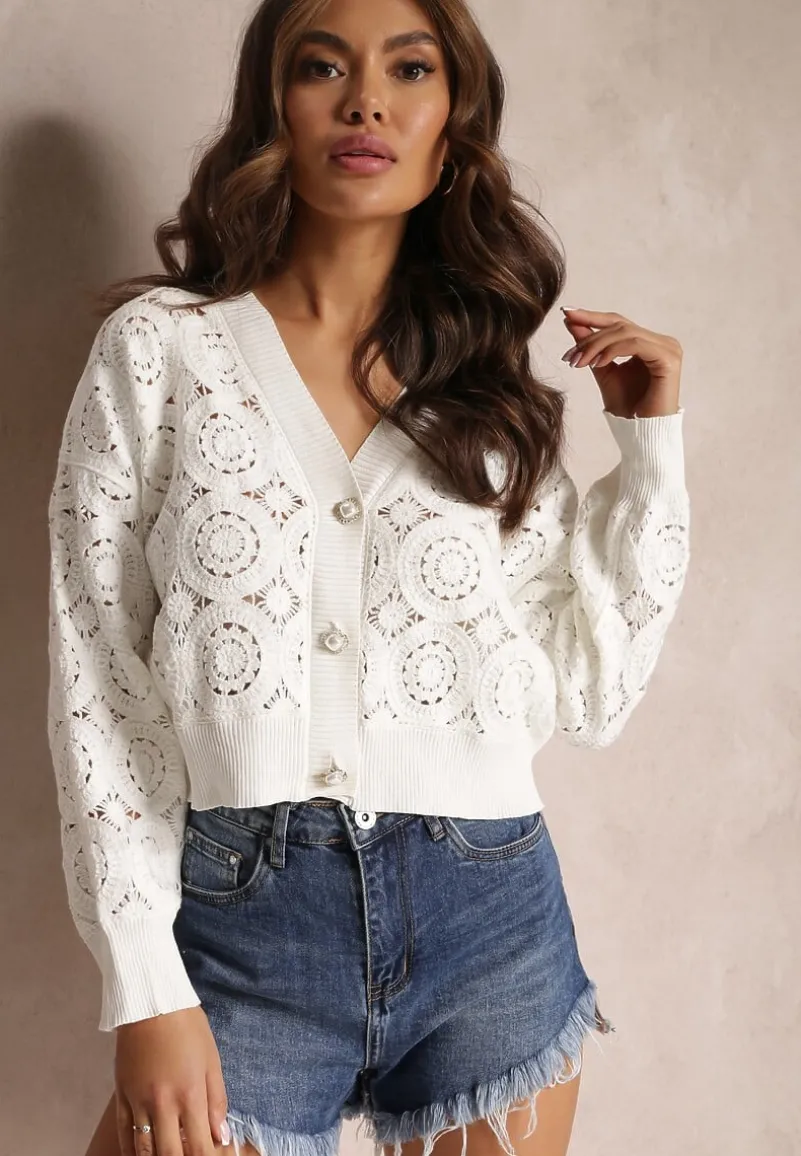Kardigan Nemolle zapinany z przodu na biżuteryjne guziki imitujące perły. Wykonany z ażurowej koronki. Dół, rękawy oraz dekolt zakończone elastycznym ściągaczem.