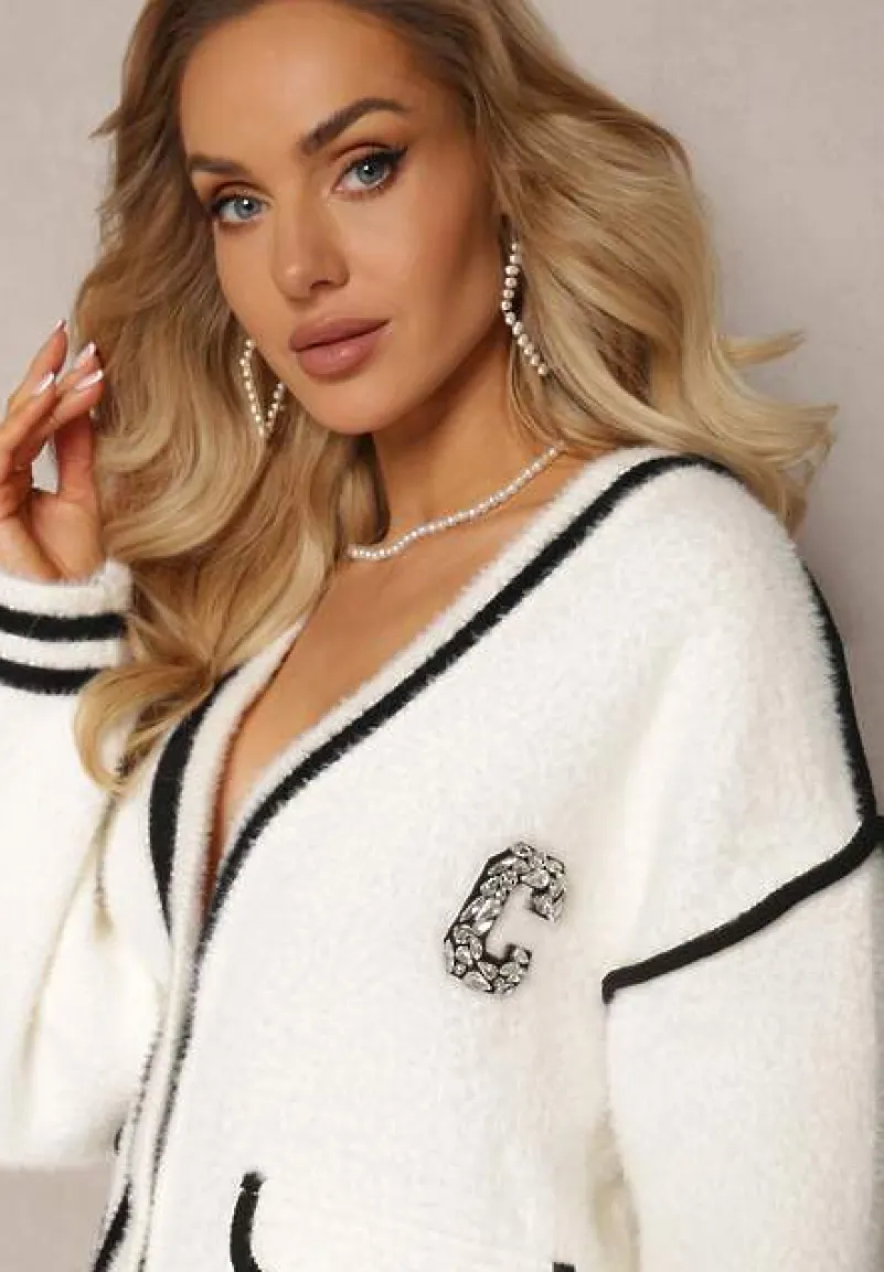 Kardigan Eldarin zapinany z przodu na guziki. Wykonany z dzianiny z wiskozy. Dekorowany przeszyciami oraz kieszeniami z przodu. Dodatkowo na wysokości klatki piersiowej naszywka w cyrkonie.