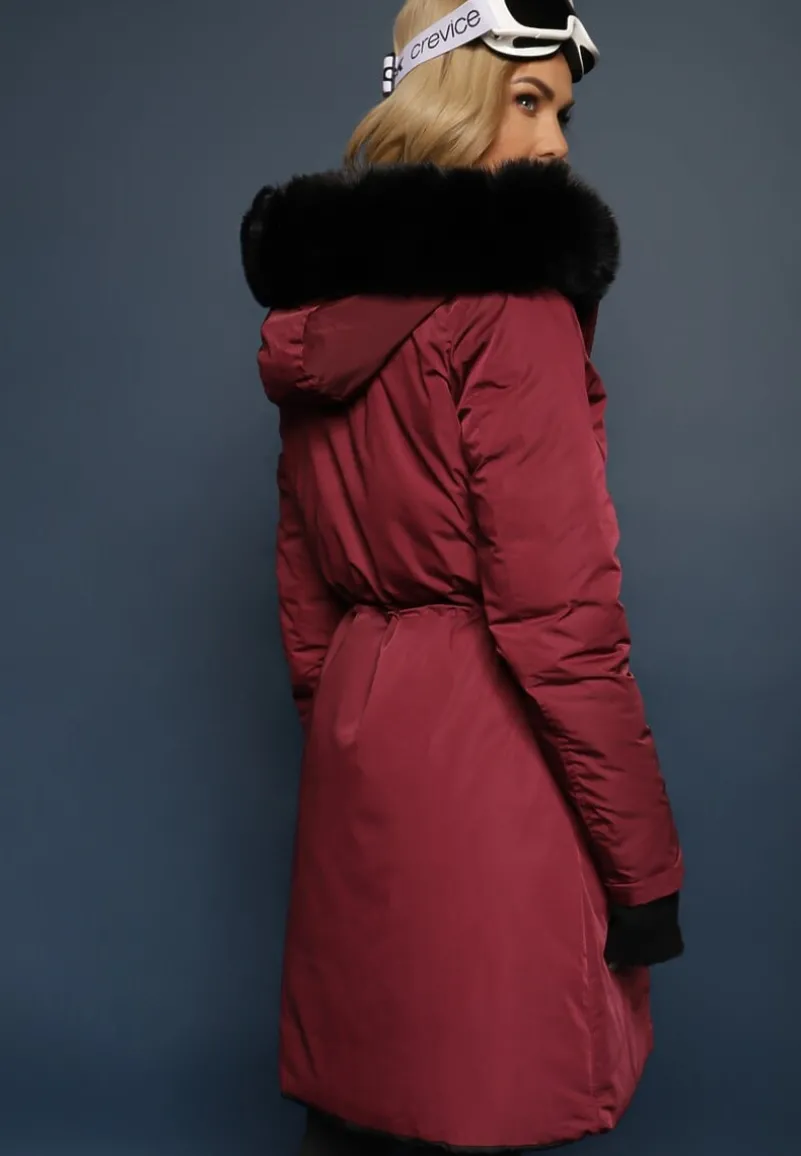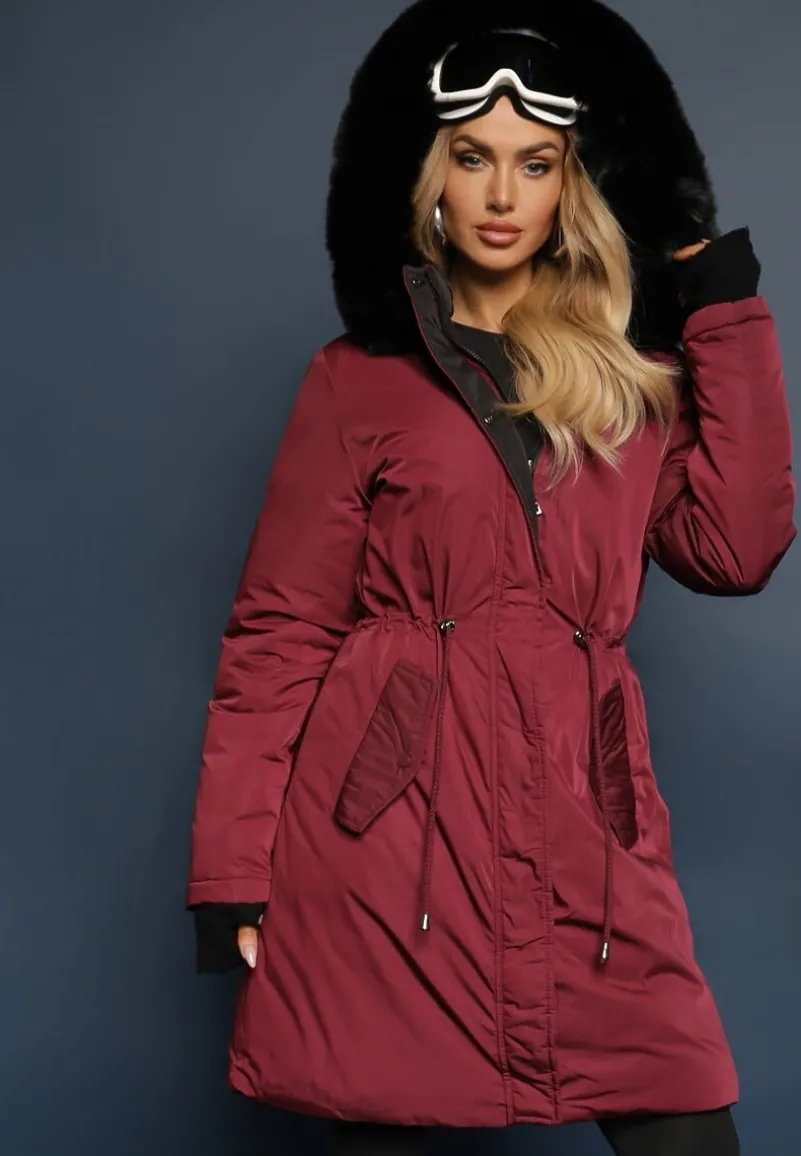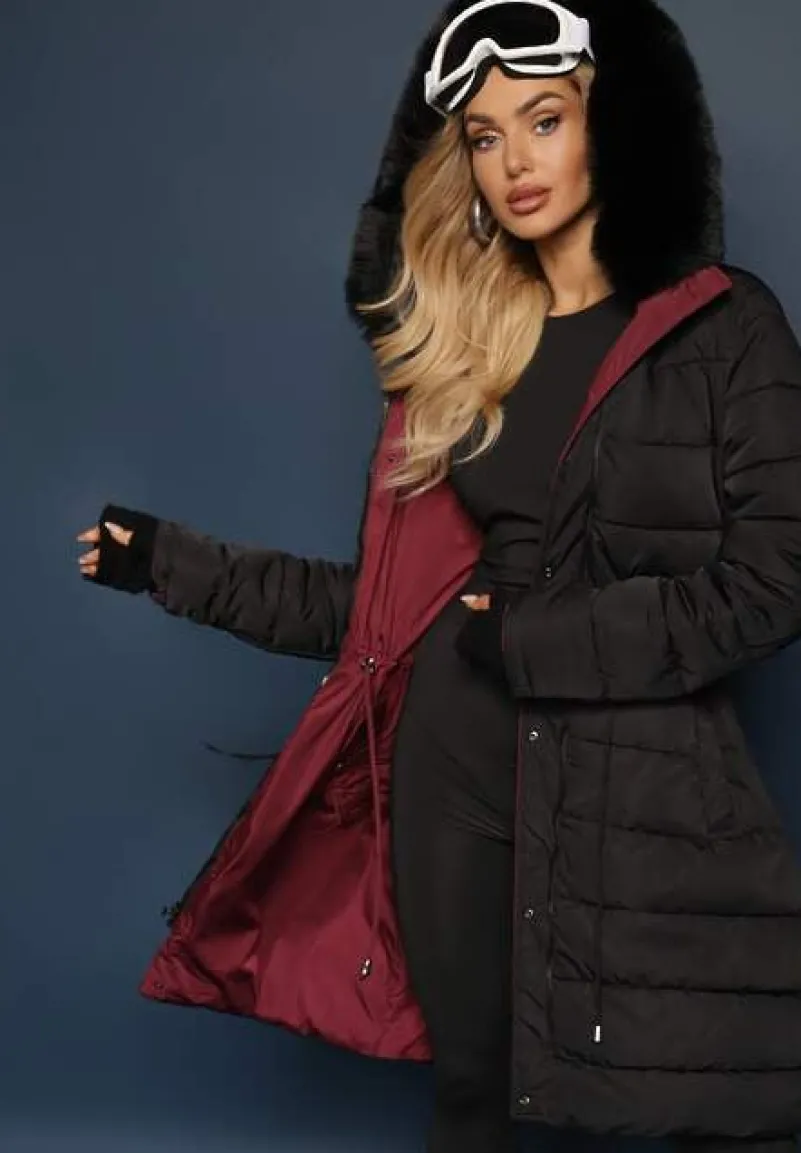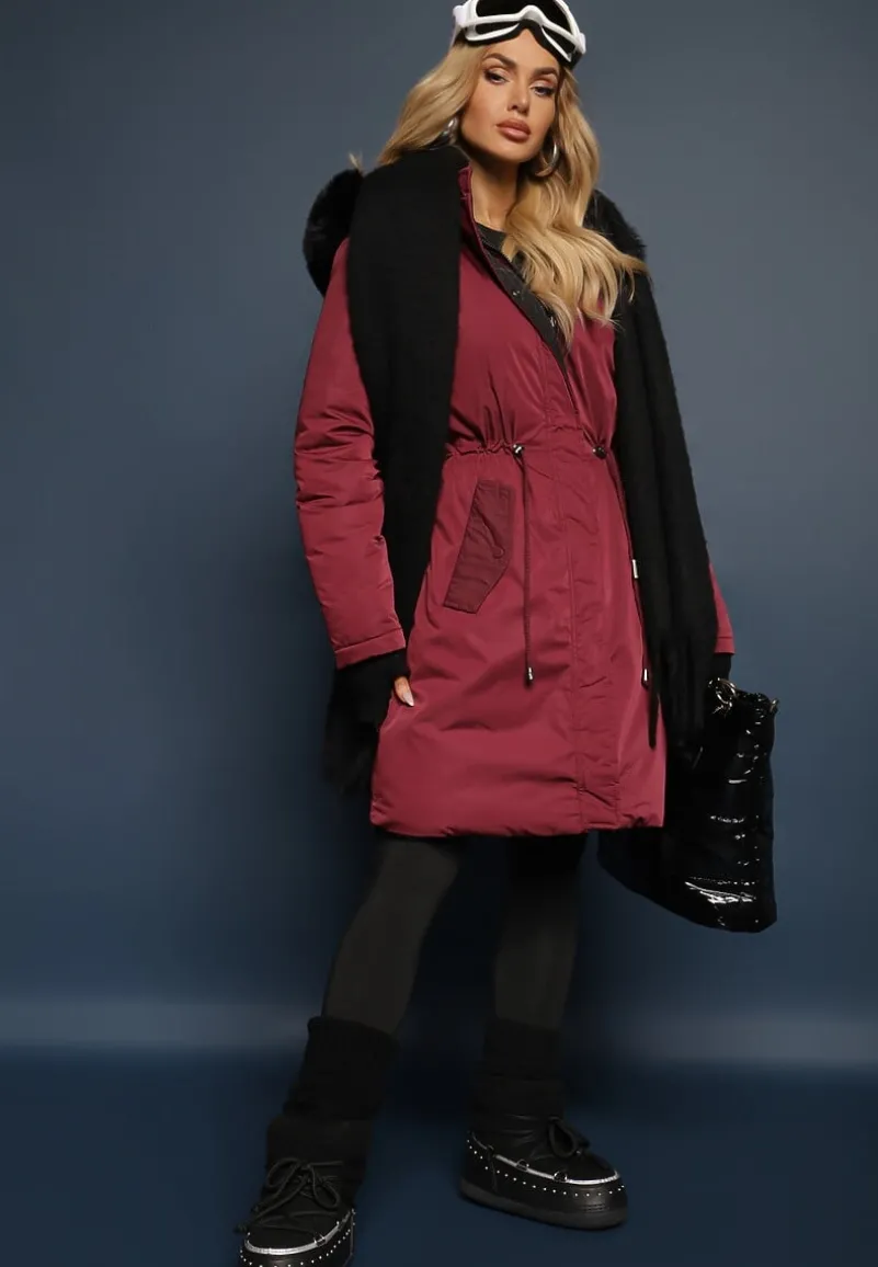 Dwustronna kurtka płaszcz – jedna strona z pikowaniem, druga gładka. Kurtka jest lekko taliowana za pomocą troczków, posiada kaptur ozdobiony futerkiem oraz kieszenie na wysokości bioder.