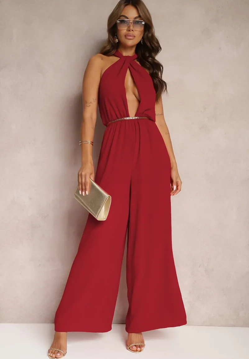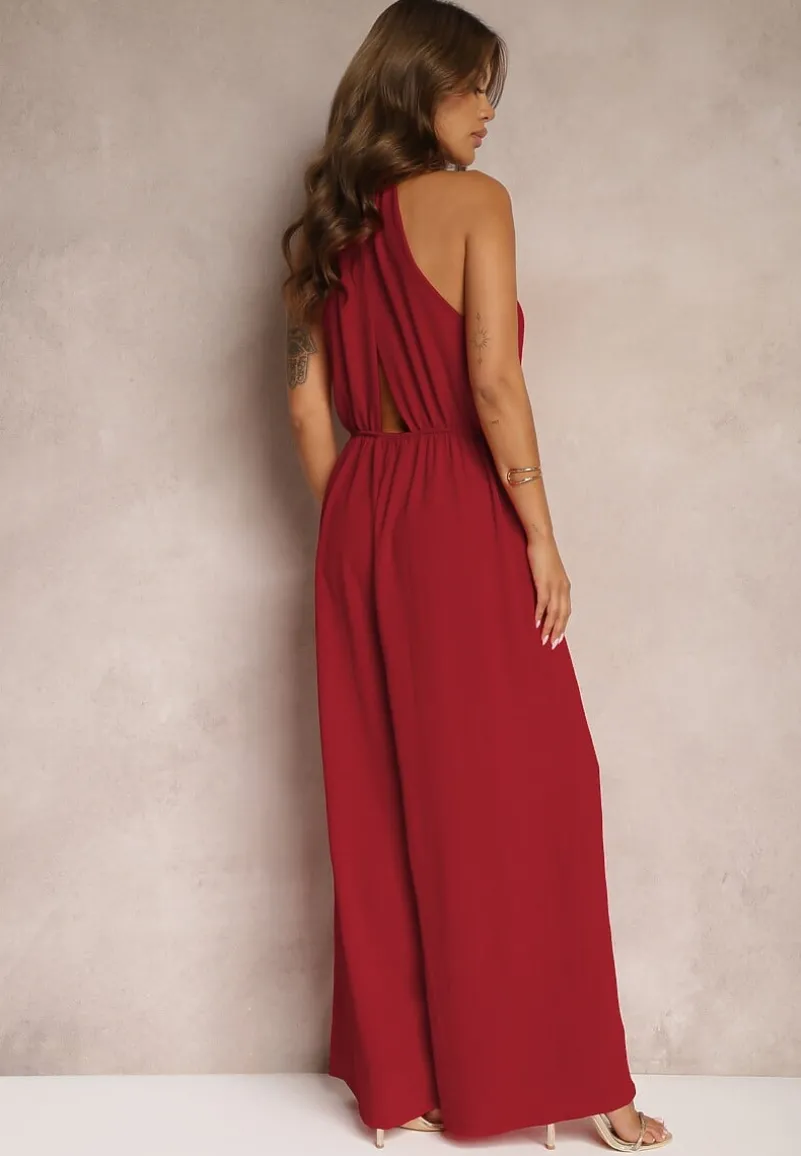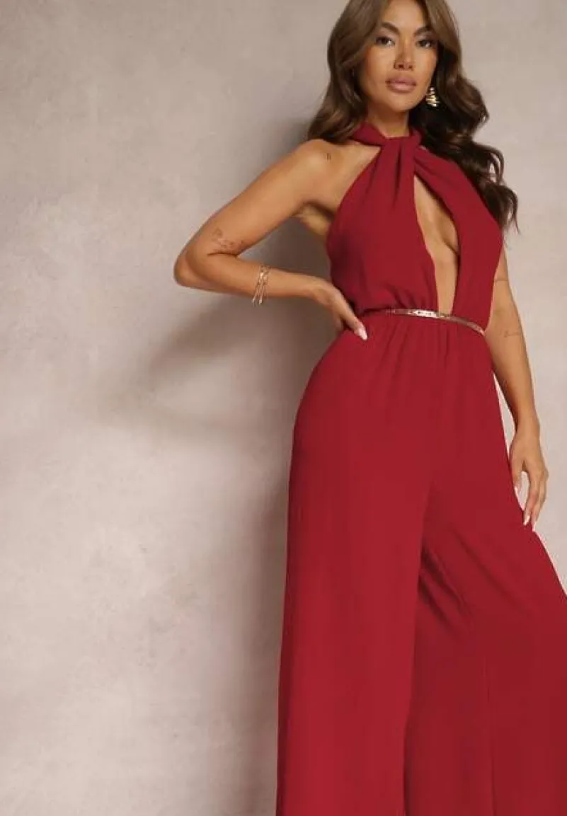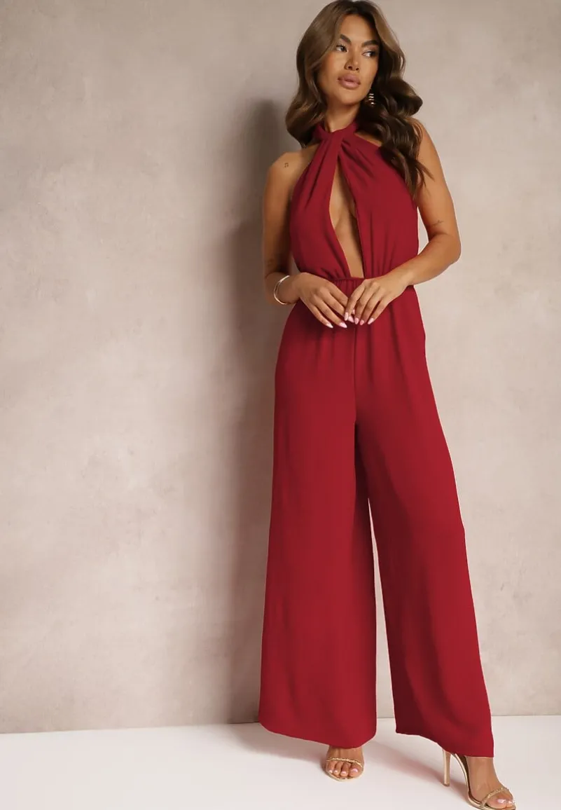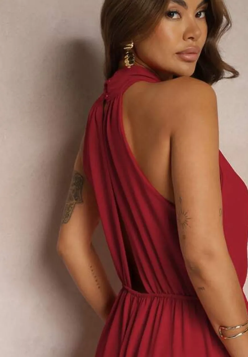 Bordowy Taliowany Kombinezon ze Ściągaczem w Talii i Wiązaniem przy Szyi Rivasiris