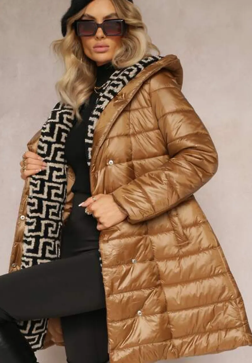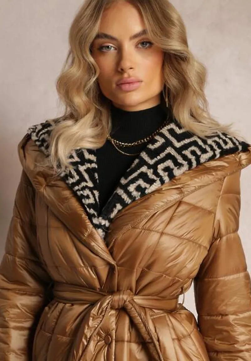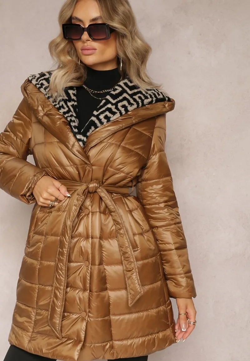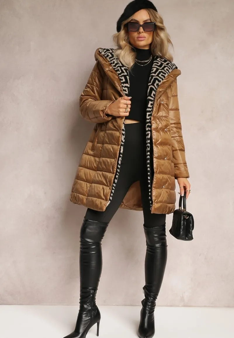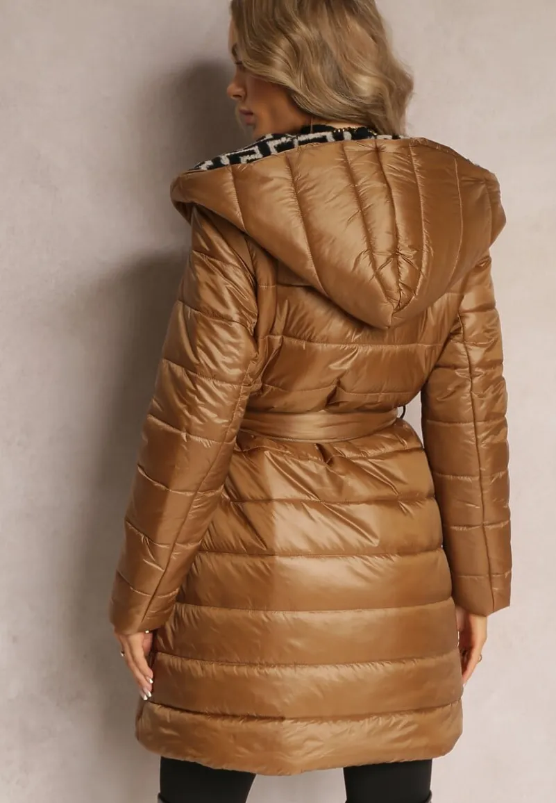 Kurtka Kalonia zapinana z przodu na rząd napów. Z tyłu kaptur z podszewką z imitacji futerka. Kaptur jest nieodpinany, natomiast podszewkę można odczepić. Po bokach wsuwane kieszenie. W zestawie materiałowy pasek do zawiązania dookoła talii. Fason pikowany. Średnio ocieplana. Pod spodem znajduje się tkaninowa podszewka zdobiona greckim wzorem. W pikowanej kurtce z wiązaniem poczujesz się wygodnie, a jednocześnie kobieco!