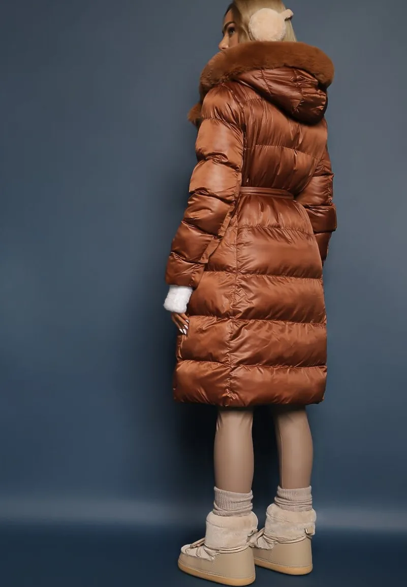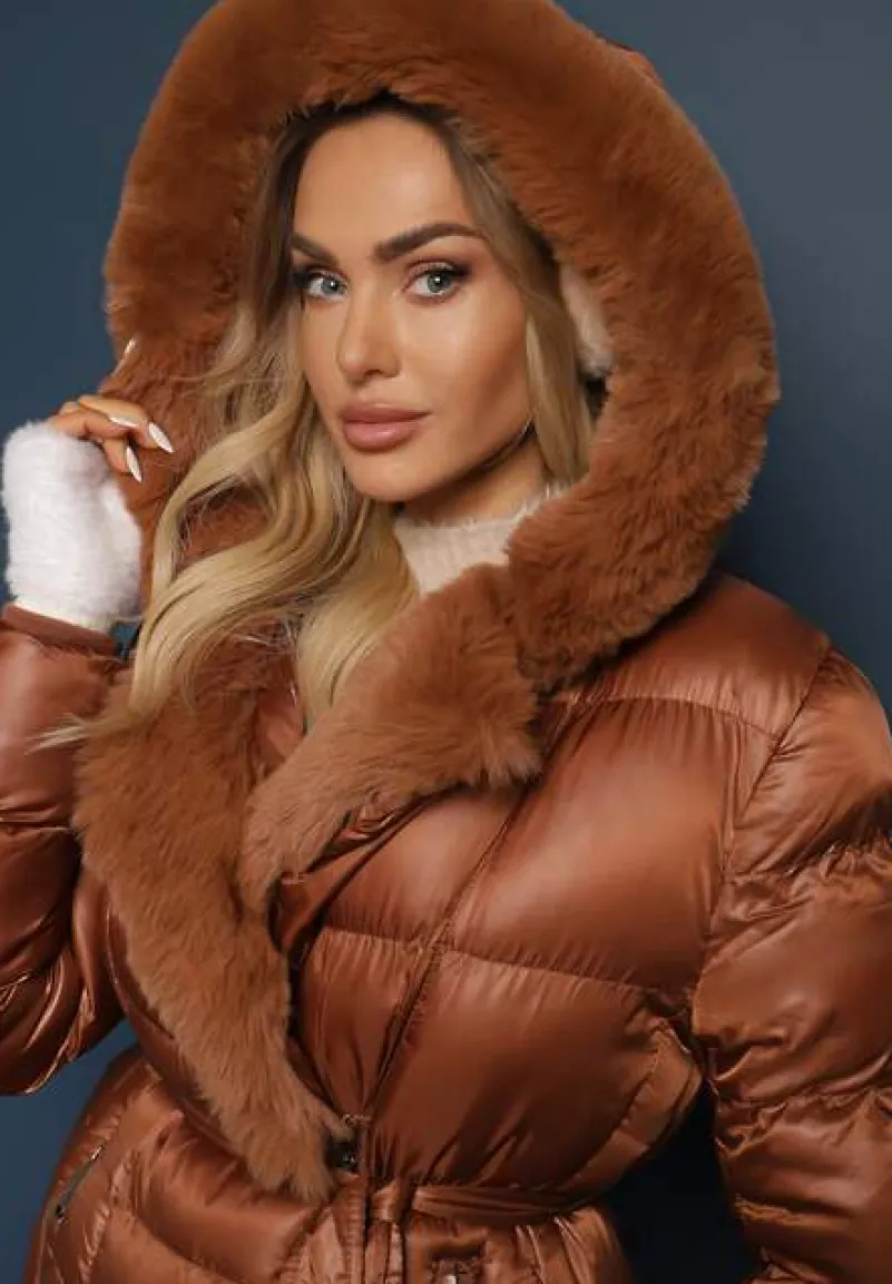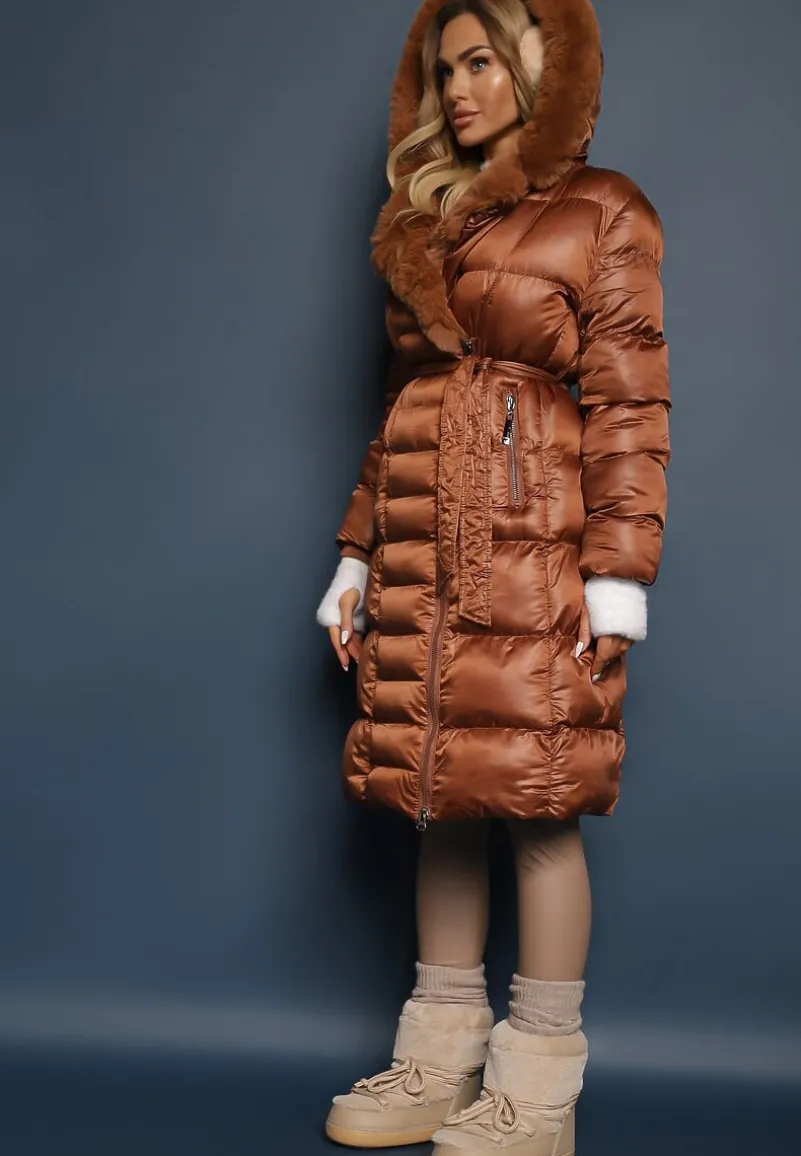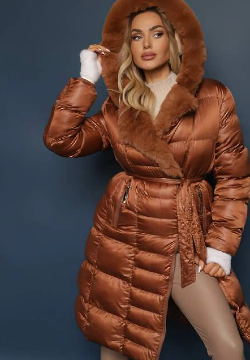 Pikowana Kurtka Vivenda typu płaszcz, sięgająca za kolano. Zapinana z przodu na asymetryczny zamek błyskawiczny. Wiązana w talii paskiem. Nieodpinany kaptur zdobiony imitacją futerka. Po bokach zasuwane kieszenie. Kurtka średnio ocieplana.