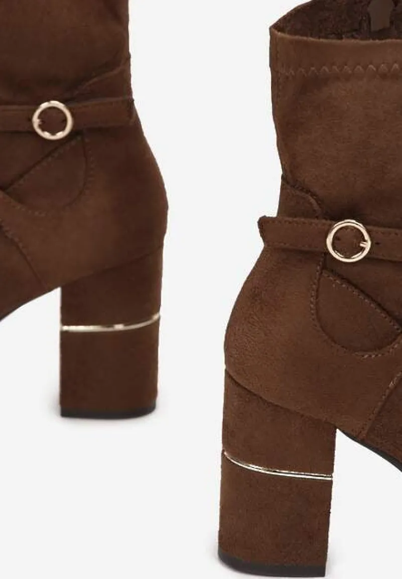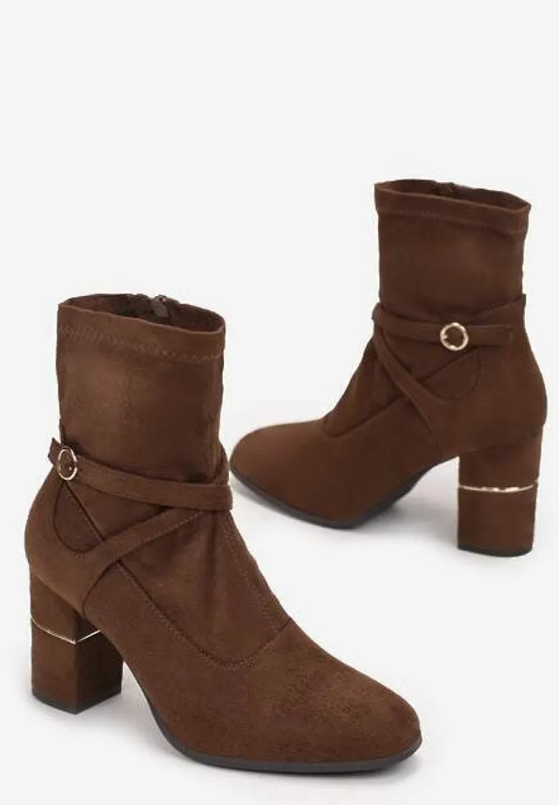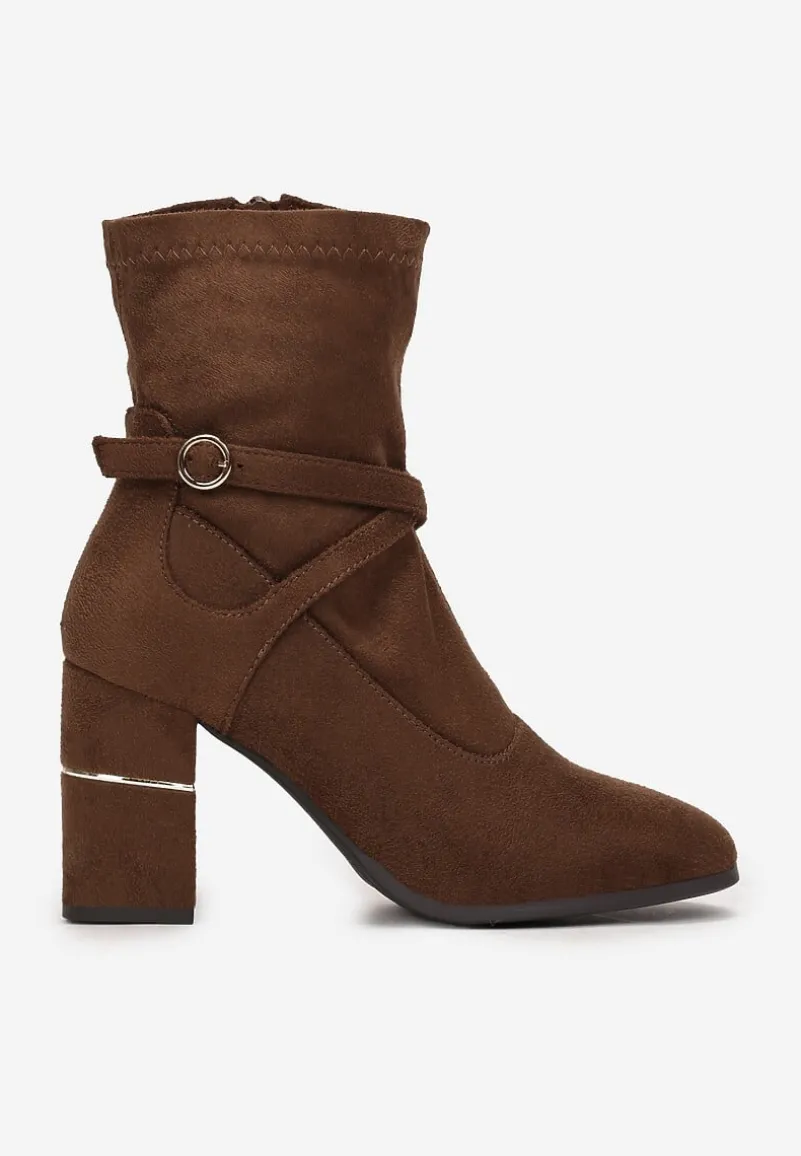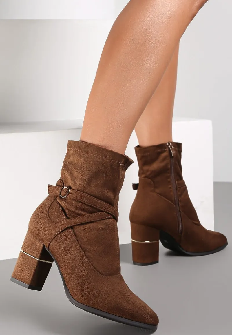 Botki Ndiaye z dopasowaną cholewką za kostkę. Okrągłe noski. Na powlekanym słupku z cienką lamówką. Dodatkowo udekorowane cienkimi paseczkami oraz niewielką, owalną sprzączką. Zapinane na zamek błyskawiczny po wewnętrznej stronie. Wykonane z ekozamszu, wkładka z materiału. Idealne do stylizacji w klimacie boho.