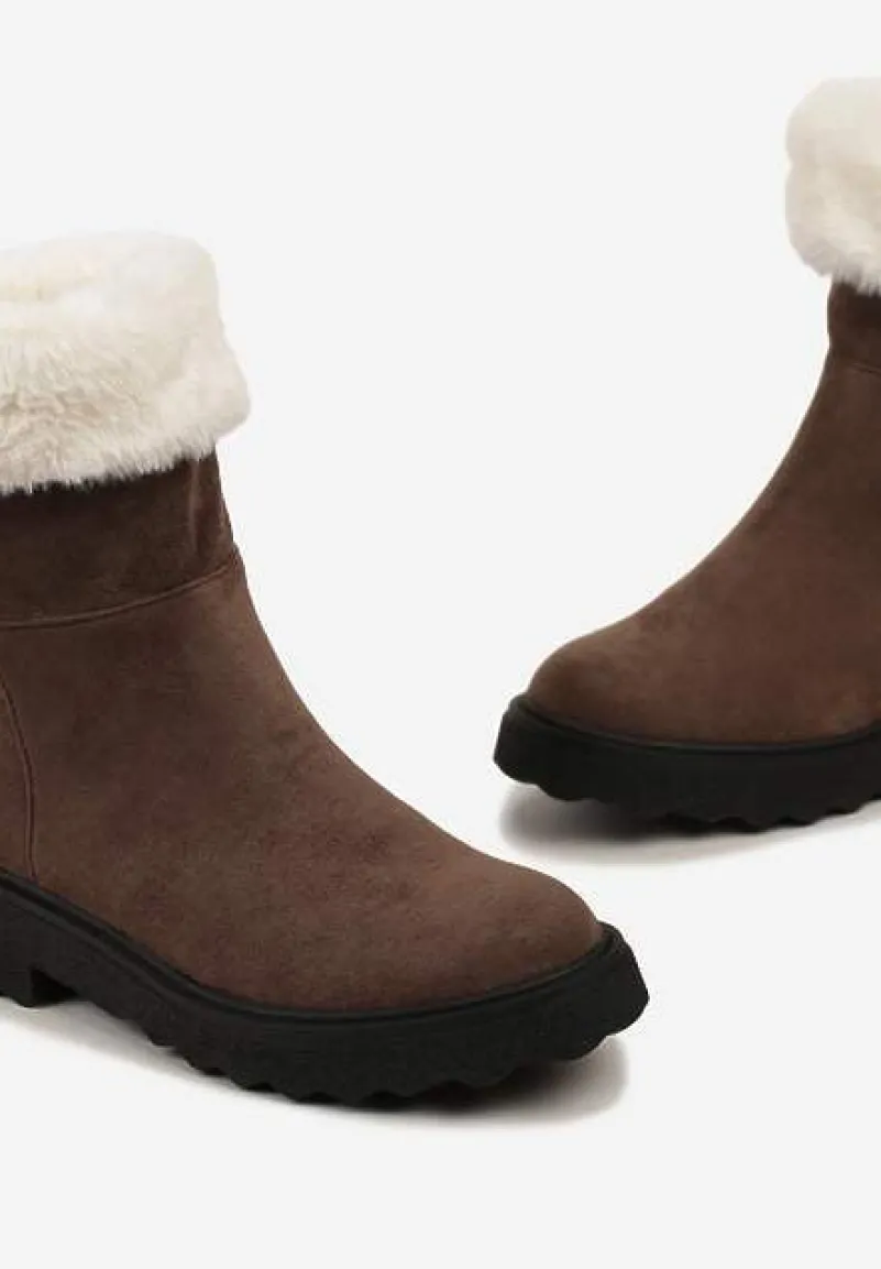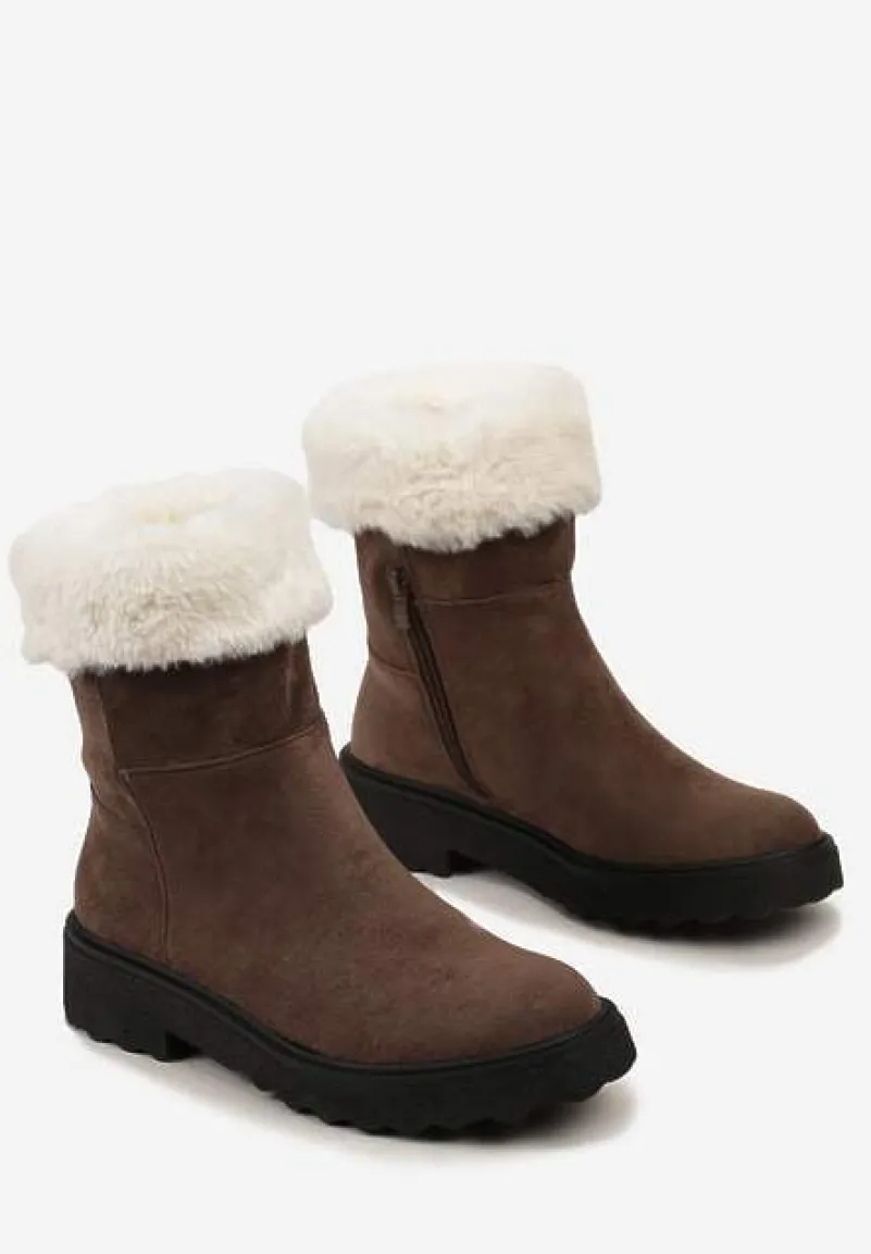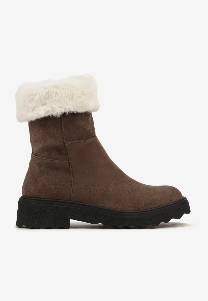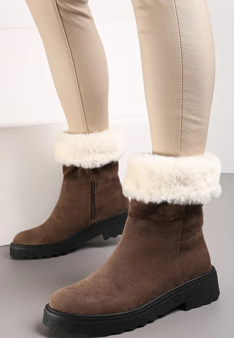 Botki Cegia wykonane z ekoskóry, na płaskiej podeszwie. Zapinane na zamek błyskawiczny. Wokół kostki wywinięta cholewka z ozdobnym futerkiem. W środku ocieplane.
