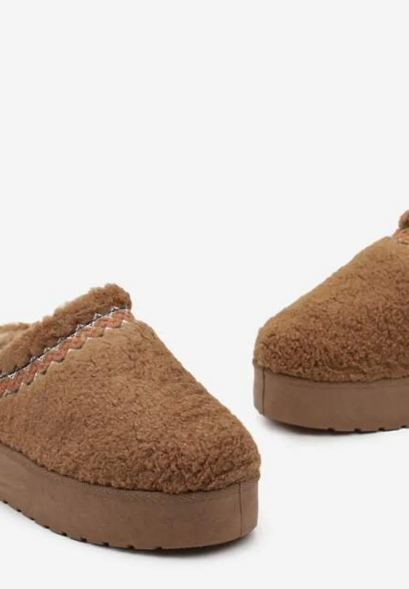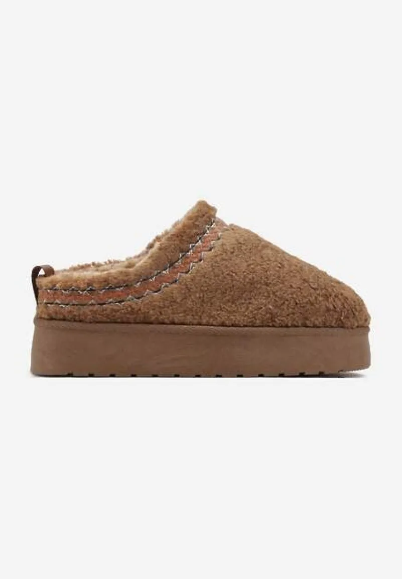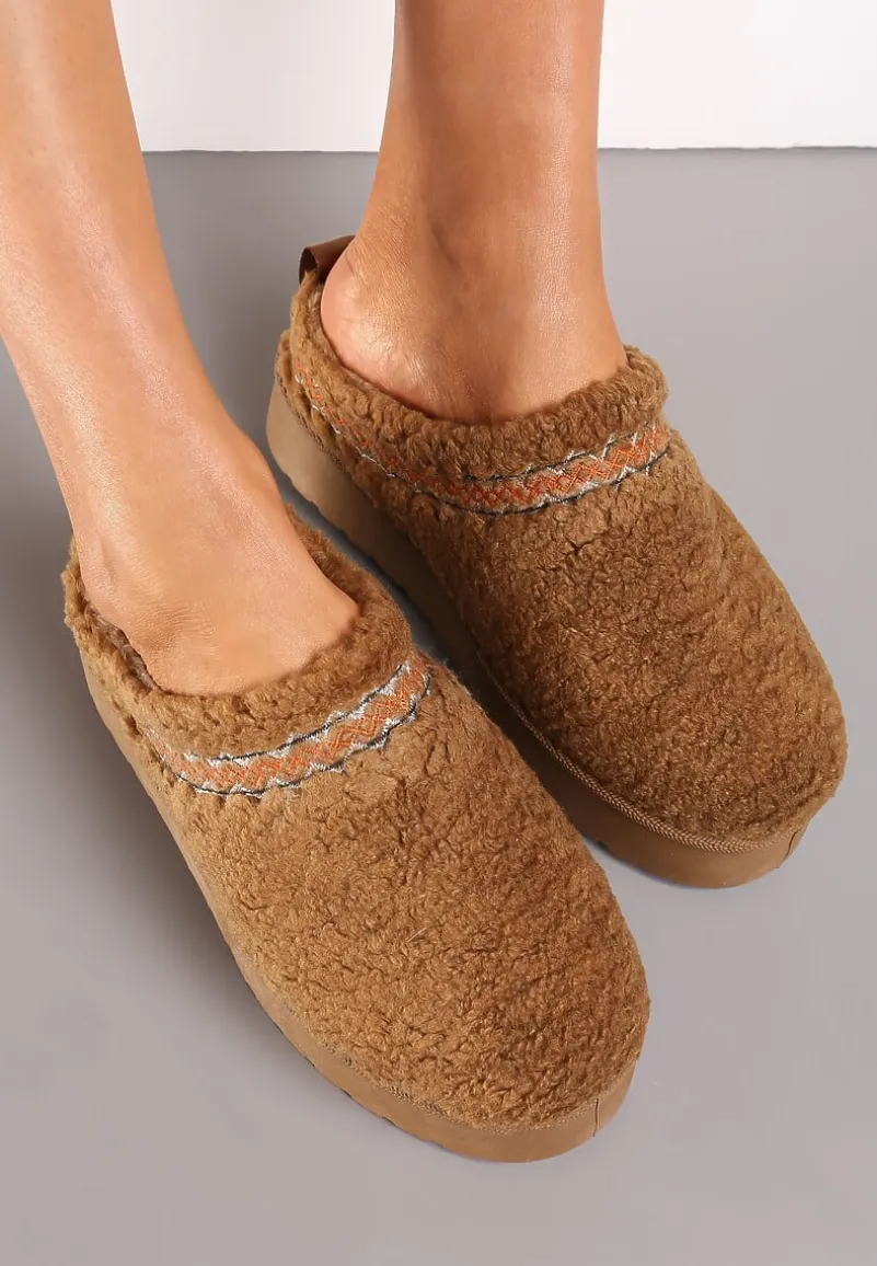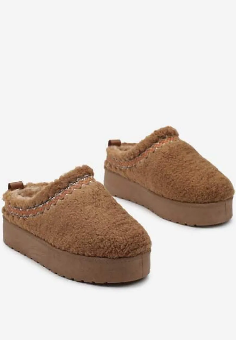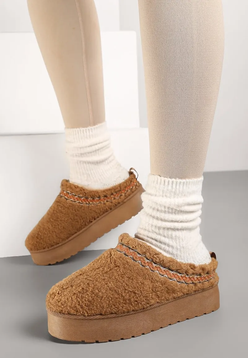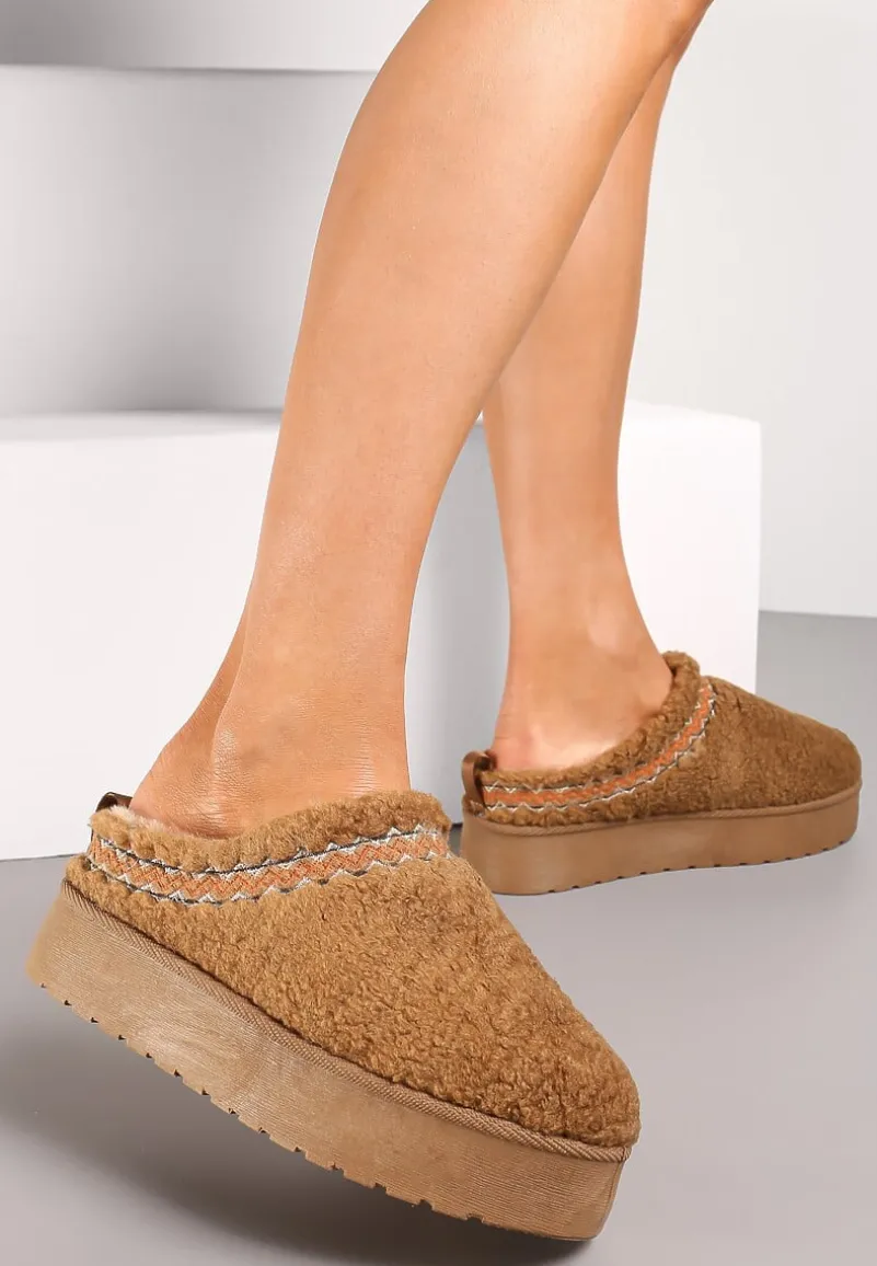 Wsuwane kapcie Topora na platformie z cholewką przed kostkę ozdobioną przeszyciami. W środku wyścielone miękkim futerkiem. Idealne na chłodne zimowe wieczory.