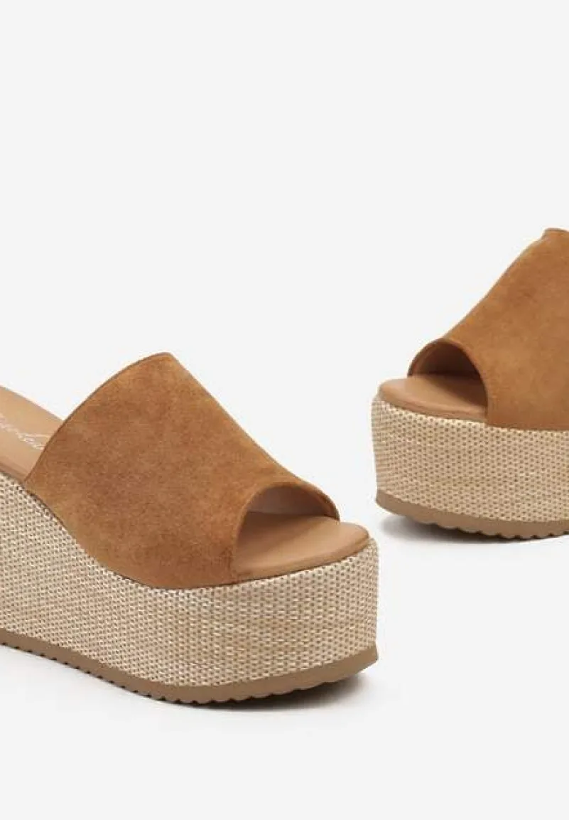 Klapki Marinle w stylu boho na wysokim koturnie z platformą ozdobionych plecionką. Doskonałe do jeansowych spódnic, ażurowych kompletów i sukienek koszulowych.