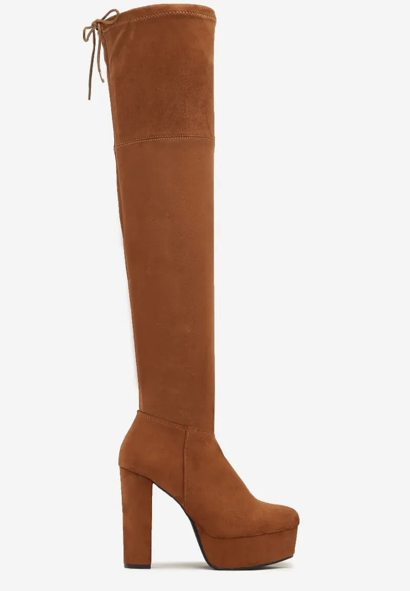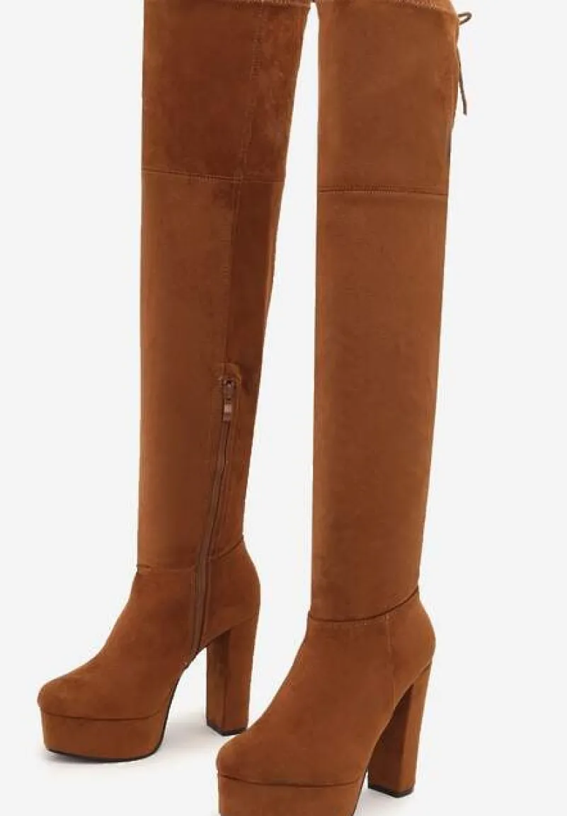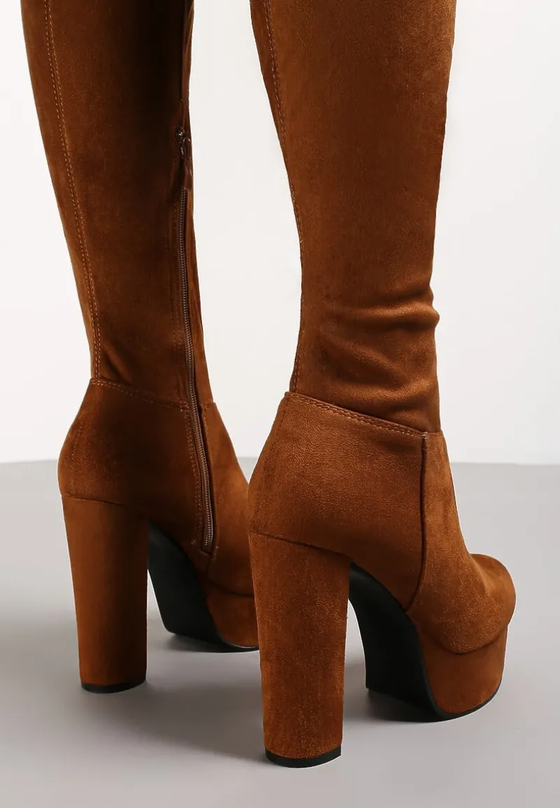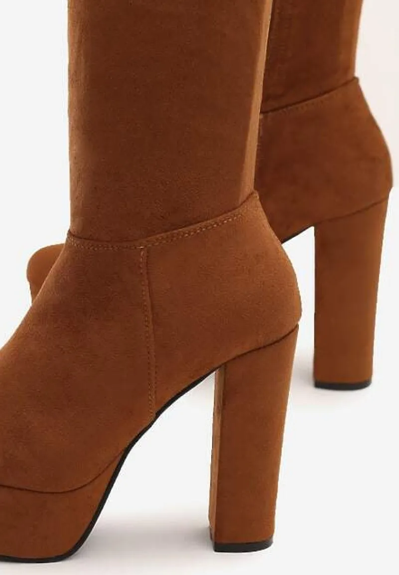 Kozaki Tyburn na wysokim obcasie typu słupek i platformie. Z wysoką, dopasowaną cholewką z przeszyciami, zakończoną wiązaniem. Okrągły nosek. Wykonane z ekozamszu. Zasuwane. Wydłużą Twoje nogi – będą pasować idealnie do sukienek i spódniczek mini!