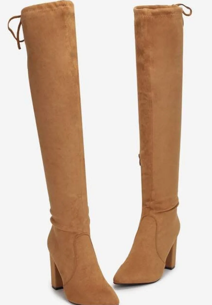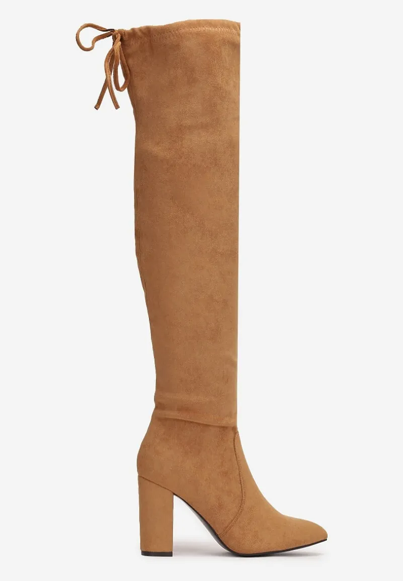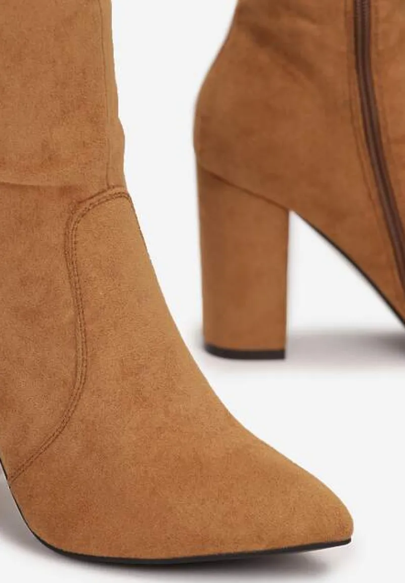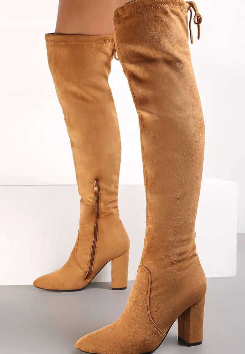 Kozaki Teth na słupku, w całości wykonane z ekozamszu. Elegancki, szpiczasty nosek, z delikatnymi przeszyciami na wysokości śródstopia. Dopasowana cholewka sięgająca za kolano oraz zakończona regulowanym ściągaczem ze sznurkiem. Zasuane na zamek błyskawiczny po wewnętrznej stronie. Lekko ocieplane kocem obuwniczym. Załóż do nich dzianinową sukienkę mini i stwórz zachwycającą, kobiecą stylizację!