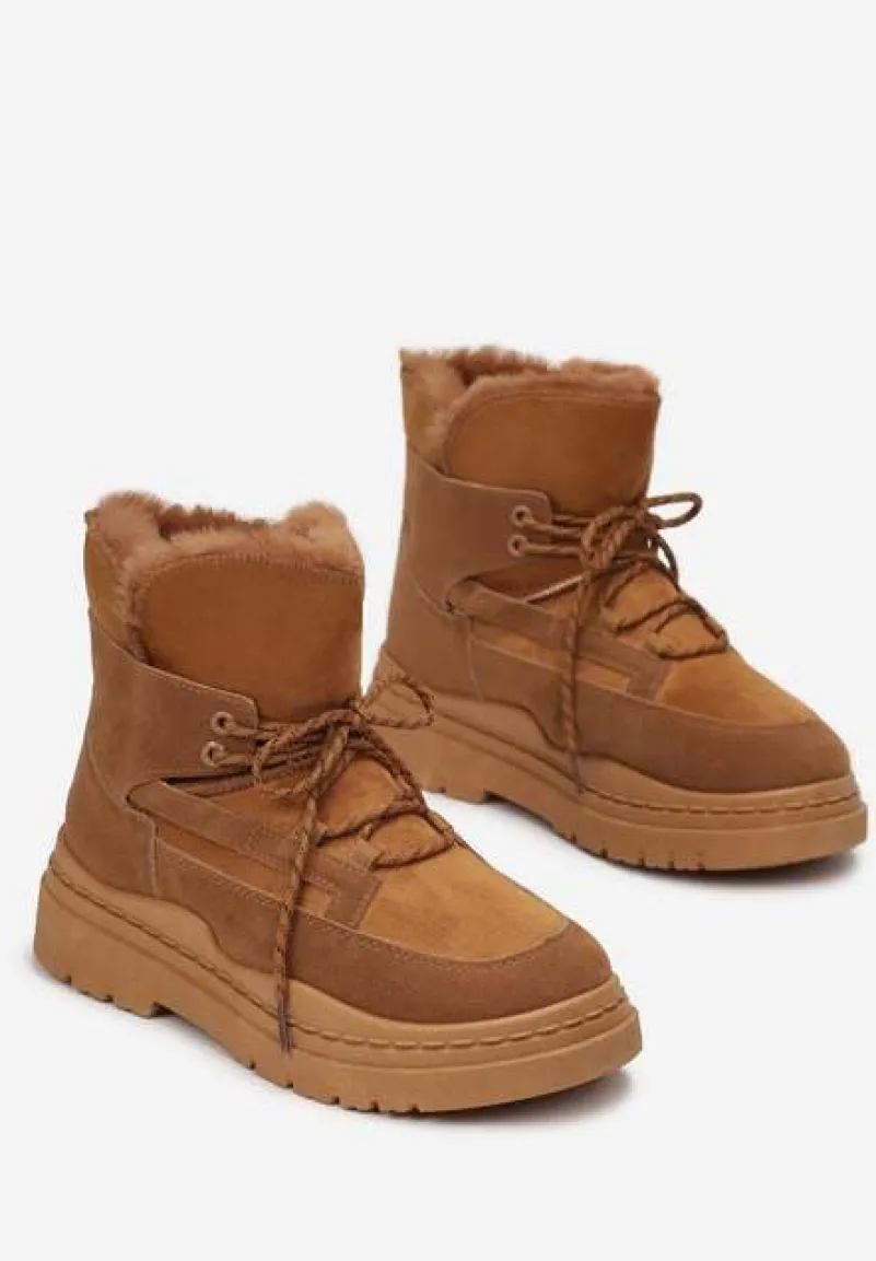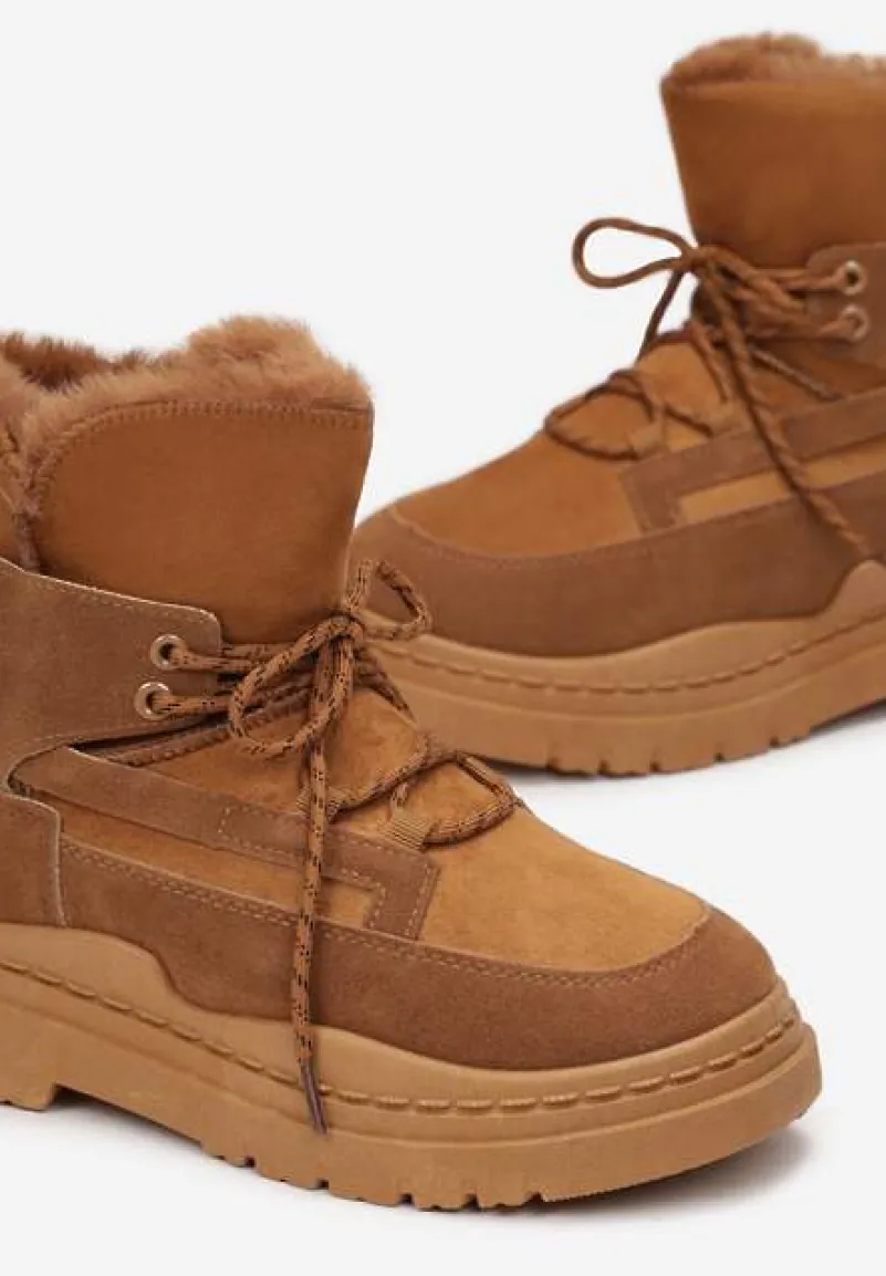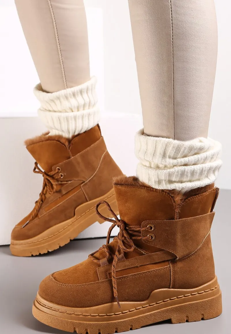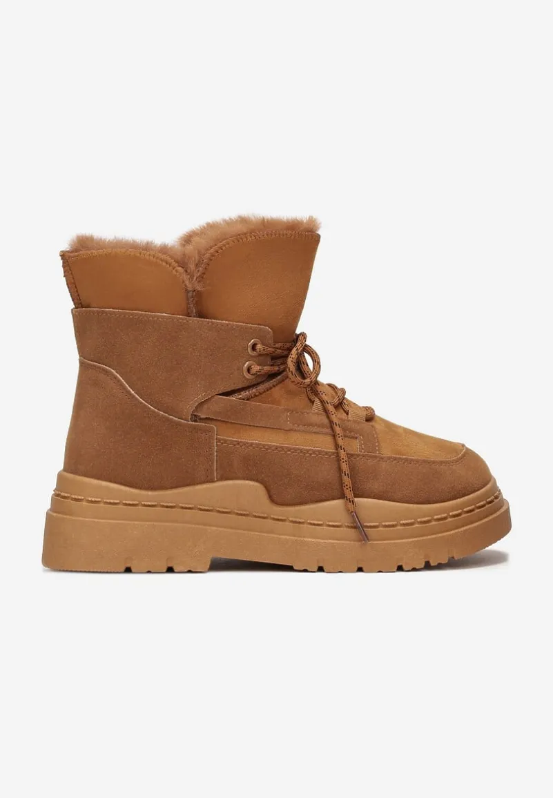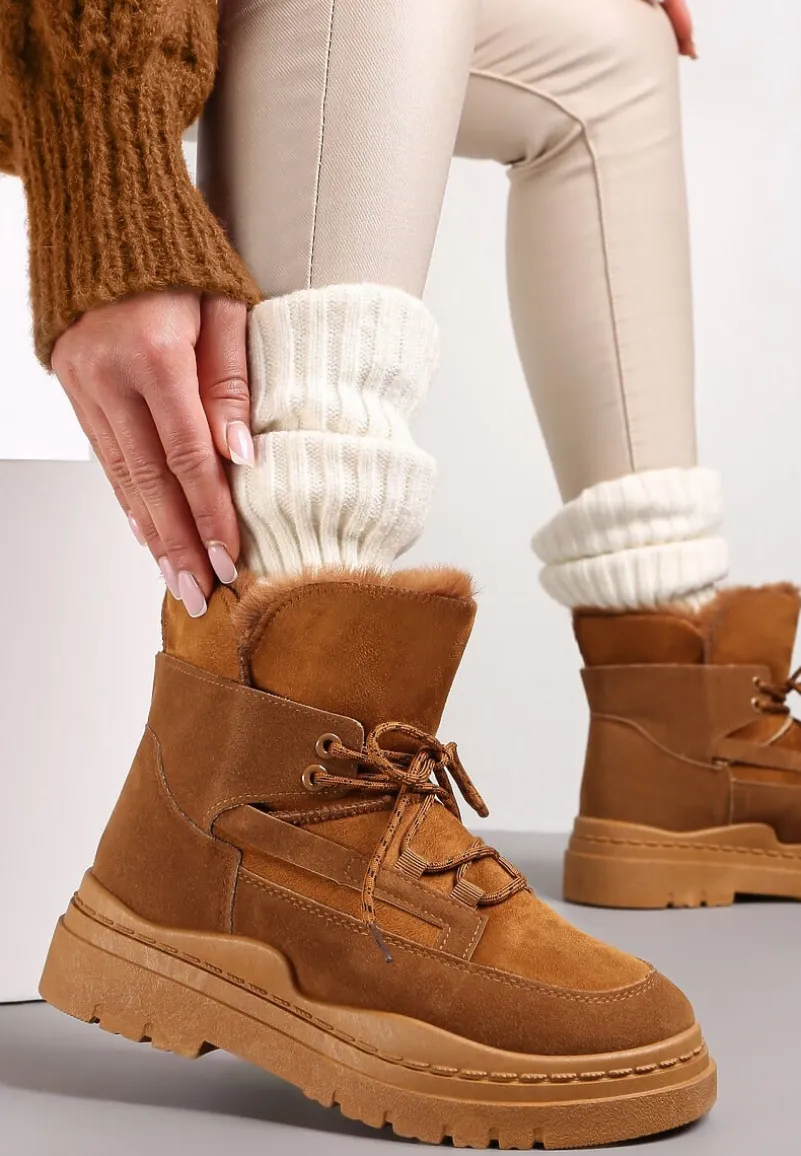Botki Cynra inspirowane fasonem śniegowców z charakterystycznym wiązaniem, wsuwane. Osadzone na platformie, dodatkowo zdobione futerkiem na górnej krawędzi. Uwaga: zapoznaj się z wymiarami wkładki, rozmiarówka zaniżona.