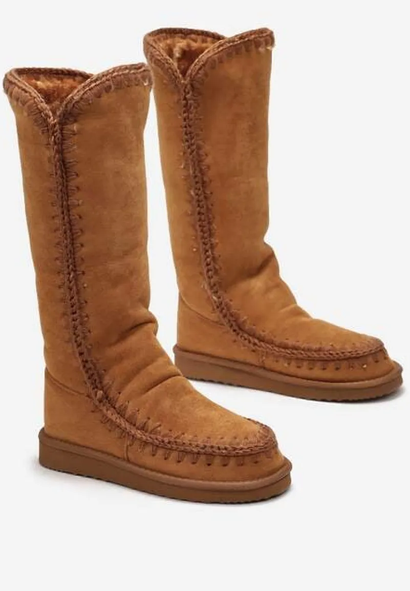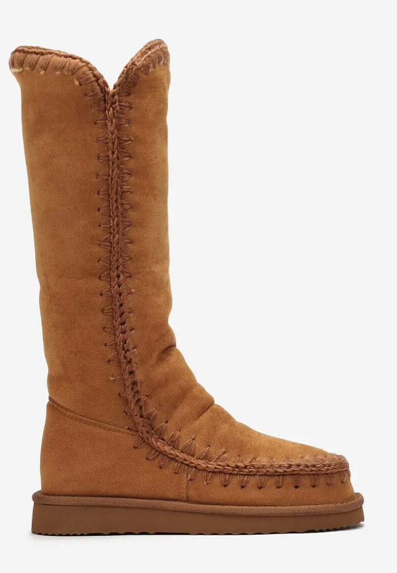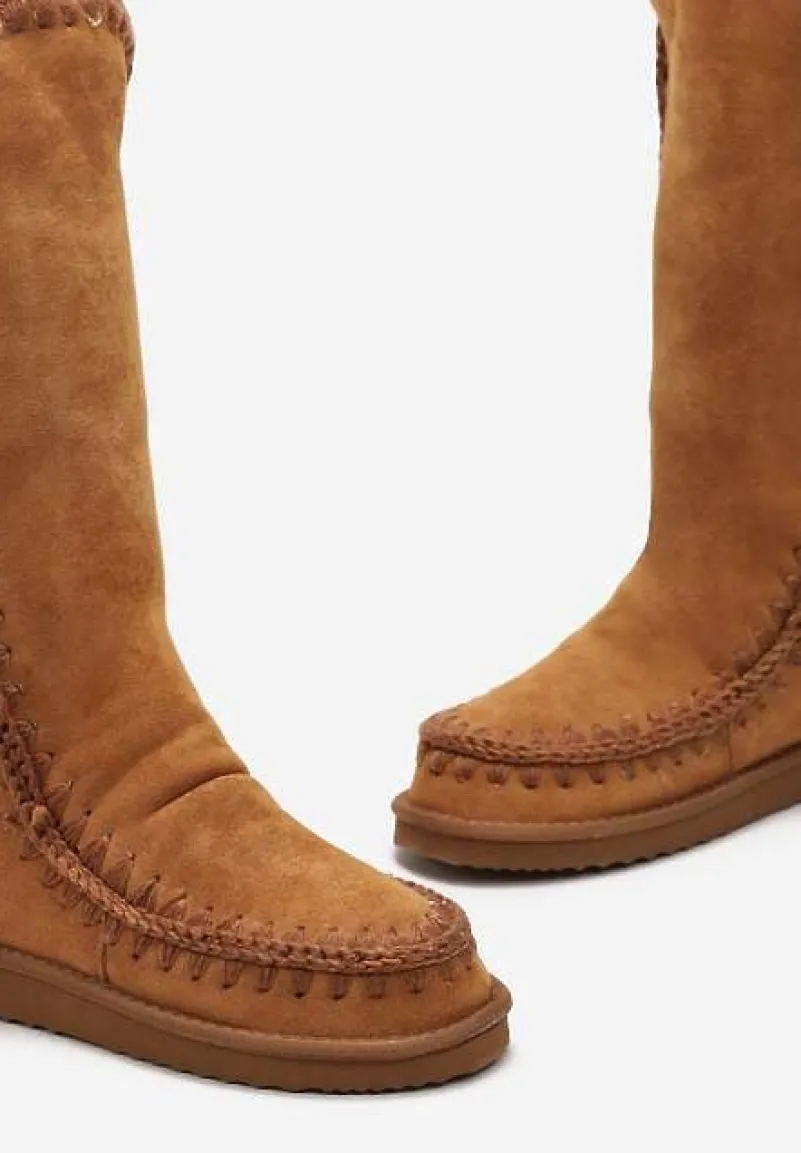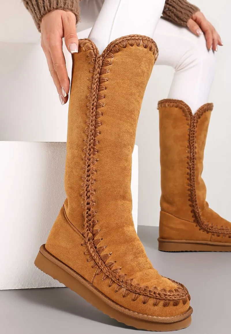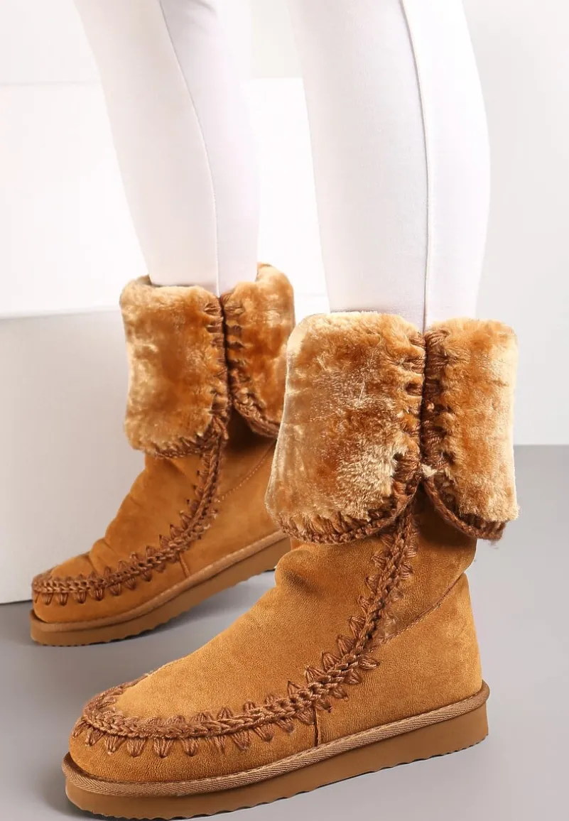 Śniegowce Zaphkia z ozdobnie wywiniętą cholewką z futerka i dekoracyjnymi przeszyciami. Osadzone na płaskiej podeszwie. Będą wspaniałym dodatkiem, który urozmaici każdą jesienno-zimową stylizację.