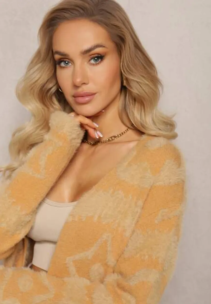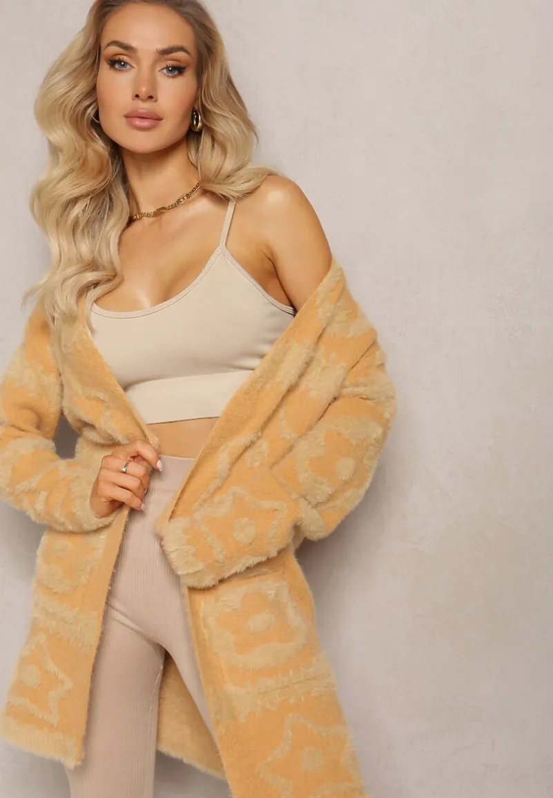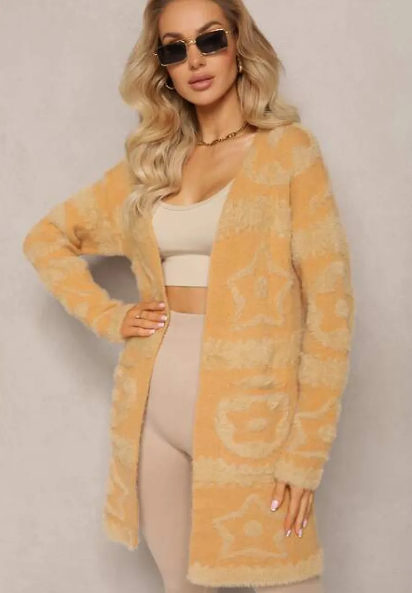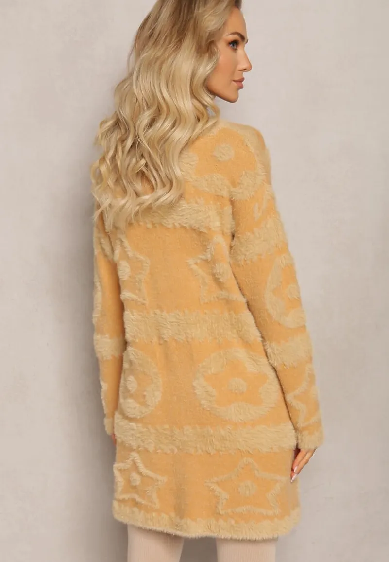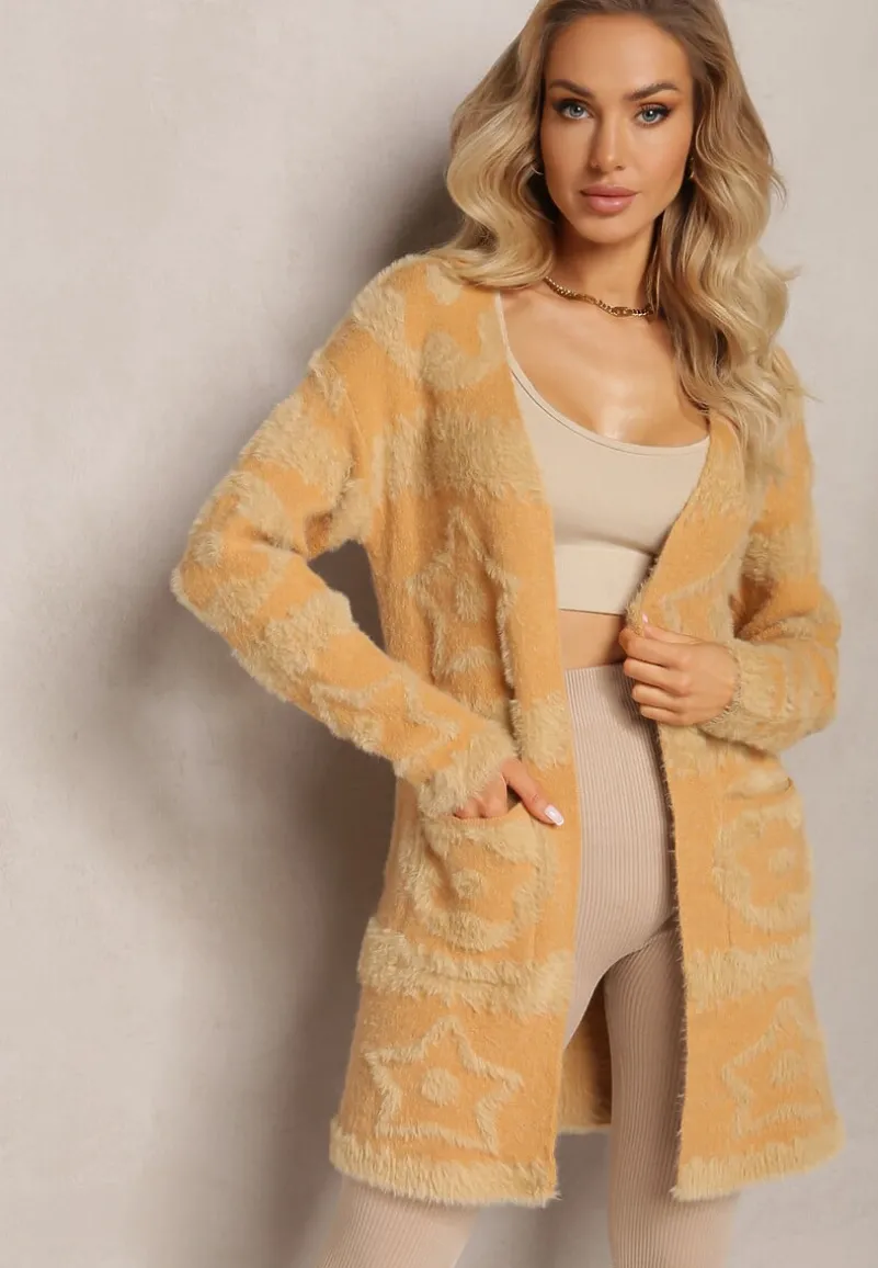 Kardigan Aborra wykonany z puszystej, dzianinowej tkaniny z dłuższym włosiem. Niezapinany fason. Z przodu naszyte kieszenie.