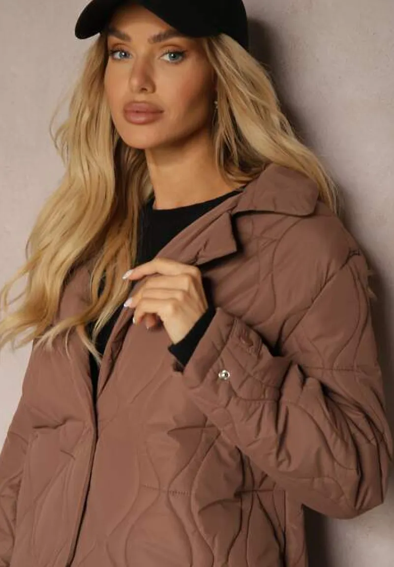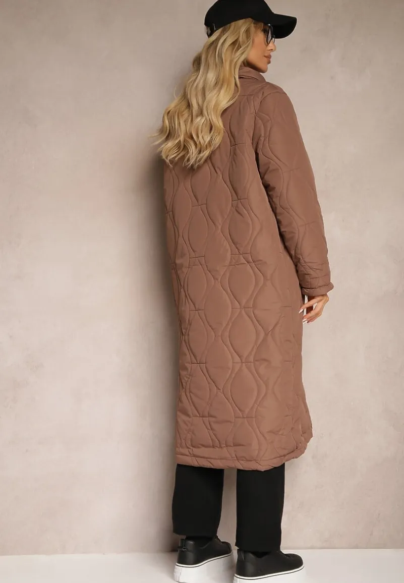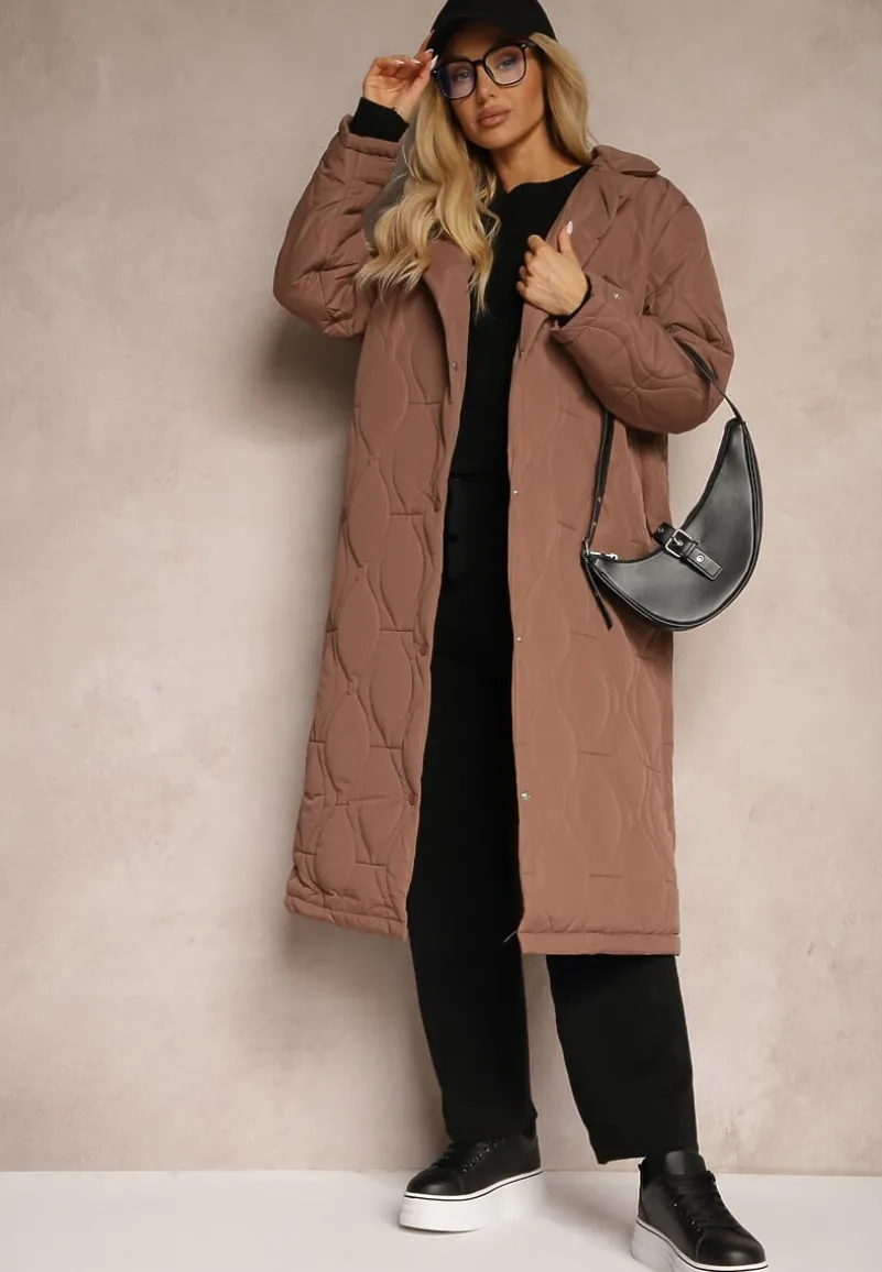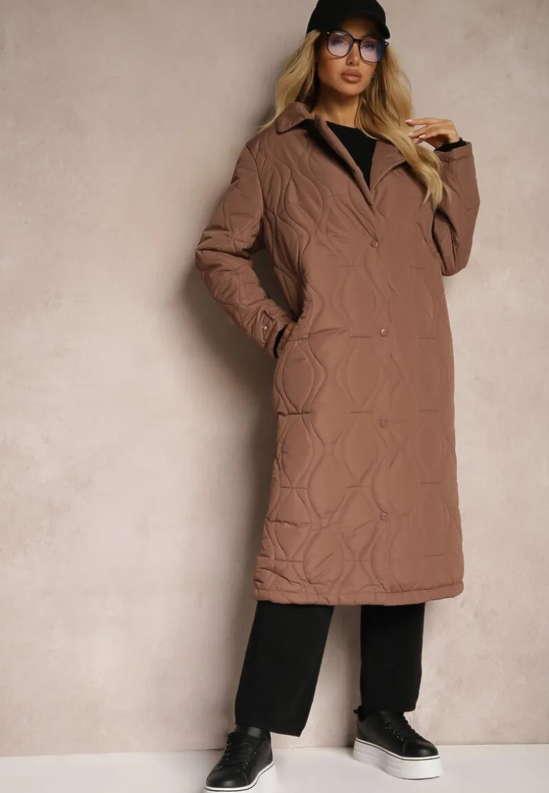 Kurtka przejściowa o długim fasonie zapinana na napy. Posiada kołnierz i wsuwane kieszenie.
