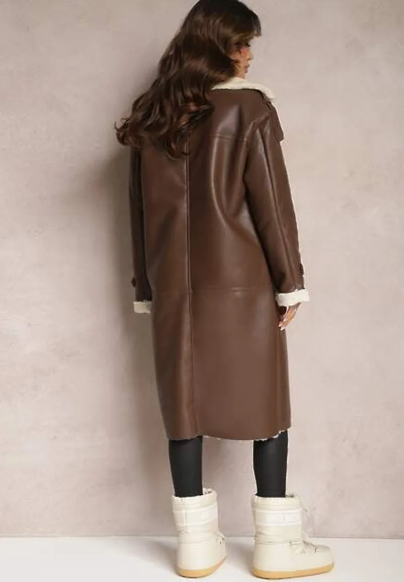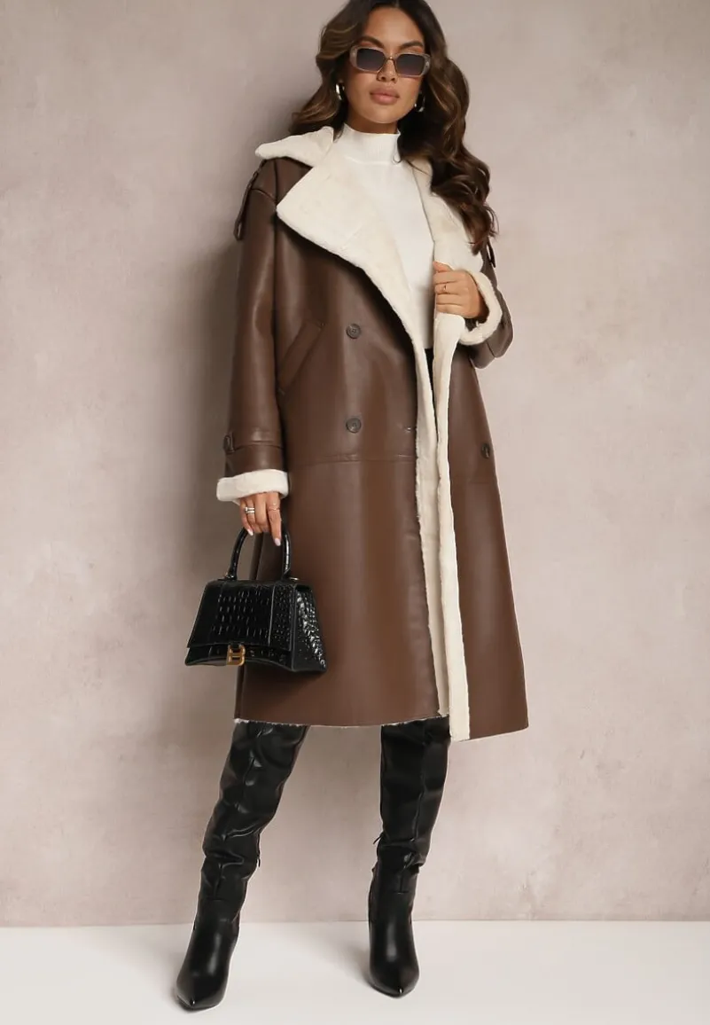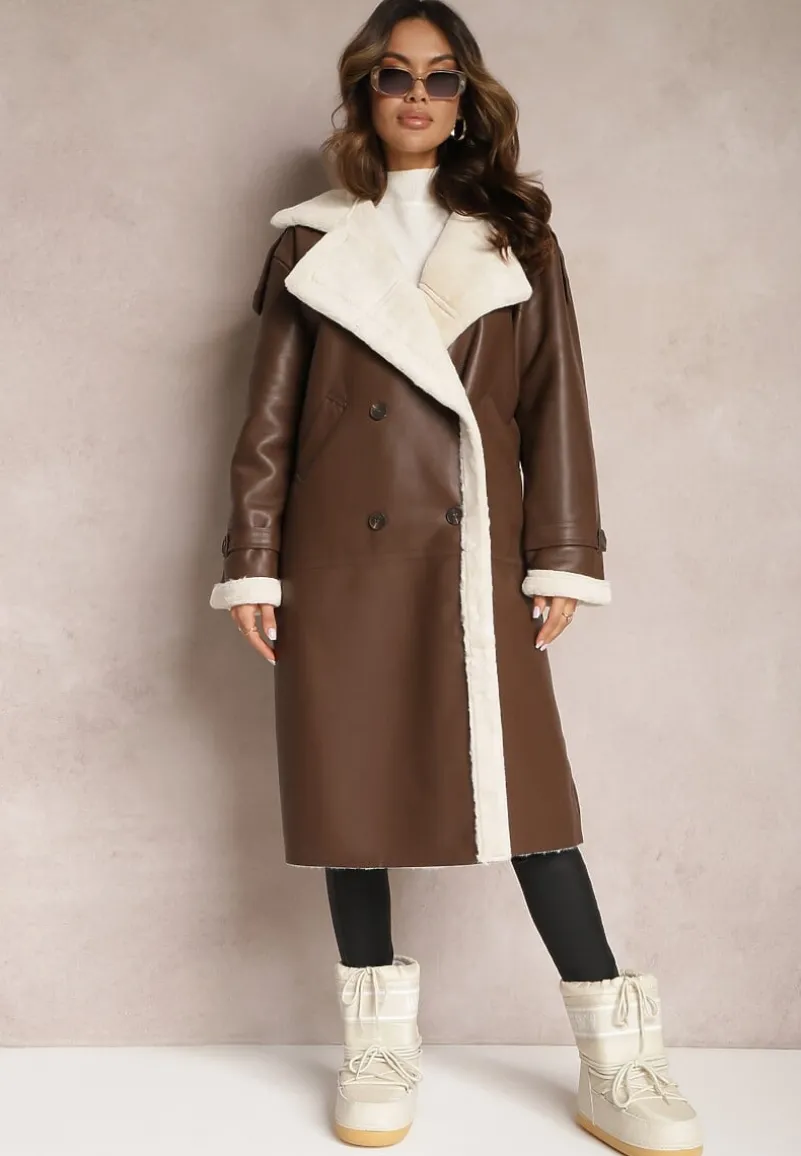 Płaszcz Vess dwurzędowy z linii oversize, wykonany z imitacji skóry. Kołnierz i końce rękawów zdobione sztucznym futerkiem. Zapinany na guziki, podszewka ze sztucznego futerka, wsuwane kieszenie. Długi płaszcz z ekoskóry z futerkiem to hit sezonu!