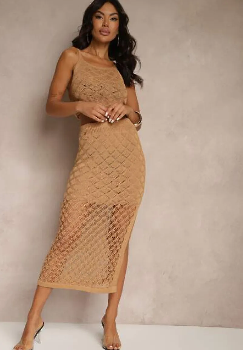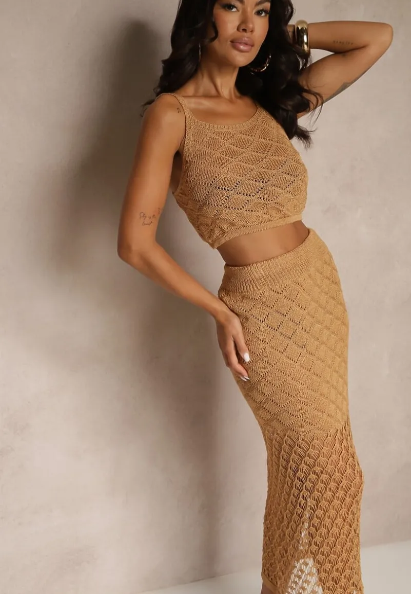 Odkryj wyjątkowy Dzianinowy Komplet Top na Ramiączkach i Spódnica z Siateczkowej Tkaniny Tiarienne. Jego wyjątkowy fason pięknie podkreśla sylwetkę, idealnie sprawdzając się w sezonie wiosenno-letnim. Zjawiskowy wzór z siateczki dodaje lekkości i nowoczesności, co czyni ten zestaw doskonałym wyborem zarówno na spotkanie z przyjaciółkami, jak i na formalne wyjście. Stylizuj go z sandałami na obcasie i delikatną torebką lub postaw na sneakersy i apaszkę, aby stworzyć niezapomniane looki na każdą okazję! Spódnica nie posiada podszewki, ma gumkę w talii.