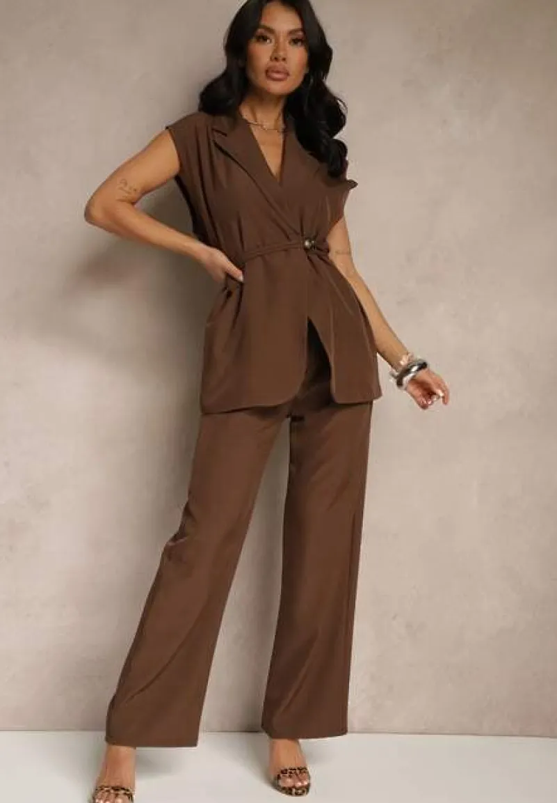 Stylowy garniturowy komplet Davielis z pewnością przyciągnie spojrzenia bez względu na okazję! Fason kamizelki z wiązaniem podkreśla talię, podczas gdy szerokie spodnie dodają swobodnego, a jednocześnie eleganckiego charakteru. To doskonały wybór zarówno do pracy, jak i na wieczorne wyjście. Połącz go z klasycznymi szpilkami i kopertówką, aby stworzyć wyjątkowy look na formalne okazje lub zestaw z białymi sneakersami i T-shirtem na co dzień — efekt wow gwarantowany! Kamizelka posiada zapięcie na guzik, spodnie wyróżniają się gumką w talii, wsuwanymi kieszeniami oraz zapięciem na suwak i guzik.