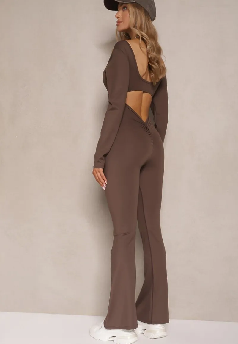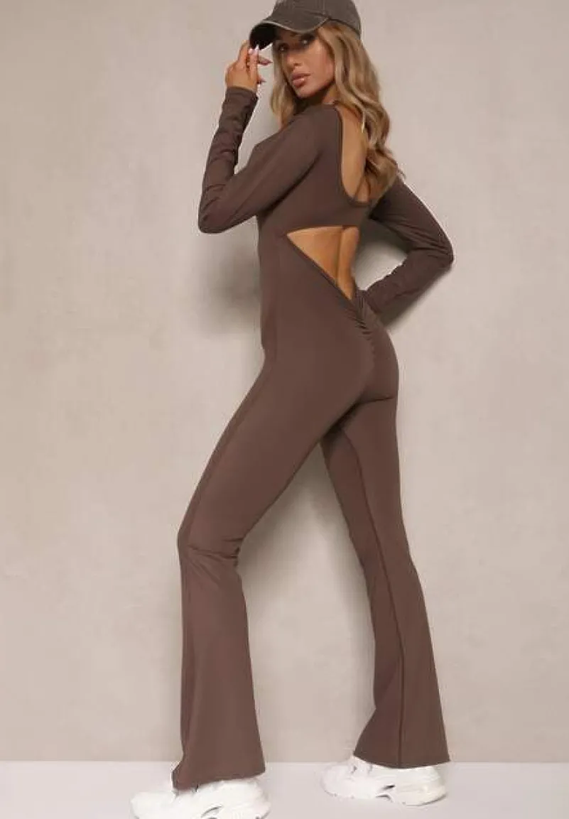 Brązowy Kombinezon Bodycon z Usztywnianymi Miseczkami i Wycięciami na Plecach Calinori