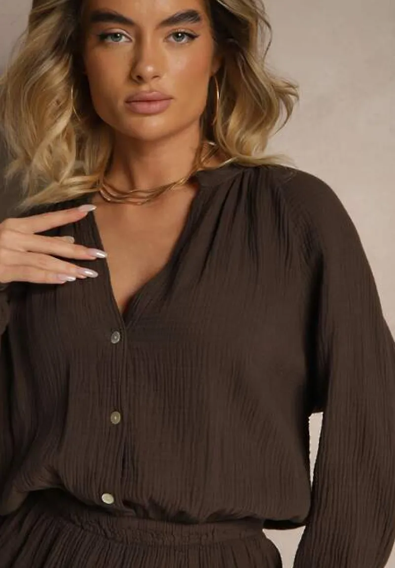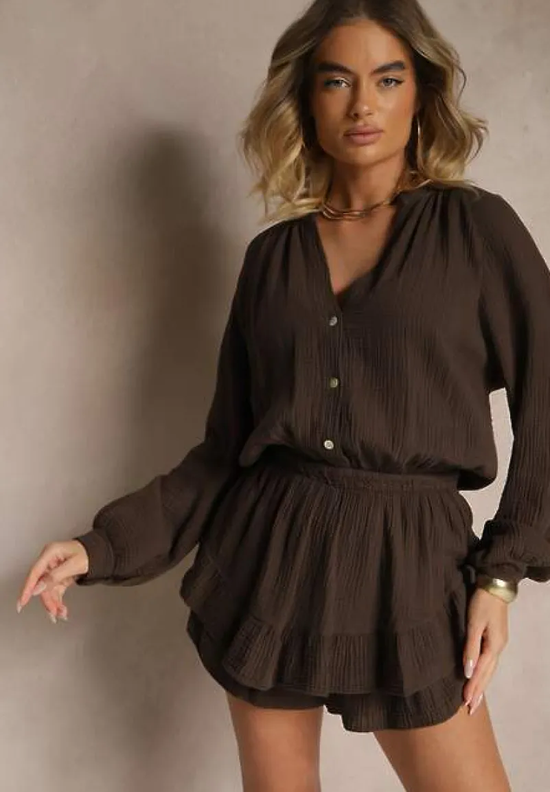 Brązowy Kombinezon z Bawełny ze Spódnico-Spodenkami i Guzikami oraz Gumką w Talii Vimatthea