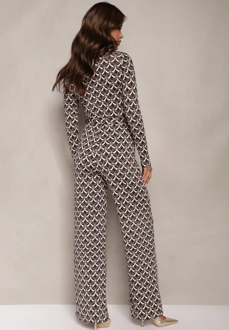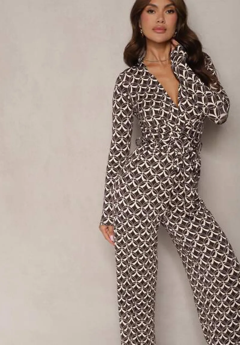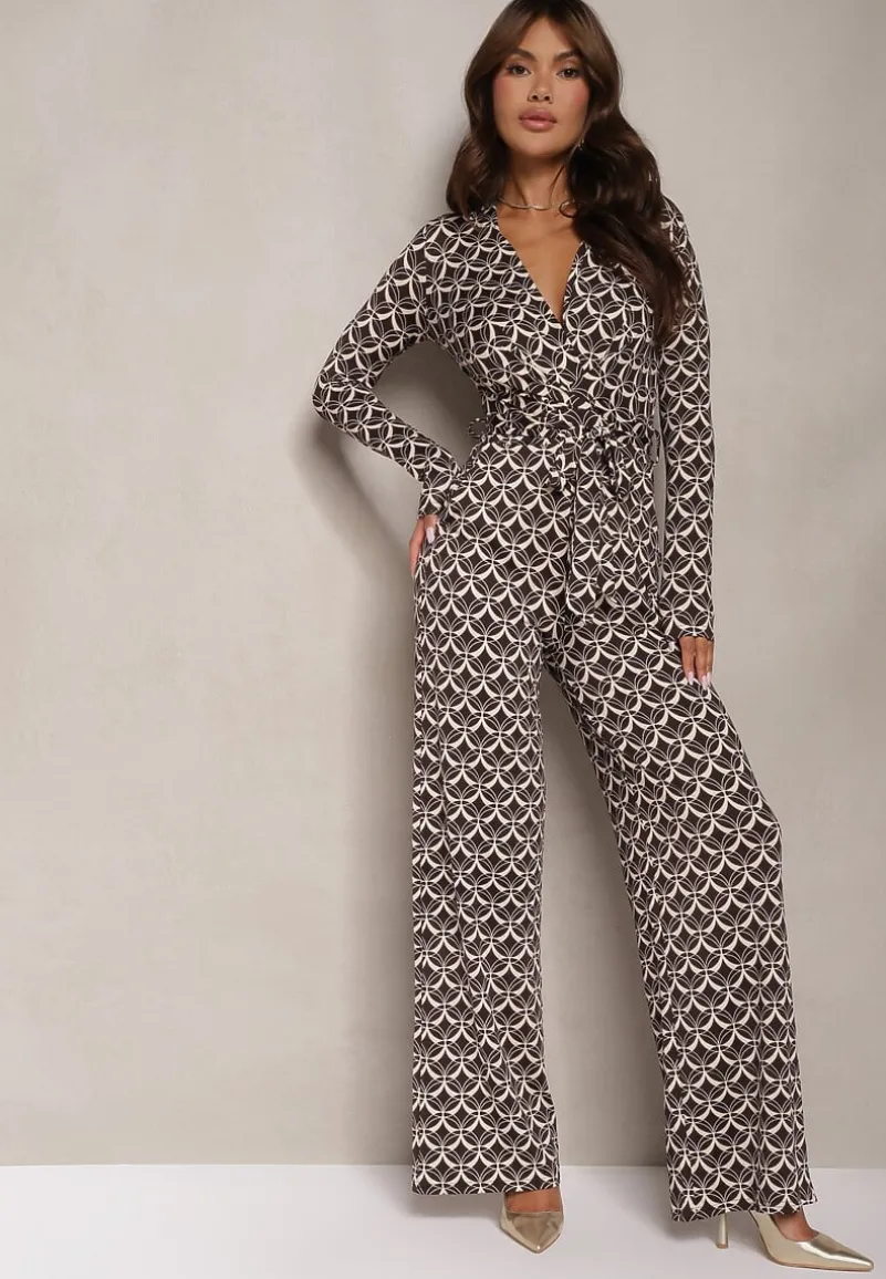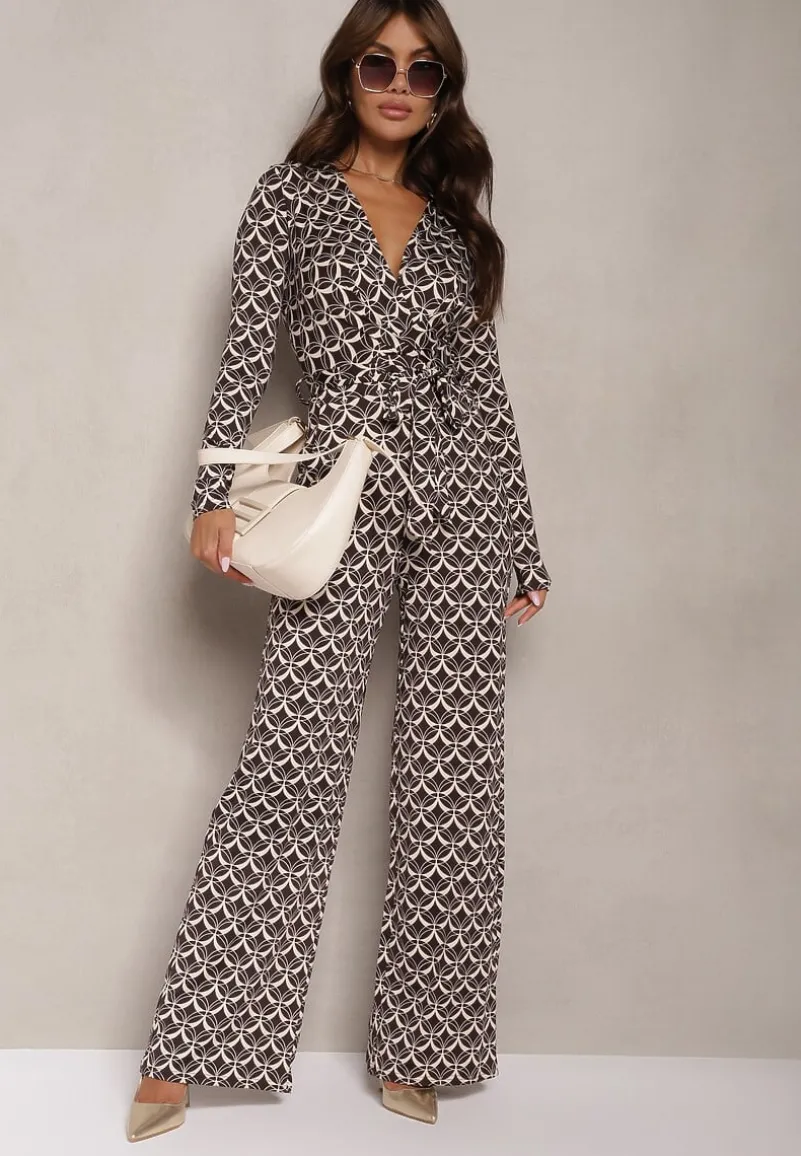 Brązowy Kombinezon z Mozaikowym Wzorem z Dekoltem w Serek i Paskiem Inafil