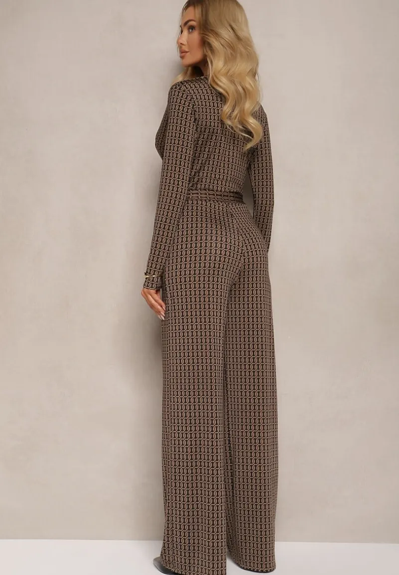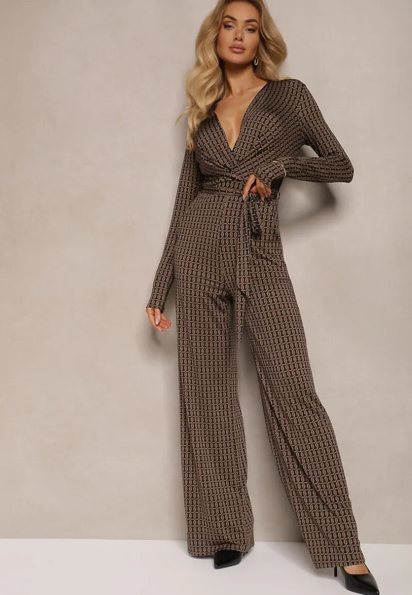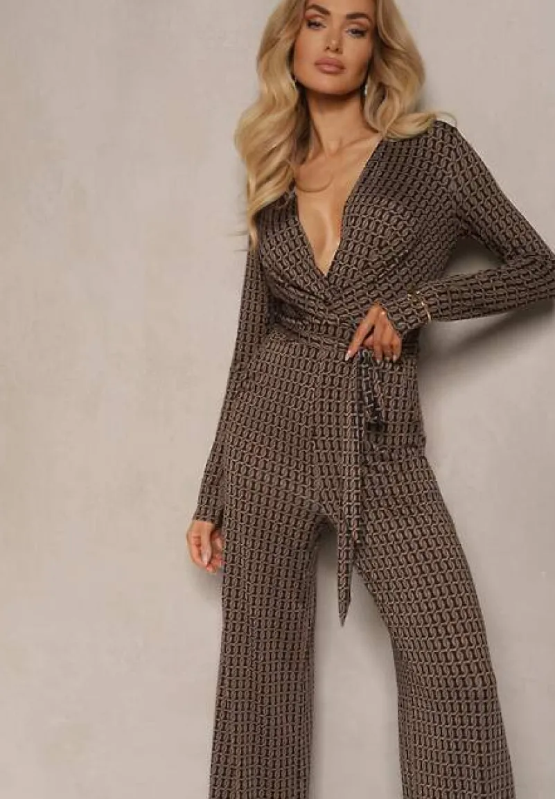 Brązowy Kombinezon z Wiskozą Kopertowym Dekoltem Ozdobiony Paskiem Altintinnia