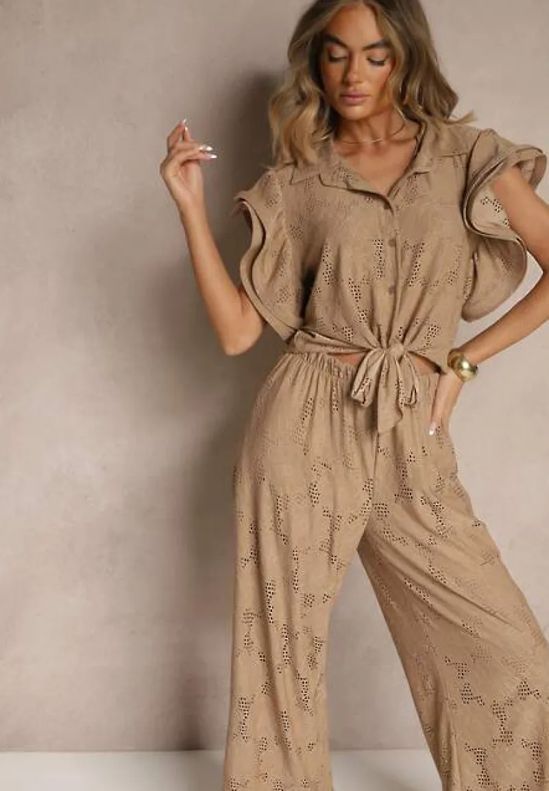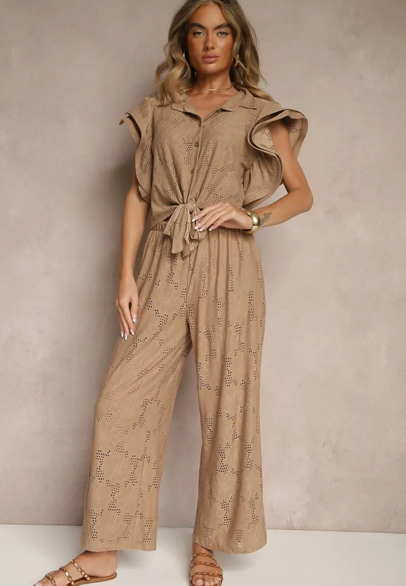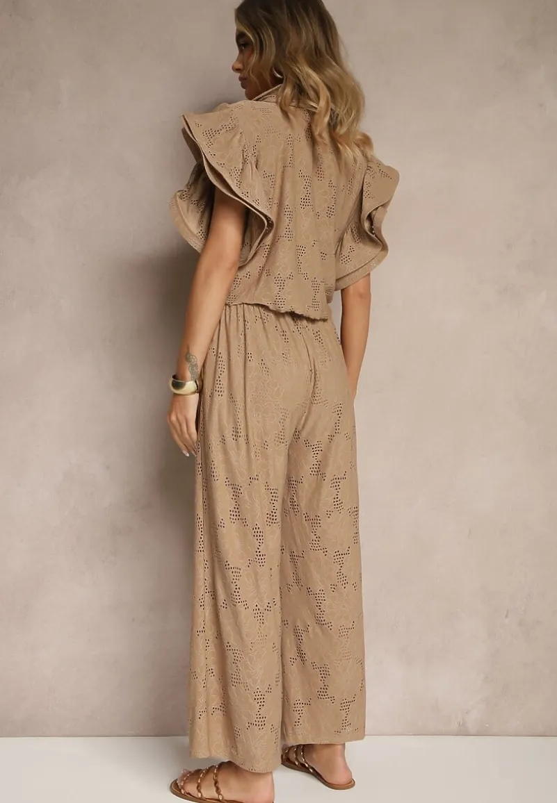 Odkryj stylowy komplet Ażurowy Linaniria, który stanowi kwintesencję najnowszych modowych trendów. Bluzka o koszulowym kroju z wiązaniem w pasie subtelnie podkreśla sylwetkę, a szerokie nogawki spodni zapewniają komfort i swobodę ruchów. Stylizując go z espadrylami i dużą torebką, stworzysz idealny zestaw na spotkanie z przyjaciółkami, a dodając szpilki i elegancką kopertówkę, stworzysz look doskonały na formalne spotkanie. Spodnie posiadają wsuwane kieszenie.